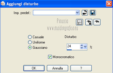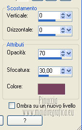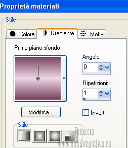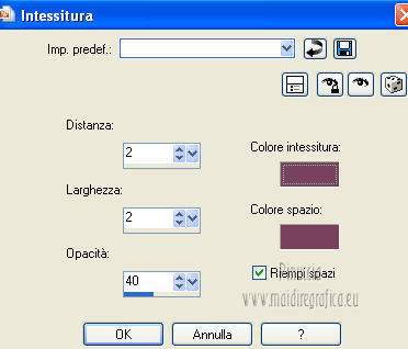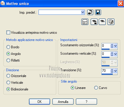 qui puoi trovare qualche risposta ai tuoi dubbi. Se l'argomento che ti interessa non è presente, ti prego di segnalarmelo. Questo tutorial è stato creato con PSP X2 e tradotto con CorelX, ma può essere eseguito anche con le altre versioni. Dalla versione X4, il comando Immagine>Rifletti è stato sostituito con Immagine>Capovolgi in orizzontale, e il comando Immagine>Capovolgi con Immagine>Capovolgi in verticale. Nelle versioni X5 e X6, le funzioni sono state migliorate rendendo disponibile il menu Oggetti. Con la versione X7 sono tornati i comandi Immagine>Rifletti e Immagine>Capovolgi, ma con nuove funzioni. Vedi la scheda sull'argomento qui Traduzione in francese qui Le vostre versioni qui Occorrente: Materiale qui Il tube usato è di Annelies. Il resto del materiale è di Corry. Filtri in caso di dubbi, ricorda di consultare la mia sezione filtri qui Filters Unlimited 2.0 qui &<BKG Kaleidoscope> (da importare in Unlimited) qui Mura's Meister - Perspective Tiling qui AFS Import - sqborder2 qui Alien Skin Eye Candy 5 Impact - Perspective Shadow qui Kiwi's Oelfilter - 3,5Promille qui I filtri AFS Import e Kiwi si possono usare da soli o importati in Filters Unlimited 2.0 Come fare vedi qui Animation Shop qui ![]() 1. Imposta il colore di primo piano con #78425d, e il colore di sfondo con #edd6e7. ![]() Passa il colore di primo piano a Gradiente, stile lineare. ![]() 2. Apri una nuova immagine trasparente 900 x 600 pixels, e riempila con il gradiente.3. Effetti>Plugins>Filters Unlimited 2.0 - &<Bkg Kaleidoscope> - @Blue Berry Pie. ![]() 4. Effetti>Plugins>Kiwi,s Oelfilter - 3,5 Promille. ![]() 5. Attiva lo strumento Selezione a mano libera , da punto a punto,e seleziona il triangolo a destra. ![]() 6. Effetti>Effetti di trama>Intessitura entrambi i colori impostati con il colore di primo piano #78425d. ![]() Selezione>Deseleziona. 7. Effetti>Plugins>Filters Unlimited 2.0 - AFS Import – sqborder 2. ![]() 8. Effetti>Effetti di immagine>Motivo unico. ![]() 9. Attiva lo strumento Selezione ,clicca sull'icona Selezione personalizzata ![]() e imposta i seguenti settaggi: ![]() Selezione>Innalza selezione a livello. 10. Effetti>Plugins>Mura's Meister - Perspective Tiling. ![]() Selezione>Deseleziona. 11. Apri il tube "deco tekst les 104" e vai a Modifica>Copia. Torna al tuo lavoro e vai a Modifica>Incolla come nuovo livello. Spostalo a destra,leggermente fuori dai bordi. ![]() 12. Livelli>Unisci>Unisci visibile. 13. Attiva nuovamente lo strumento Selezione a mano libera da punto a punto,e seleziona il piccolo triangolo a sinistra. ![]() Selezione>Innalza selezione a livello. Selezione>Deseleziona. 14. Effetti>Plugins>It@lian Editors Effect - Effetto Fantasma. ![]() 15. Effetti>Effetti di trama>Intessitura, con i settaggi precedenti. Livelli>Duplica. Immagine>Rifletti. 16. Apri il tube "deco lijn les 104" e vai a Modifica>Copia. Torna al tuo lavoro e vai a Modifica>Incolla come nuovo livello. Posiziona l'elemento in alto a sinistra.![]() Livelli>Duplica. Immagine>Rifletti. 17. Immagine>Aggiungi bordatura, 2 pixels, simmetriche, con il colore #78425d. Immagine>Aggiungi bordatura, 1 pixel, simmetriche, con il colore #ffffff. Immagine>Aggiungi bordatura, 2 pixels, simmetriche, con il colore #78425d. Selezione>Seleziona tutto. Immagine>Aggiungi bordatura, 28 pixels, simmetriche, con il colore #ffffff. 18. Effetti>Effetti 3D>Sfalsa ombra, con il colore #78425d. ![]() Selezione>Deseleziona. 19. Aggiungi il tuo nome e/o il tuo watermark su un nuovo livello. 20. Apri il tube "Alies 12VR30-woman-12012013" e vai a Modifica>Copia. Torna al tuo lavoro e vai a Modifica>Incolla come nuovo livello. Immagine>Ridimensiona, al 103%, tutti i livelli non selezionato. 21. Effetti>Plugins>Alien Skin Eye Candy 5 Impact- Perspective Shadow seleziona il preset Drop Shadow Blurry e ok. ![]() 22. Scrivi "Fashion" con il colore bianco di sfondo e un font a tua scelta, oppure apri il file di testo "wordart Fashion" e vai a Modifica>Copia. Torna al tuo lavoro e vai a Modifica>Incolla come nuovo livello. Posiziona il testo a destra.23. Immagine>Aggiungi bordatura, 1 pixel, simmetriche, con il colore #78425d. 24. Apri il tube paspop e vai a Modifica>Copia. Torna al tuo lavoro e vai a Modifica>Incolla come nuovo livello. Immagine>Ridimensiona, al 70%, tutti i livelli non selezionato. Spostalo a sinistra.Livelli>Duplica. Attiva il livello sottostante dell'originale. 25. Effetti>Plugins>Alien Skin Eye Candy 5 Impact - Perspective Shadow, seleziona il preset Short Perspective Shadow, in Back e ok. ![]() Abbassa l'opacità di questo livello al 71%. 26. Animazione. Attiva il livello superiore della copia. Attiva lo strumento Selezione a mano libera , da punto a punto,e traccia una selezione attorno al vestito del manichino. ![]() Regola>Aggiungi/Rimuovi disturbo>Aggiungi disturbo. ![]() Selezione>Deseleziona. Modifica>Copia Unione. Apri Animation Shop e vai a Modifica>Incolla>Incolla come nuova animazione. 27. Torna in PSP. Modifica>Annulla azione Deseleziona. Modifica>Annulla azione Aggiungi disturbo. Regola>Aggiungi/Rimuovi disturbo>Aggiungi disturbo, cambia il disturbo con 24 e ok. ![]() Selezione>Deseleziona. Modifica>Copia Unione. Torna in Animation Shop e vai a Modifica>Incolla>Incolla dopo il fotogramma corrente. 28. Di nuovo in PSP. Modifica>Annulla azione Deseleziona. Modifica>Annulla azione Aggiungi disturbo. Regola>Aggiungi/Rimuovi disturbo>Aggiungi disturbo, cambia il disturbo con 28 e ok. Selezione>Deseleziona. Modifica>Copia Unione. Torna in Animation Shop e vai a Modifica>Incolla>Incolla dopo il fotogramma corrente. 29. Animazione>Ridimensiona animazione - a 650 pixels, o come preferisci. Controlla il risultato cliccando su Visualizza e salva in formato gif.![]() Se hai problemi o dubbi, o trovi un link non funzionante, o anche soltanto per dirmi se questo tutorial ti è piaciuto, scrivimi. 5 Febbraio 2013 |