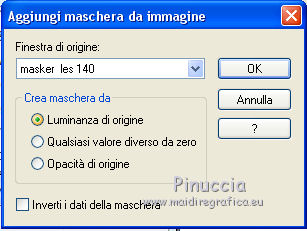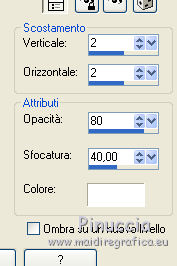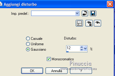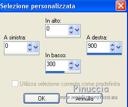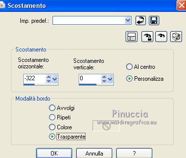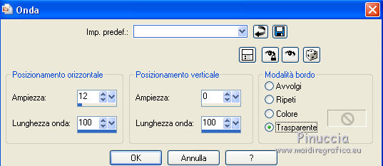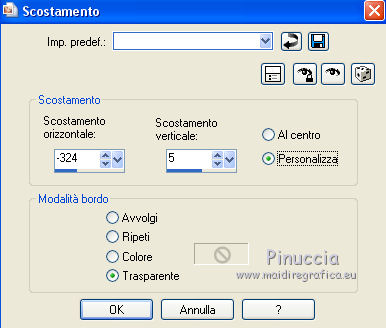 Occorrente: Materiale qui Tubes di Leny, Kahlan e Corry. Filtri in caso di dubbi, ricorda di consultare la mia sezione filtri qui Mehdi - Wavy Lab qui VanDerLee - Snowflakes qui Alien Skin Eye Candy 5 Impact - Perspective Shadow, Glass qui Alien Skin Eye Candy 5 Nature - Snow Drift qui ![]() Se utilizzi altri colori, non esitare a cambiare modalità di miscelatura e opacità dei livelli Apri la maschera in PSP e minimizzala con il resto del materiale. 1. Imposta il colore di primo piano con #26425f, e il colore di sfondo con il colore bianco #ffffff. ![]() 2. Apri una nuova immagine trasparente 900 x 550 pixels. 3. Effetti>Plugins>Mehdi - Wavy Lab (attenzione, è la versione con 3 colori). Questo filtro crea gradienti con i colori della paletta: il primo è il colore di sfondo, il secondo quello di primo piano. Mantieni il terzo colore creato dal filtro ![]() 4. Regola>Sfocatura>Sfocatura gaussiana - raggio 30. ![]() 5. Attiva lo strumento Selezione ![]() (non importa il tipo di selezione impostato, perchè con la selezione personalizzata si ottiene sempre un rettangolo) clicca sull'icona Selezione personalizzata ![]() e imposta i seguenti settaggi. ![]() 6. Livelli>Nuovo livello raster. Effetti>Plugins>VanDerLee - Snowflakes se stai usando la versione precedente, il risultato non cambia: Effetti>Plugins>Adrenaline - Snowflakes ![]() Abbassa l'opacità di questo livello al 75%. Selezione>Deseleziona. (Se hai problemi con il filtro, copia/incolla come nuovo livello il tube fornito - Snowfall). 7. Apri il tube Leny winter, cancella il watermark e vai a Modifica>Copia. Torna al tuo lavoro e vai a Modifica>Incolla come nuovo livello. Spostalo a destra.8. Livelli>Nuovo livello raster. Riempi il livello con il colore bianco di sfondo #ffffff.Livelli>Nuovo livello maschera>Da immagine. Apri il menu sotto la finestra di origine e vedrai la lista dei files aperti. Seleziona la maschera Masker les 140. ![]() Livelli>Unisci>Unisci gruppo. 9. Apri il tube Hrwjs winter, cancella il watermark e vai a Modifica>Copia. Torna al tuo lavoro e vai a Modifica>Incolla come nuovo livello. Immagine>Ridimensiona, al 90%, tutti i livelli non selezionato. Spostalo a sinistra.Cambia la modalità di miscelatura di questo livello in Moltiplica. ![]() 10. Modifica>Copia Unione. Modifica>Incolla come nuova immagine e continua su questa immagine. Immagine>Ridimensiona, al 20%, tutti i livelli selezionato. 11. Effetti>Plugins>Alien Skin Eye Candy 5 Impact - Glass. Seleziona il preset Clear e ok. ![]() 12. Immagine>Aggiungi bordatura, 20 pixels, simmetriche, colore bianco #ffffff. Immagine>Ridimensiona, al 60%, tutti i livelli selezionato. 13. Modifica>Copia e minimizza l'immagine che ti servirà ancora. 14. Torna al tuo lavoro e vai a Modifica>Incolla come nuovo livello. Effetti>Effetti di immagine>Scostamento. ![]() 15. Effetti>Plugins>Alien Skin Eye Candy 5 Impact - Perspective Shadow. Seleziona il preset Drop Shadow Blurry e ok. ![]() 16. Apri il tube element e vai a Modifica>Copia. Torna al tuo lavoro e vai a Modifica>Incolla come nuovo livello. Cambia la modalità di miscelatura di questo livello in Filtra. Effetti>Effetti di immagine>Scostamento. ![]() 17. Apri il tube tekst les 140 e vai a Modifica>Copia. Torna al tuo lavoro e vai a Modifica>Incolla come nuovo livello. Spostalo a sinistra, come nel mio esempio.![]() 18. Apri element 2 e vai a Modifica>Copia. Torna al tuo lavoro e vai a Modifica>Incolla come nuovo livello. Cambia la modalità di miscelatura di questo livello in Filtra. 19. Effetti>Effetti di distorsione>Onda. ![]() 20. Effetti>Effetti di immagine>Scostamento. ![]() Abbassa l'opacità di questo livello all'80%. 21. Apri il tube bomen, cancella il watermark, e vai a Modifica>Copia. Torna al tuo lavoro e vai a Modifica>Incolla come nuovo livello. Spostalo in basso.Effetti>Plugins>Alien Skin Eye Candy 5 Nature - Snow Drift. Seleziona il preset Dusting Light e ok. ![]() 22. Apri il tube rendier e vai a Modifica>Copia. Torna al tuo lavoro e vai a Modifica>Incolla come nuovo livello. Spostalo in basso a destra.![]() 23. Immagine>Aggiungi bordatura, 1 pixel, simmetriche, colore di primo piano #26425f. Immagine>Aggiungi bordatura, 2 pixels, simmetriche, #ffffff. Selezione>Seleziona tutto. Immagine>Aggiungi bordatura, 40 pixels, simmetriche, colore di primo piano #26425f. 24. Selezione>Inverti. Regola>Aggiungi/Rimuovi disturbo>Aggiungi disturbo. ![]() 25. Selezione>Inverti. Effetti>Effetti 3D>Sfalsa ombra, colore bianco #ffffff. ![]() Selezione>Deseleziona. 26. Apri il tube snow-icerand e vai a Modifica>Copia. Torna al tuo lavoro e vai a Modifica>Incolla come nuovo livello. Spostalo sul bordo in alto.27. Attiva la piccola immagine del punto 13. Modifica>Copia. Torna al tuo lavoro e vai a Modifica>Incolla come nuovo livello. Immagine>Ridimensiona, al 30%, tutti i livelli non selezionato. Spostala sul bordo a destra.28. Effetti>Plugins>Alien Skin Eye Candy 5 Impact - Perspective Shadow. Preset Drop Shadow Blurry e Shadow color #ffffff. ![]() Livelli>Duplica - 2 volte, e posiziona le immagini sotto l'originale.![]() 29. Firma il tuo lavoro su un nuovo livello. 30. Immagine>Aggiungi bordatura, 1 pixel, simmetriche, colore di primo piano #26425f. 31. Immagine>Ridimensiona, 900 pixels di larghezza, o come preferisci, tutti i livelli selezionato. Salva in formato jpg. I tubes di questo esempio sono di Karine e Jring's ![]() ![]() Puoi scrivermi per qualsiasi problema, o dubbio se trovi un link che non funziona, o anche soltanto per dirmi se questo tutorial ti è piaciuto. 1 Dicembre 2017 |