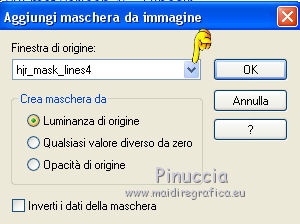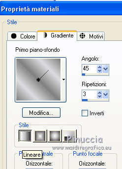 Occorrente: Materiale qui Tubes di Katrina, Corry, Reveries, Joni. Filtri in caso di dubbi, ricorda di consultare la mia sezione filtri qui Unplugged Tools - Spotlight qui Graphics Plus - Cross Shadow qui Animation Shop qui ![]() Se utilizzi altri colori, non esitare a cambiare modalità di miscelatura e opacità dei livelli Nelle ultime versioni di PSP non c'è il gradiente di primo piano/sfondo (Corel_06_029) Puoi usare i gradienti delle versioni precedenti. Trovi qui i gradienti Corel X. Apri la maschera in PSP e minimizzala con il resto del materiale. 1. Imposta il colore di primo piano con #7a7f83, e il colore di sfondo con #dddddf. ![]() 2. Apri una nuova immagine trasparente 650 x 500 pixels, e riempila con il colore di primo piano #7a7f83.Passa il colore di primo piano a Gradiente di primo piano/sfondo, stile Lineare. ![]() 3. Livelli>Nuovo livello raster. Selezione>Seleziona tutto. Apri il tube achtergrondje les 55 e vai a Modifica>Copia. Torna al tuo lavoro e vai a Modifica>Incolla nella selezione. Selezione>Deseleziona. Cambia la modalità di miscelatura di questo livello in Luminanza (esistente). 5. Apri il tube 122882468 payages e vai a Modifica>Copia. Torna al tuo lavoro e vai a Modifica>Incolla come nuovo livello. Sposta il tube a sinistra.Tasto K per attivare lo strumento Puntatore ![]() se stai usando PSP 9 tasto D per attivare lo strumento Deformazione ![]() e tira il tube un po' più in alto. Cambia la modalità di miscelatura di questo livello in Luminanza (esistente). ![]() 6. Apri il tube 12286689950 animaux, e vai a Modifica>Copia. Torna al tuo lavoro e vai a Modifica>Incolla come nuovo livello. Immagine>Ridimensiona, al 120%, tutti i livelli non selezionato. Sposta il tube a destra.Tasto K/D per attivare lo strumento Puntatore /Deformazione ![]() e tira il tube un po' più in alto. Cambia la modalità di miscelatura di questo livello in Luminanza (esistente). ![]() 7. Immagine>Aggiungi bordatura, 1 pixels, simmetriche, colore di sfondo #dddddf. Immagine>Aggiungi bordatura, 3 pixels, simmetriche, colore #5b0000. Immagine>Aggiungi bordatura, 1 pixels, simmetriche, colore di sfondo #dddddf. Immagine>Aggiungi bordatura, 12 pixels, simmetriche, con un colore qualsiasi. Attiva lo strumento Bacchetta magica ![]() e clicca nell'ultimo bordo per selezionarlo. Riempi la selezione con il gradiente.Effetti>Plugins>Graphics Plus - Cross Shadow. ![]() Selezione>Deseleziona. . Immagine>Aggiungi bordatura, 1 pixels, simmetriche, colore di sfondo #dddddf. Immagine>Aggiungi bordatura, 3 pixels, simmetriche, colore #5b0000. Immagine>Aggiungi bordatura, 1 pixels, simmetriche, colore di sfondo #dddddf. 8. Selezione>Seleziona tutto. Selezione>Modifica>Contrai - 22 pixels. Livelli>Nuovo livello raster. Riempi la selezione con il gradiente.9. Livelli>Nuovo livello maschera>Da immagine. Apri il menu sotto la finestra di origine e vedrai la lista dei files aperti. Seleziona la maschera hjr_mask_lines4. ![]() Effetti>Effetti di bordo>Aumenta. Livelli>Unisci>Unisci gruppo. Selezione>Deseleziona. 10. Apri il tube di Joni delle giraffe e vai a Modifica>Copia. Torna al tuo lavoro e vai a Modifica>Incolla come nuovo livello. Immagine>Ridimensiona, 1 volta all'80% e una volta al 90%, tutti i livelli non selezionato. Sposta il tube a destra.Effetti>Effetti 3D>Sfalsa ombra. ![]() 11. Apri il tube DBK model e vai a Modifica>Copia. Torna al tuo lavoro e vai a Modifica>Incolla come nuovo livello. Immagine>Ridimensiona, 1 volta al 70% e una volta all'80%, tutti i livelli non selezionato. Sposta il tube a sinistra.12. Firma il tuo lavoro su un nuovo livello. ANIMAZIONE 13. Attiva il livello della maschera. 14. Effetti>Plugins>Unplugged Tools - Spotlight. ![]() Modifica>Copia Unione. Apri Animation Shp e vai a Modifica>Incolla>Incolla come nuova animazione. 15. Torna in PSP. Modifica>Annulla azione Spotlight. Effetti>Plugins>Unplugged Tools - Hilight a 200 e ok. ![]() Modifica>Copia Unione. Torna in Animation Shop e vai a Modifica>Incolla>Incolla dopo il fotogramma corrente. 16. Di nuovo in PSP. Modifica>Annulla azione Spotlight. Effetti>Plugins>Unplugged Tools - Hilight a 150 e ok. ![]() Modifica>Copia Unione. Torna in Animation Shop e vai a Modifica>Incolla>Incolla dopo il fotogramma corrente. 17. Selezione>Seleziona tutto. Animazione>Proprietà fotogramma e imposta la velocità a 60. ![]() 18. Animazione>Ridimensiona, 650 pixels o come preferisci. Controlla il risultato cliccando su Visualizza e salva in formato gif.![]() Puoi scrivermi per qualsiasi problema, o dubbio se trovi un link che non funziona, o anche soltanto per dirmi se questo tutorial ti è piaciuto. 12 Giugno 2017 |