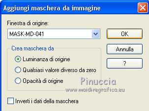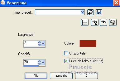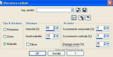 Occorrente: Materiale qui Per il tube grazie Animabelle. Il resto del materiale è di Corry. (in questa pagina trovi i links ai siti dei creatori di tubes) Filtri in caso di dubbi, ricorda di consultare la mia sezione filtri qui Filters Unlimited 2.0 qui AP Lines - Lines SilverLining qui Alien Skin Eye Candy 5 Impact - Perspective Shadow, Glass qui Mehdi - Wavy Lab qui Filter Factory Gallery A - Triangular Mosaic Filter ici I filtri Factory Gallery si possono usare da soli o importati in Filters Unlimited (come fare vedi qui) Se un filtro fornito appare con questa icona ![]() Se utilizzi altri colori, non esitare a cambiare modalità di miscelatura e opacità dei livelli Apri la maschera in PSP e minimizzala con il resto del materiale. 1. Imposta il colore di primo piano con #962310, e il colore di sfondo con il colore bianco #ffffff. ![]() 2. Apri les144_Alfakanaal. Finestra>Duplica, o sulla tastiera maiuscola+D per fare una copia. Chiudi l'originale. La copia, che sarà la base del tuo lavoro, non è vuota, ma contiene le selezioni salvate sul canale alfa. (nel materiale trovi anche le due selezioni usate per il canale alfa). 3. Effetti>Plugins>Mehdi - Wavy Lab Questo filtro crea gradienti con i colori della tua paletta: il primo è il colore di sfondo, il secondo quello di primo piano. Mantieni il terzo colore creato dal filtro (#ca9187). ![]() 4. Regola>Sfocatura>Sfocatura gaussiana - raggio 10. ![]() 5. Effetti>Plugins>Filters Unlimited 2.0 - Filter Factory Gallery A - Triangular Mosaic Filter. ![]() 6. Regola>Sfocatura>Sfocatura radiale. ![]() 7. Livelli>Duplica. Immagine>Capovolgi. 8. Cambia la modalità di miscelatura di questo livello in Luce diffusa. 9. Selezione>Carica/Salva selezione>Carica selezione da canale alfa. La selezione Selectie1 è subito disponibile. Devi soltanto cliccare Carica. ![]() 10. Effetti>Plugins>AP Lines - Lines SilverLining. ![]() Selezione>Deseleziona. 11. Modifica>Copia Speciale>Copia Unione. 12. Livelli>Nuovo livello raster. Riempi con il colore di sfondo #ffffff.13. Livelli>Nuovo livello maschera>Da immagine. Apri il menu sotto la finestra di origine e vedrai la lista dei files aperti. Seleziona la maschera Md 041 ![]() Livelli>Unisci>Unisci gruppo. 14. Abbassa l'opacità di questo livello al 60%. 15. Livelli>Nuovo livello raster. Selezione>Carica/Salva selezione>Carica selezione da canale alfa. Apri il menu delle selezioni e carica selectie#2. ![]() 16. Abbassa l'opacità dello strumento Riempimento a 36 e riempi la selezione con il colore bianco.![]() ![]() (non dimenticare di riportare l'opacità a 100) 17. Selezione>Modifica>Contrai - 22 pixels. Premi sulla tastiera il tasto CANC ![]() Modifica>Incolla nella selezione (l'immagine copiata al punto 11) ![]() 18. Effetti>Plugins>Alien Skin Eye Candy 5 Impact - Glass Seleziona il preset Clear e ok. ![]() Selezione>Deseleziona. 19. Apri element n.1. e vai a Modifica>Copia. Torna al tuo lavoro e vai a Modifica>Incolla come nuovo livello. Spostalo contro il bordo a destra.![]() 20. Attiva il livello sottostante del cerchio. Livelli>Duplica. Immagine>Ridimensiona, al 30%, tutti i livelli non selezionato. Livelli>Disponi>Porta in alto. Sposta la sfera sull'elemento a destra.Livelli>Duplica e sposta questo livello in basso![]() 21. Apri l'elemento nr2 e vai a Modifica>Copia. Torna al tuo lavoro e vai a Modifica>Incolla come nuovo livello. Spostalo in basso a sinistra.![]() 22. Effetti>Effetti di trama>Veneziana - colore di primo piano #962310. ![]() 23. Apri il testo "tekst" e vai a Modifica>Copia. Torna al tuo lavoro e vai a Modifica>Incolla come nuovo livello. Spostalo sopra la sfera al centro.![]() 24. Apri tak les 144 e vai a Modifica>Copia. Torna al tuo lavoro e vai a Modifica>Incolla come nuovo livello. Spostalo in alto a sinistra.![]() 25. Effetti>Plugins>Alien Skin Eye Candy 5 Impact - Perspective Shadow. Seleziona il preset Drop Shadow blurry e ok. ![]() 26. Apri il tube della donna, cancella il watermark, e vai a Modifica>Copia. Torna al tuo lavoro e vai a Modifica>Incolla come nuovo livello. Immagine>Ridimensiona, 1 volta all'80% e 1 volta al 75%, tutti i livelli non selezionato. Sposta il tube un po' più a destra.27. Immagine>Aggiungi bordatura, 1 pixel, simmetriche, #962310. Immagine>Aggiungi bordatura, 2 pixels, simmetriche, #ffffff. Immagine>Aggiungi bordatura, 1 pixel, simmetriche, #962310. Immagine>Aggiungi bordatura, 22 pixels, simmetriche, #ffffff. Immagine>Aggiungi bordatura, 1 pixel, simmetriche, #962310. Selezione>Seleziona tutto. Immagine>Aggiungi bordatura, 30 pixels, simmetriche, #ffffff. Effetti>Effetti 3D>Sfalsa ombra, colore di primo piano #962310. ![]() Selezione>Deseleziona. 28. Apri il tube "bird" e vai a Modifica>Copia. Torna al tuo lavoro e vai a Modifica>Incolla come nuovo livello. Immagine>Ridimensiona, all'80%, tutti i livelli non selezionato. Spostalo nell'angolo in basso a sinistra.29. Effetti>Plugins>Alien Skin Eye Candy 5 Impact - Perspective Shadow, preset Drop Shadow Blurry. 30. Immagine>Aggiungi bordatura, 1 pixel, simmetriche, #962310. 31. Firma il tuo lavoro su un nuovo livello. Livelli>Unisci>Unisci tutto. Ridimensiona, se vuoi, e salva in formato jpg. Il tube di questo esempio è di Libellule. ![]() ![]() Puoi scrivermi per qualsiasi problema, o dubbio se trovi un link che non funziona, o anche soltanto per dirmi se questo tutorial ti è piaciuto. 23 Ottobre 2018 |