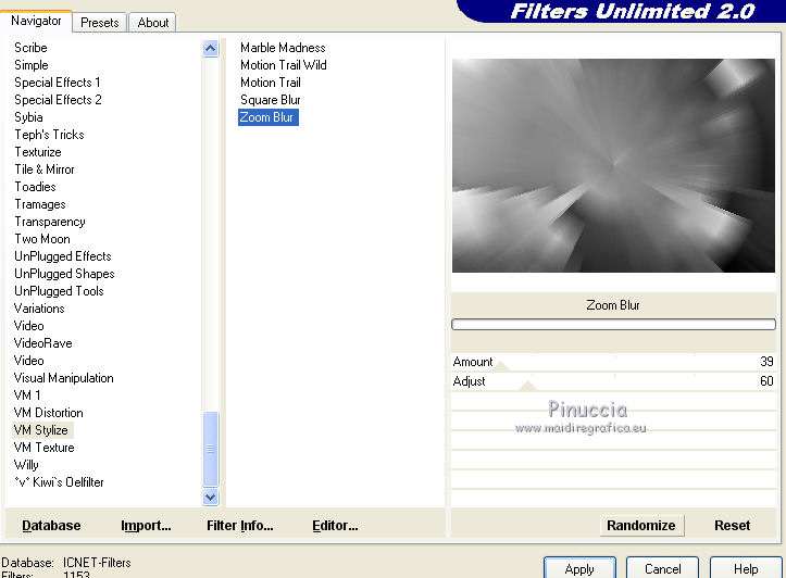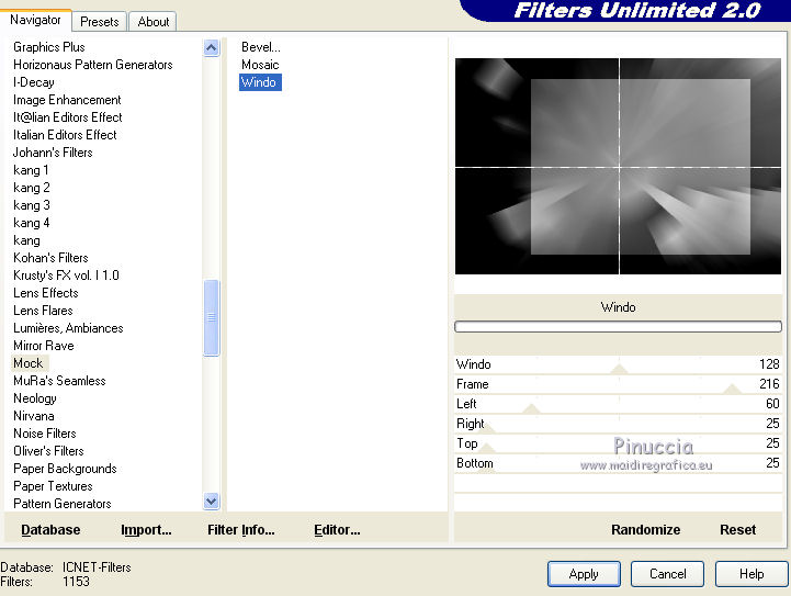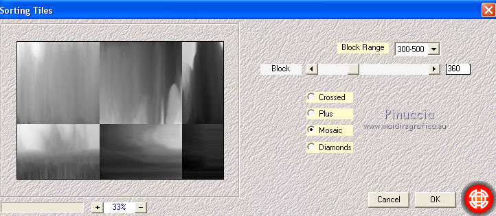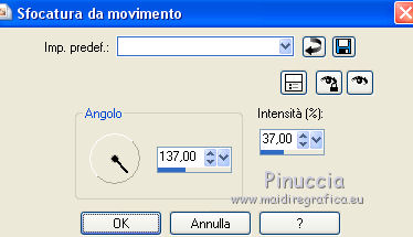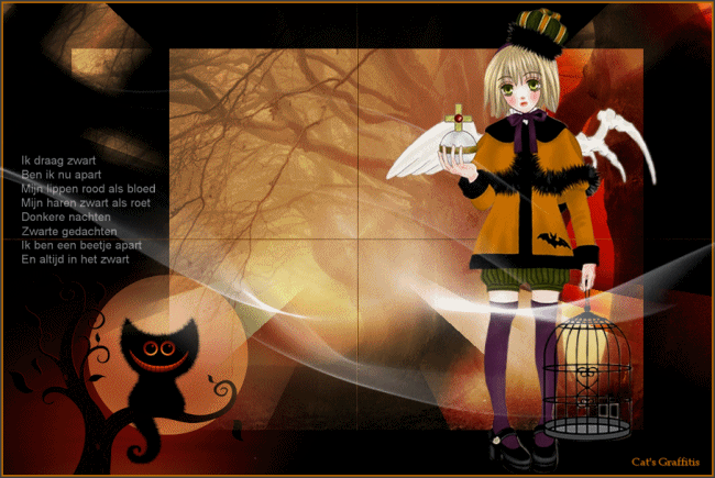 Occorrente: Materiale rar Tubes di Corry e Joanie. Il © appartiene all'artista originale. Mantieni il credito di chi ha creato il tube. Filtri in caso di dubbi, ricorda di consultare la mia sezione filtri qui Filters Unlimited 2.0 qui Mehdi - Sorting Tiles qui VM Stylize - Zoom blur qui Mock - Windo qui I filtri VM Stylize e Mocks si possono usare da soli o importati in Filters Unlimited (come fare vedi qui) Se un filtro fornito appare con questa icona Animation Shop qui ![]() Apri la maschera in PSP e minimizzala con il resto del materiale. 1. Imposta il colore di primo piano con #404040, e il colore di sfondo con il colore nero #000000. 2. Apri una nuova immagine trasparente 900 x 600 pixels, e riempila con il colore di primo piano #404040.3. Apri l'immagine di sfondo "achtergrond les 119" e vai a Modifica>Copia. Torna al tuo lavoro e vai a Modifica>Incolla come nuovo livello. 4. Regola>Sfocatura>Sfocatura da movimento. ![]() 5. Effetti>Plugins>Mehdi - Sorting Tiles. ![]() 6. Effetti>Plugins>Filters Unlimited 2.0 - VM Stylize - Zoom blur. ![]() 7. Immagine>Rifletti. 8. Effetti>Plugins>Filters Unlimited 2.0 - Mocks - Windo. ![]() 9. Livelli>Duplica. Immagine>Rifletti. Cambia la modalità di miscelatura di questo livello in Sovrapponi. 10. Attiva lo strumento Pennello , rotondo (settaggi a scelta),e applicalo sulla linea grigia. ![]() 11. Modifica>Incolla come nuovo livello (l'immagine di sfondo "achtergrond les 119" dovrebbe essere ancora in memoria). Cambia la modalità di miscelatura di questo livello in Sovrapponi. 12. Apri il tube Cat, e vai a Modifica>Copia. Torna al tuo lavoro e vai a Modifica>Incolla come nuovo livello. Immagine>Ridimensiona, al 45%, tutti i livelli non selezionato. Spostalo in basso a sinistra.13. Apri il tube Black Lady e vai a Modifica>Copia. Torna al tuo lavoro e vai a Modifica>Incolla come nuovo livello. Spostalo a destra.14. Apri tekst, e vai a Modifica>Copia. Torna al tuo lavoro e vai a Modifica>Incolla come nuovo livello. Spostalo a sinistra.![]() Abbassa l'opacità di questo livello al 50%. 15. Firma il tuo lavoro su un nuovo livello. 16. Immagine>Aggiungi bordatura, 2 pixels, simmetriche, colore di primo piano #404040. Immagine>Aggiungi bordatura, 2 pixels, simmetriche, con il color4 nero di sfondo #000000. 17. Imposta il colore di prmo piano con il colore bianco #ffffff. 18. Livelli>Nuovo livello raster. Riempi con il colore bianco #ffffff.Livelli>Nuovo livello maschera>Da immagine. Apri il menu sotto la finestra di origine e vedrai la lista dei files aperti. Carica la maschera MD 089, con i seguenti settaggi. ![]() Livelli>Unisci>Unisci gruppo. 19. Modifica>Copia Unione. Apri Animation Shop e vai a Modifica>Incolla>Incolla come nuova animazione. 20. Torna in PSP. Abbassa l'opacità del livello della maschera all'80%. Modifica>Copia Unione. 21. Torna in Animation Shop e vai a Modifica>Incolla>Incolla dopo il fotogramma corrente. 22. Clicca sul primo fotogramma per selezionarlo. Animazione>Proprietà fotogramma e imposta la velocità a 120. 23. Clicca sul secondo fotogramma per selezionarlo. Animazione>Proprietà fotogramma e imposta la velocità a 30. ![]() 24. Animazione>Ridimensiona animazione - à 650 pixels di larghezza (o come preferisci). Controlla il risultato cliccando su Visualizza e salva in formato gif.![]() Le vostre versioni. Grazie ![]() Cat's Graffiti ![]() Se hai problemi o dubbi, o trovi un link non funzionante, o anche soltanto per dirmi se questo tutorial ti è piaciuto, scrivimi. 20 Ottobre 2014 |
