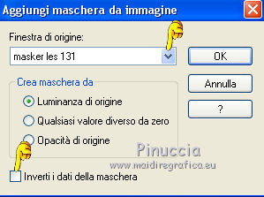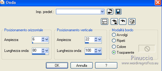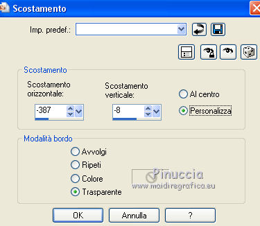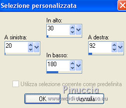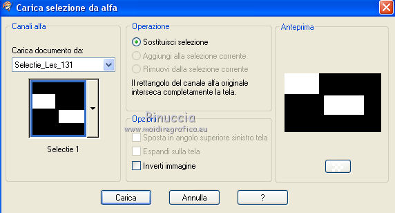 Occorrente: Materiale qui Tube – LB –Nikita Deco – Design Corry Filtri in caso di dubbi, ricorda di consultare la mia sezione filtri qui Alien Skin Eye Candy 5 Impact - Perspective Shadow, Glass qui VanDerLee - Unplugged-X qui Vanderlee Snowflakes qui Ap Lines - Lines SilverLining qui Mehdi - Weaver qui Flaming Pear - Flood qui ![]() Se utilizzi altri colori, non esitare a cambiare modalità di miscelatura e opacità dei livelli Metti il preset Cliccando sul file una o due volte (a seconda delle tue impostazioni), automaticamente il preset si installerà nella cartella corretta. perchè uno o due clic vedi qui Apri le maschere in PSP e minimizzale con il resto del materiale. 1. Imposta il colore di primo piano con #ffffff, e il colore di sfondo con #640712. Passa il colore di primo piano a Gradiente di primo piano/sfondo, stile Rettangolare. ![]() 2. Apri una nuova immagine trasparente 900 x 550 pixels, e riempila con il gradiente.3. Regola>Sfocatura>Sfocatura gaussiana - raggio 18. ![]() 4. Livelli>Nuovo livello raster. Selezione>Seleziona tutto. Apri il tube dei fiori, cancella il watermark, e vai a Modifica>Copia. minimizza il tube che ti servirà ancora Torna al tuo lavoro e vai a Modifica>Incolla nella selezione. Selezione>Deseleziona. 5. Livelli>Unisci>Unisci giù. 6. Se non lo hai fatto prima di iniziare, apri la selezione Selectie les 131 e minimizzala (l'immagine contiene una selezione salvata sul canale alfa). Torna al tuo lavoro. Selezione>Carica/Salva selezione>Carica selezione da canale alfa. La selezione selectie 1 è subito disponibile. Devi soltanto cliccare Carica. ![]() Selezione>Innalza selezione a livello. Selezione>Deseleziona. 7. Effetti>Plugins>Mehdi - Weaver. ![]() 8. Effetti>Effetti di distorsione>Onda. ![]() 9. Livelli>Duplica. Livelli>Nuovo livello maschera>Da immagine. Apri il menu sotto la finestra di origine e vedrai la lista dei files aperti. Seleziona la maschera 20.20, inverti i dati della maschera selezionato. ![]() Livelli>Unisci>Unisci gruppo. 10. Effetti>Plugins>AP Lines - Lines SilverLining. ![]() Abbassa l'opacità di questo livello al 60%. 11. Attiva il livello Selezione innalzata. ![]() Effetti>Plugins>Flaming Pear - Flood. ![]() 12. Attiva nuovamente il livello superiore. Livelli>Nuovo livello raster. Riporta il colore di primo piano a colore, e riempi il livello con il colore bianco #ffffff.13. Livelli>Nuovo livello maschera>Da immagine. Apri il menu sotto la finestra di origine e vedrai la lista dei files aperti. Seleziona la maschera masker les 131, inverti i dati della maschera non selezionato. ![]() Livelli>Unisci>Unisci gruppo. 14. Effetti>Effetti di immagine>Scostamento. ![]() Abbassa l'opacità di questo livello all'80%. 15. Attiva nuovamente il tube dei fiori e vai a Modifica>Copia. Torna al tuo lavoro e vai a Modifica>Incolla come nuovo livello. Immagine>Ridimensiona, al 50%, tutti i livelli non selezionato. 16. Effetti>Effetti di immagine>Scostamento. ![]() 17. Livelli>Duplica. Livelli>Unisci>Unisci giù. 18. Effetti>Plugins>Flaming Pear - Flood - Horizon a 78 e ok. ![]() 19. Apri il tube vlinders, e vai a Modifica>Copia. Torna al tuo lavoro e vai a Modifica>Incolla come nuovo livello. Spostalo in alto a destra.20. Effetti>Plugins>Alien Skin Eye Candy 5 Impact - Perspective Shadow. Seleziona il preset Drop Shadow Blurry e ok. ![]() 21. Livelli>Nuovo livello raster. Attiva lo strumento Selezione ![]() (non importa il tipo di selezione impostato, perchè con la selezione personalizzata si ottiene sempre un rettangolo) clicca sull'icona Selezione personalizzata ![]() e imposta i seguenti settaggi. ![]() Riempi la selezione con il colore bianco #ffffff.22. Selezione>Modifica>Contrai - 12 pixels. Premi sulla tastiera il tasto CANC ![]() 23. Effetti>Plugins>Alien Skin Eye Candy 5 Impact - Glass. Seleziona il preset Glass les 131 e ok. ![]() Questi i settaggi in caso di problemi con il preset. ![]() Selezione>Deseleziona. 24. Apri il testo tekst les 131, e vai a Modifica>Copia. Torna al tuo lavoro e vai a Modifica>Incolla come nuovo livello. 25. Effetti>Effetti di immagine>Scostamento. ![]() Abbassa l'opacità di questo livello all'80%. Livelli>Disponi>Sposta giù. 26. Immagine>Aggiungi bordatura, 1 pixel, simmetriche, colore #640712. Immagine>Aggiungi bordatura, 1 pixel, simmetriche, colore bianco #ffffff. Immagine>Aggiungi bordatura, 1 pixel, simmetriche, colore #640712. Selezione>Seleziona tutto. Immagine>Aggiungi bordatura, 40 pixels, simmetriche, colore bianco #ffffff. Effetti>Effetti 3D>Sfalsa ombra, colore nero. ![]() Selezione>Deseleziona. 27. Apri il testo tekst live* laugh* love, e vai a Modifica>Copia. Torna al tuo lavoro e vai a Modifica>Incolla come nuovo livello. Spostalo in basso a sinistra.28. Apri il tube della donna e vai a Modifica>Copia. Torna al tuo lavoro e vai a Modifica>Incolla come nuovo livello. Immagine>Ridimensiona, al 97%, tutti i livelli non selezionato. Posiziona correttamente il tube.29. Immagine>Aggiungi bordatura, 1 pixel, simmetriche, colore #640712. 30. Immagine>Ridimensiona, a tuo piacimento, tutti i livelli selezionato. 31. Firma il tuo lavoro e salva in formato jpg. ![]() Puoi scrivermi per qualsiasi problema, o dubbio se trovi un link che non funziona, o anche soltanto per dirmi se questo tutorial ti è piaciuto. 6 Febbraio 2016 |