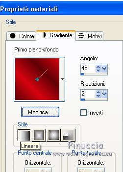 Occorrente: Materiale qui Tubes di Reveries, Guismo, Nikita e Corinne Vicaire. Filtri in caso di dubbi, ricorda di consultare la mia sezione filtri qui Graphics Plus - Cross Shadow qui Animation Shop qui ![]() Se utilizzi altri colori, non esitare a cambiare modalità di miscelatura e opacità dei livelli Nelle ultime versioni di PSP non c'è il gradiente di primo piano/sfondo (Corel_06_029) Puoi usare i gradienti delle versioni precedenti. Trovi qui i gradienti Corel X. 1. Imposta il colore di primo piano con #5e0207, e il colore di sfondo con #d60311. ![]() Passa il colore di primo piano a Gradiente di primo piano/sfondo, stile Lineare. ![]() il gradiente non sarà poi utilizzato nel corso del tutorial 2. Apri una nuova immagine trasparente 650 x 500 pixels. 3. Selezione>Seleziona tutto. Apri il tube di Corinne mist.corinne.vicaire.fleurs 01; attiva il livello di sfondo - achtergrond. Modifica>Copia. Torna al tuo lavoro e vai a Modifica>Incolla nella selezione. Mantieni selezionato. Attiva nuovamente il tube di Corinne Vicaire e attiva il livello del fiore, Raster 1. Modifica>Copia. Torna al tuo lavoro e vai a Modifica>Incolla come nuovo livello. Livelli>Unisci>Unisci giù. Selezione>Modifica>Contrai - 16 pixels Effetti>Effetti 3D>Sfalsa ombra. ![]() Ripeti l'Effetto Sfalsa ombra, cambiando verticale e orizzontale con -2. Selezione>Modifica>Contrai - 6 pixels,. Effetti>Effetti 3D>Sfalsa ombra. ![]() Ripeti l'Effetto Sfalsa ombra, cambiando verticale e orizzontale con -2. Selezione>Deseleziona. . 4. Apri il tube rode vogels e vai a Modifica>Copia. Torna al tuo lavoro e vai a Modifica>Incolla come nuovo livello. Sposta il tube a sinistra, sopra la farfalla.![]() Regola>Messa a fuoco>Metti a fuoco. 5. Apri il tube calquisglamour 8410 e vai a Modifica>Copia. Torna al tuo lavoro e vai a Modifica>Incolla come nuovo livello. Immagine>Ridimensiona, al 90%, tutti i livelli non selezionato. Sposta il tube a destra.6. Apri il tube 1220640186 hommes e vai a Modifica>Copia. Torna al tuo lavoro e vai a Modifica>Incolla come nuovo livello. Immagine>Ridimensiona, al 30%, tutti i livelli non selezionato. Sposta il tube in alto a sinistra.Abbassa l'opacità di questo livello all'80%. 7. Apri il wordart love is in the air e vai a Modifica>Copia. Torna al tuo lavoro e vai a Modifica>Incolla come nuovo livello. Immagine>Ridimensiona, al 40%, tutti i livelli non selezionato. Sposta il tube al centro.8. Firma il tuo lavoro su un nuovo livello raster. ANIMAZIONE. 9. Modifica>Copia Unione. Apri Animation Shop e vai a Modifica>Incolla>Incolla come nuova animazione. 10. Torna in PSP. Attiva il livello del testo. Effetti>Plugins>Graphics Plus - Cross Shadow. ![]() Modifica>Copia Unione. Torna in Animation Shop e vai a Modifica>Incolla>Incolla dopo il fotogramma corrente. 11. Di nuovo in PSP. Modifica>Annulla azione Cross Shadow. Effetti>Plugins>Graphics Plus - Cross Shadow, cambia Brightness con 255 e ok. ![]() Modifica>Copia Unione. In Animation Shop: Modifica>Incolla>Incolla dopo il fotogramma corrente. 12. Modifica>Selezione>Seleziona tutto. Modifica>Copia. Clicca sull'ultimo fotogramma per selezionarlo. Modifica>Incolla>Incolla dopo il fotogramma corrente. Animazione>Inverti fotogrammi. 13. Modifica>Selezione>Seleziona tutto. Animazione>Proprietà fotogramma e imposta la velocità a 35. ![]() Clicca sul fotogramma 3 per selezionarlo. Animazione>Proprieà fotogramma e imposta la velocità a 70. ![]() 15. Animazione>Ridimensiona, 650 pixels o come preferisci. Controlla il risultato cliccando su Visualizza e salva in formato gif.![]() Puoi scrivermi per qualsiasi problema, o dubbio se trovi un link che non funziona, o anche soltanto per dirmi se questo tutorial ti è piaciuto. 12 Giugno 2017 |