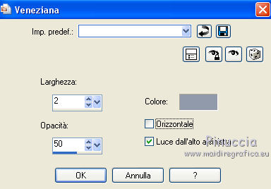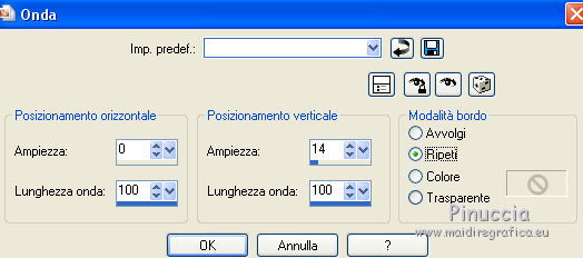 qui puoi trovare qualche risposta ai tuoi dubbi. Se l'argomento che ti interessa non è presente, ti prego di segnalarmelo. Questo tutorial è stato creato con PSP X2 e tradotto con Corel X, ma può essere eseguito anche con le altre versioni. Dalla versione X4, il comando Immagine>Rifletti è stato sostituito con Immagine>Capovolgi in orizzontale, e il comando Immagine>Capovolgi con Immagine>Capovolgi in verticale. Nelle versioni X5 e X6, le funzioni sono state migliorate rendendo disponibile il menu Oggetti. Con la versione X7 sono tornati i comandi Immagine>Rifletti e Immagine>Capovolgi, ma con nuove funzioni. Vedi la scheda sull'argomento qui traduzione francese/traduction française qui Le vostre versioni/vos versions qui Occorrente: Materiale qui I tubes sono di Nikita, Jennie e Corry. Il © appartiene all'artista originale. Mantieni il credito di chi ha creato il tube. Filtri in caso di dubbi, ricorda di consultare la mia sezione filtri qui Mura's Meister - Perspective Tiling qui Mehdi - Sorting Tiles qui Animation Shop qui ![]() 1. Imposta il colore di primo piano con #909aab, e il colore di sfondo con #ffffff. ![]() Passa il colore di primo piano a Gradiente, stile Lineare. ![]() 2. Apri una nuova immagine trasparente 900 x 600 pixels, e riempila con il gradiente.3. Effetti>Plugins>Mehdi - Sorting Tiles. ![]() 4. Effetti>Effetti di trama>Veneziana - colore #909aab. ![]() 5. Livelli>Duplica. Effetti>Plugins>Mura's Meister - Perspective Tiling. ![]() 6. Attiva il livello inferiore Raster 1. Effetti>Effetti di distorsione>Onda. ![]() 7. Attiva il livello superiore. Apri il tube deco les 101 e vai a Modifica>Copia. Torna al tuo lavoro e vai a Modifica>Incolla come nuovo livello. Spostalo a sinistra, contro il bordo.Effetti>Effetti di distorsione>Onda, con i settaggi precedenti. ![]() 8. Apri il tube "kerstballenslinger les 101". Attiva il livello kerstlinger e vai a Modifica>Copia. Torna al tuo lavoro e vai a Modifica>Incolla come nuovo livello. Sposta le palline in alto a sinistra.9. Attiva nuovamente il tube "kerstballenslinger les 101" e copia il livello kerstbal. Torna al tuo lavoro e vai a Modifica>Incolla come nuovo livello. Sposta la pallina in basso a sinistra (vedi il mio esempio).Livelli>Duplica. Immagine>Capovolgi. Posiziona il duplicato contro l'originale.Livelli>Disponi>Sposta giù. Abbassa l'opacità di questo livello al 22%. ![]() 10. Apri il tube dell'albero "noel nikita", e vai a Modifica>Copia. Torna al tuo lavoro e vai a Modifica>Incolla come nuovo livello. Immagine>Ridimensiona, all'80%, tuttii livelli non selezionato. Spostalo in basso a destra.Regola>Tonalità e saturazione>Viraggio. ![]() 11. Livelli>Duplica. Immagine>Capovolgi. Posiziona il duplicato contro l'originale.Livelli>Disponi>Sposta giù. Abbassa l'opacità di questo livello al 22%. ![]() 12. Apri il wordart-les101 e vai a Modifica>Copia. Torna al tuo lavoro e vai a Modifica>Incolla come nuovo livello. Spostalo in alto a destra.13. Immagine>Aggiungi bordatura, 1 pixel, simmetriche, colore #909aab. Immagine>Aggiungi bordatura, 2 pixels, simmetriche, colore #ffffff. Immagine>Aggiungi bordatura, 1 pixel, simmetriche, colore #909aab. Immagine>Aggiungi bordatura, 20 pixels, simmetriche, colore #ffffff. Immagine>Aggiungi bordatura, 2 pixels, simmetriche, colore #909aab. Immagine>Aggiungi bordatura, 20 pixels, simmetriche, colore #ffffff. 14. Aggiungi il tuo nome e/o il tuo watermark su un nuovo livello. 15. Apri il tube della donna e vai a Modifica>Copia. Torna al tuo lavoro e vai a Modifica>Incolla come nuovo livello. Immagine>Ridimensiona, all'80%, tutti i livelli non selezionato. 16. Immagine>Aggiungi bordatura, 1 pixel, simmetriche, colore #909aab. 17. Attiva nuovamente il tube "kerstballenslinger les 101" e copia il livello ster. Torna al tuo lavoro e vai a Modifica>Incolla come nuovo livello. Sposta la stella in alto a sinistra sulla linea del bordo.Livelli>Duplica, e posiziona questa stella sulla linea a sinistra.Livelli>Unisci>Unisci giù. Livelli>Duplica. Immagine>Rifletti. Livelli>Unisci>Unisci visibile. Se non vuoi realizzare l'animazione, salva in formato jpg. 18. Per l'animazione: attiva lo strumento Bacchetta magica ![]() ingrandisci l'immagine usando lo strumento Zoom o la rotellina del mouse,e clicca nel bordo da 2 pixels e nelle stelline per selezionarli. 19. Regola>Aggiungi/Rimuovi disturbo>Aggiungi disturbo. ![]() Selezione>Deseleziona. 20. Modifica>Copia. Apri Animation Shop e vai a Modifica>Incolla>Incolla come nuova animazione. 21. Torna in PSP. Modifica>Annulla azione Deseleziona. Modifica>Annulla azione Aggiungi disturbo. Regola>Aggiungi/Rimuovi disturbo>Aggiungi disturbo, cambia il disturbo con 24 e ok. Selezione>Deseleziona. Modifica>Copia. Torna in Animation Shop e vai a Modifica>Incolla>Incolla dopo il fotogramma corrente. 22. In PSP. Modifica>Annulla azione Deseleziona. Modifica>Annulla azione Aggiungi disturbo. Regola>Aggiungi/Rimuovi disturbo>Aggiungi disturbo, cambia il disturbo con 28 e ok. Selezione>Deseleziona. Modifica>Copia. In Animation Shop: Modifica>Incolla>Incolla dopo il fotogramma corrente. Controlla il risultato cliccando su Visualizza e salva in formato gif.![]() Se hai problemi o dubbi, o trovi un link non funzionante, o anche soltanto per dirmi se questo tutorial ti è piaciuto, scrivimi. 10 Dicembre 2013 |