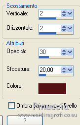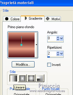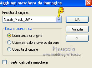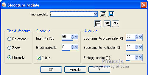 Occorrente: Materiale qui Tubes di Drevers e Nikita. Testo e Deco di Corry. Maschera di Narah. Filtri in caso di dubbi, ricorda di consultare la mia sezione filtri qui Alien Skin Eye Candy 5 Impact - Perspective Shadow, Glass qui Mehdi - Weaver qui ![]() Se utilizzi altri colori, non esitare a cambiare modalità di miscelatura e opacità dei livelli Nelle ultime versioni di PSP non c'è il gradiente di primo piano/sfondo (Corel_06_029) Trovi i gradienti delle versioni precedenti qui Metti i presets Cliccando sul file una o due volte (a seconda delle tue impostazioni), automaticamente il preset si installerà nella cartella corretta. perchè uno o due clic vedi qui Apri la maschera e la selezione (che contiene una selezione salvata sul canale alfa) in PSP e minimizzale con il resto del materiale. 1. Imposta il colore di primo piano con #561216, e il colore di sfondo con #eca086. ![]() Passa il colore di primo piano a Gradiente di primo piano/sfondo, stile Lineare. ![]() 2. Apri una nuova immagine trasparente 900 x 550 pixels, e riempila con il gradiente.3. Livelli>Nuovo livello raster. Selezione>Seleziona tutto. Apri il tube della donna e vai a Modifica>Copia. minimizza il tube che ti servirà ancora Torna al tuo lavoro e vai a Modifica>Incolla nella selezione. Selezione>Deseleziona. 4. Regola>Sfocatura>Sfocatura radiale. ![]() 5. Effetti>Effetti di immagine>Scostamento. ![]() 6. Livelli>Duplica. Immagine>Rifletti. Livelli>Unisci>Unisci giù. 7. Livelli>Duplica. Immagine>Ruota per gradi - 90 gradi a sinistra. ![]() 8. Effetti>Effetti geometrici>Inclina. ![]() 9. Effetti>Plugins>Mehdi - Weaver. ![]() 10. Effetti>Effetti di immagine>Motivo unico, Fianco a fianco ![]() 11. Attiva il livello Raster 2 e cambia la modalità di miscelatura in Sovrapponi, e abbassa l'opacità al 40%. se questa è la visualizzazione della tua paletta dei livelli, per cambiare le proprietà non è necessario attivare il livello. ![]() 12. Attiva il livello superiore. Apri il tube dei fiori, cancella il watermark, e vai a Modifica>Copia. Torna al tuo lavoro e vai a Modifica>Incolla come nuovo livello. Abbassa l'opacità di questo livello al 40%. 13. Imposta il colore di primo piano con il colore bianco #ffffff. Livelli>Nuovo livello raster. Riempi con il colore bianco.14. Livelli>Nuovo livello maschera>Da immagine. Apri il menu sotto la finestra di origine e vedrai la lista dei files aperti. Seleziona la maschera Narah_Mask_0947, con i seguenti settaggi. ![]() Livelli>Unisci>Unisci gruppo. 15. Se non lo hai fatto prima di iniziare, apri la selezione Selectie les 132 e minimizzala (l'immagine contiene una selezione salvata sul canale alfa). Torna al tuo lavoro. Selezione>Carica/Salva selezione>Carica selezione da canale alfa. La selezione selectie 1 è subito disponibile. Devi soltanto cliccare Carica. ![]() Premi sulla tastiera il tasto CANC ![]() Selezione>Deseleziona. 16. Apri element 1 les 132, e vai a Modifica>Copia. Torna al tuo lavoro e vai a Modifica>Incolla come nuovo livello. Spostalo a destra.Abbassa l'opacità di questo livello all'80%. 17. Apri kaders les 132, e vai a Modifica>Copia. Torna al tuo lavoro e vai a Modifica>Incolla come nuovo livello. Spostalo a destra![]() Chiudi questo livello. 18. Modifica>Copia Unione. Riapri il livello delle cornici. Attiva lo strumento Bacchetta magica ![]() e clicca nelle cornici per selezionarle. Modifica>Incolla nella selezione. 19. Effetti>Plugins>Alien Skin Eye Candy 5 Impact - Glass. Seleziona il preset Glass les 132 e ok. ![]() Questi i settaggi in caso di problemi con il preset. ![]() 20. Apri deco les 132. Attiva il livello bloemetjes et vai a Modifica>Copia. Torna al tuo lavoro e vai a Modifica>Incolla come nuovo livello. Sposta i fiori a sinistra.![]() 21. Effetti>Plugins>Alien Skin Eye Candy 5 Impact - Perspective Shadow. Seleziona il preset les 132 shadow e ok. ![]() 22. Apri tekst, e vai a Modifica>Copia. Torna al tuo lavoro e vai a Modifica>Incolla come nuovo livello. Spostalo in basso a sinistra (vedi il mio esempio).23. Apri element 2 les 132, e vai a Modifica>Copia. Torna al tuo lavoro e vai a Modifica>Incolla come nuovo livello. Effetti>Effetti di immagine>Scostamento. ![]() 24. Apri il tube deco les 132; e copia, uno alla volta, i livelli delle farfalle che vuoi usare. Torna al tuo lavoro e vai a Modifica>Incolla come nuovo livello. Posiziona le farfalle a tuo piacimento,o vedi il mio esempio. 25. Immagine>Aggiungi bordatura, 1 pixel, simmetriche, colore #561216. Immagine>Aggiungi bordatura, 12 pixels, simmetriche, colore #ffffff. Immagine>Aggiungi bordatura, 1 pixel, simmetriche, colore #561216. Selezione>Seleziona tutto. Immagine>Aggiungi bordatura, 40 pixels, simmetriche, colore #ffffff. 26. Effetti>Effetti 3D>Sfalsa ombra, colore #561216. ![]() Ripeti l'Effetto Sfalsa ombra, cambiando verticale e orizzontale con -2. 27. Apri il tube della donna, e vai a Modifica>Copia. Torna al tuo lavoro e vai a Modifica>Incolla come nuovo livello. Immagine>Ridimensiona, al 95%, tutti i livelli non selezionato. 28. Firma il tuo lavoro su un nuovo livello. 29. Immagine>Aggiungi bordatura, 1 pixel, simmetriche, colore #561216. 30. Immagine>Ridimensiona, a 900 pixels di larghezza, o come preferisci, tutti i livelli selezionato. Salva in formato jpg. Per questo esempio ho usato un tube di Isa ![]() ![]() Puoi scrivermi per qualsiasi problema, o dubbio se trovi un link che non funziona, o anche soltanto per dirmi se questo tutorial ti è piaciuto. 1 Marzo 2016 |
