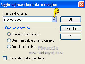 Occorrente: Materiale qui Tubes di Chaosgaby, Annelies, Corry. Filtri in caso di dubbi, ricorda di consultare la mia sezione filtri qui Eye Candy 4000 - Drip qui Animation Shop qui ![]() Se utilizzi altri colori, non esitare a cambiare modalità di miscelatura e opacità dei livelli Nelle ultime versioni di PSP non c'è il gradiente di primo piano/sfondo (Corel_06_029) Puoi usare i gradienti delle versioni precedenti. Trovi qui i gradienti Corel X. Apri la maschera in PSP e minimizzala con il resto del materiale. 1. Imposta il colore di primo piano con #d5b11d, e il colore di sfondo con #f5ec9d. ![]() Passa il colore di primo piano a Gradiente di primo piano/sfondo, stile Lineare. ![]() 2. Apri una nuova immagine trasparente 650 x 500 pixels. Riempi l'immagine trasparente con il gradiente.3. Apri il tube chg 18 e vai a Modifica>Copia. Torna al tuo lavoro e vai a Modifica>Incolla come nuovo livello. 4. Apri il tube kleine bij, e vai a Modifica>Copia. Torna al tuo lavoro e vai a Modifica>Incolla come nuovo livello. Spostalo sul fiore.![]() 5. Apri il tube honingraat groot, e vai a Modifica>Copia. Torna al tuo lavoro e vai a Modifica>Incolla come nuovo livello. Sposta questo tube a sinistra.![]() 6. Apri il tube Alies 487 vrouw, e vai a Modifica>Copia. Torna al tuo lavoro e vai a Modifica>Incolla come nuovo livello. Immagine>Ridimensiona, 1 volta all'80% e una volta all'85%, tutti i livelli non selezionato. Sposta il tube a sinistra.7. Imposta il colore di primo piano con il colore nero. Livelli>Nuovo livello raster. Riempi il livello con il colore nero.Selezione>Seleziona tutto. Selezione>Modifica>Contrai - 10 pixels. Premi sulla tastiera il tasto CANC ![]() Selezione>Deseleziona. 8. Livelli>Nuovo livello raster. Riempi il livello con il colore nero.Livelli>Nuovo livello maschera>Da immagine. Apri il menu sotto la finestra di origine e vedrai la lista dei files aperti. Seleziona la maschera masker bees. ![]() Livelli>Unisci>Unisci gruppo. 9. Firma il tuo lavoro su un nuovo livello. 10. Apri il tube honingraatklein e vai a Modifica>Copia. Torna al tuo lavoro e vai a Modifica>Incolla come nuovo livello. Spostalo sul cerchio in alto a destra.Modifica>Incolla come nuovo livello, e spostalo sul secondo cerchio.Modifica>Incolla come nuovo livello, e spostalo sul terzo cerchio.Livelli>Unisci>Unisci giù - 2 volte, per avere i tre cerchi su un solo livello. 11. Apri il tube Bij, e vai a Modifica>Copia. Torna al tuo lavoro e vai a Modifica>Incolla come nuovo livello. Immagine>Ridimensiona, all'80%, tutti i livelli non selezionato. Posiziona il tube al centro.![]() ANIMAZIONE 12. Attiva il livello dei tre cerchi. Effetti>Plugins>Eye Candy 4000 - Drip. ![]() Modifica>Copia Unione. Apri Animation Shop e vai a Modifica>Incolla come nuova animazione. 13. Torna in PSP. Modifica>Annulla azione Drip. Ripeti Effetti>Plugins>Eye Candy 4000 - Drip, clicca una volta su Random Seed e ok. Modifica>Copia Unione. Torna in Animation Shop e vai a Modifica>Incolla>Incolla dopo il fotogramma corrente. 14. Di nuovo in PSP. Modifica>Annulla azione Drip. Ripeti Effetti>Plugins>Eye Candy 4000 - Drip, clicca una volta su Random Seed e ok. Modifica>Copia Unione. In Animation Shop vai a Modifica>Incolla>Incolla dopo il fotogramma corrente. 15. Modifica>Seleziona tutto. Animazione>Proprietà dell'immagine e imposta la velocità a 50. ![]() Animazione>Ridimensiona, 650 pixels o come preferisci. Controlla il risultato cliccando su Visualizza e salva in formato gif.![]() Puoi scrivermi per qualsiasi problema, o dubbio se trovi un link che non funziona, o anche soltanto per dirmi se questo tutorial ti è piaciuto. 12 Giugno 2017 |