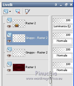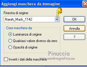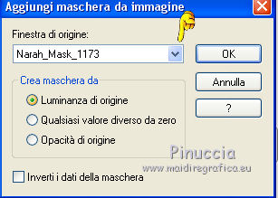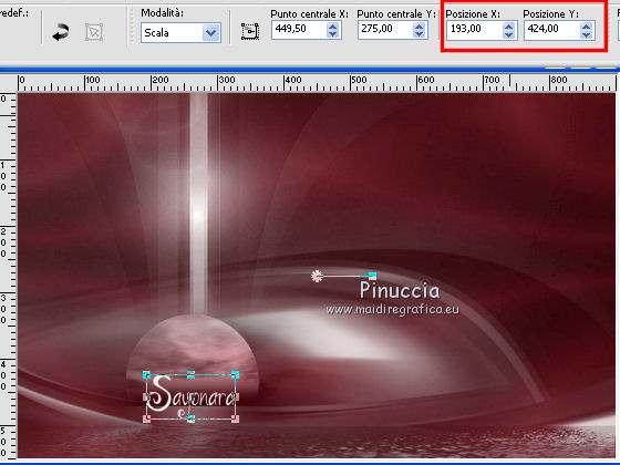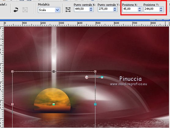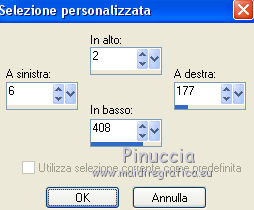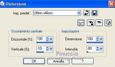 Occorrente: Materiale qui Il tube della donna è di Cickadesign. Il resto del materiale è di Corry. Filtri in caso di dubbi, ricorda di consultare la mia sezione filtri qui Mehdi - Wavy Lab qui Flaming Pear - Flood qui Alien Skin Eye Candy 5 Impact - Perspective Shadow qui Filters Unlimited 2.0 qui Toadies - Ommadawn, Weaver qui I filtri Toadies si possono usare da soli o importati in Filters Unlimited (come fare vedi qui) Se un filtro fornito appare con questa icona ![]() Se utilizzi altri colori, non esitare a cambiare modalità di miscelatura e opacità dei livelli Apri le maschere in PSP e minimizzale con il resto del materiale. 1. Imposta il colore di primo piano con #4e0514, e il colore di sfondo con il colore #c09192. ![]() 2. Apri una nuova immagine trasparente 900 x 550 pixels. 3. Effetti>Plugins>Mehdi - Wavy Lab (attenzione, è la versione con 3 colori). Questo filtro crea gradienti con i colori della paletta: il primo è il colore di sfondo, il secondo quello di primo piano. Mantieni il terzo colore creato dal filtro (#874b53). ![]() 4. Effetti>Effetti di distorsione>Distorsione. ![]() 5. Livelli>Duplica. Immagine>Rifletti. 6. Cambia la modalità di miscelatura di questo livello in Sovrapponi. ![]() Livelli>Unisci>Unisci giù. 7. Imposta il colore di primo piano con il colore bianco #ffffff. Livelli>Nuovo livello raster. Riempi il livello con il colore bianco.8. Livelli>Nuovo livello maschera>Da immagine. Apri il menu sotto la finestra di origine e vedrai la lista dei files aperti. Seleziona la maschera Narah_Mask_1173. ![]() Livelli>Unisci>Unisci gruppo. 9. Effetti>Plugins>Flaming Pear - Flood. ![]() 10. Livelli>Nuovo livello raster. Riempi il livello con il colore bianco.11. Livelli>Nuovo livello maschera>Da immagine. Apri il menu sotto la finestra di origine e seleziona la maschera Narah_mask_1141. ![]() Livelli>Unisci>Unisci gruppo. 12. Effetti>Plugins>Flaming Pear - Flood, con i settaggi precedenti. 13. Apri il tube zon e vai a Modifica>Copia. Torna al tuo lavoro e vai a Modifica>Incolla come nuovo livello. 14. Per posizionare il tube: tasto K per attivare lo strumento Puntatore ![]() se stai usando PSP 9 il tasto D per attivare lo strumento Deformazione ![]() e imposta le coordinate Posizione X: 45,00 e Posizione Y: -244,00. ![]() Tasto M o strumento manina per deselezionare.Cambia la modalità di miscelatura di questo livello in Luminanza (esistente). 15. Apri selectie les 139 (che contiene una selezione salvata sul canale alfa) e minimizzala. Torna al tuo lavoro e attiva il livello Gruppo Raster 2 (la seconda maschera) ![]() 16. Selezione>Carica/Salva selezione>Carica selezione da canale alfa. La selezione è subito disponibile. Devi soltanto cliccare Carica. ![]() ![]() Premi sulla tastiera il tasto CANC ![]() Selezione>Deseleziona. 17. Attiva nuovamente il livello superiore. Apri il testo Sayonara e vai a Modifica>Copia. Torna al tuo lavoro e vai a Modifica>Incolla come nuovo livello. 18. Strumento Puntatore ![]() e imposta le coordinate Posizione X: 193,00 e Posizione Y: 424,00. ![]() Tasto M o strumento manina per deselezionare.19. Effetti>Plugins>Alien Skin Eye Candy 5 Impact - Perspective Shadow. Seleziona il preset Reflect in front,sharp e ok. ![]() 20. Apri il testo tekst les 139-2 e vai a Modifica>Copia. Torna al tuo lavoro e vai a Modifica>Incolla come nuovo livello. Spostalo a sinistra, come nel mio esempio.22. Apri il tube tak e vai a Modifica>Copia. Torna al tuo lavoro e vai a Modifica>Incolla come nuovo livello. Spostalo in alto a destra.![]() 23. Livelli>Nuovo livello raster. Attiva lo strumento Selezione ![]() (non importa il tipo di selezione impostato, perchè con la selezione personalizzata si ottiene sempre un rettangolo) clicca sull'icona Selezione personalizzata ![]() e imposta i seguenti settaggi. ![]() Riempi la selezione con il colore bianco.Selezione>Deseleziona. 24. attenzione, il prossimo filtro, secondo la versione di Unlimited utilizzata, può assumere la sfumatura del colore di sfondo; in questo caso, prima di applicare il filtro, imposta il colore di sfondo con il colore bianco Effetti>Plugins>Filters Unlimited 2.0 - Toadies - Weaver, con i settaggi standard. ![]() 25. Effetti>Plugins>Filters Unlimited 2.0 - Toadies - Ommadawn, con i settaggi standard. ![]() Abbassa l'opacità di questo livello al 42%. 26. Apri il tube vogels e vai a Modifica>Copia. Torna al tuo lavoro e vai a Modifica>Incolla come nuovo livello. Spostalo in alto a sinistra.27. Immagine>Aggiungi bordatura, 1 pixel, simmetriche, #4e0514. Immagine>Aggiungi bordatura, 1 pixel, simmetriche, #ffffff. Immagine>Aggiungi bordatura, 1 pixel, simmetriche, #4e0514. Immagine>Aggiungi bordatura, 20 pixels, simmetriche, #ffffff. Immagine>Aggiungi bordatura, 1 pixel, simmetriche, #4e0514. Selezione>Seleziona tutto. Immagine>Aggiungi bordatura, 30 pixels, simmetriche, #ffffff. 28. Effetti>Effetti 3D>Sfalsa ombra, colore #4e0514. ![]() Selezione>Deseleziona. 29. Apri il tube Letters voor de rand, e vai a Modifica>Copia. Torna al tuo lavoro e vai a Modifica>Incolla come nuovo livello. Spostalo sul bordo in alto a destra.Livelli>Duplica. Sposta questo testo sul bordo in basso a sinistra.30. Firma il tuo lavoro su un nuovo livello. 31. Apri il tube della donna e vai a Modifica>Copia. Torna al tuo lavoro e vai a Modifica>Incolla come nuovo livello. Cancella il watermark. Immagine>Ridimensiona, al 95%, tutti i livelli non selezionato. Posiziona correttamente il tube.32. Immagine>Aggiungi bordatura, 1 pixel, simmetriche, #4e0514. 33. Immagine>Ridimensiona, 900 pixels di larghezza, o come preferisci, tutti i livelli selezionato. Salva in formato jpg. Il tube di questa versione è di A PSP Devil ![]() ![]() Puoi scrivermi per qualsiasi problema, o dubbio se trovi un link che non funziona, o anche soltanto per dirmi se questo tutorial ti è piaciuto. 7 Ottobre 2017 |