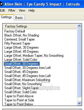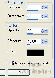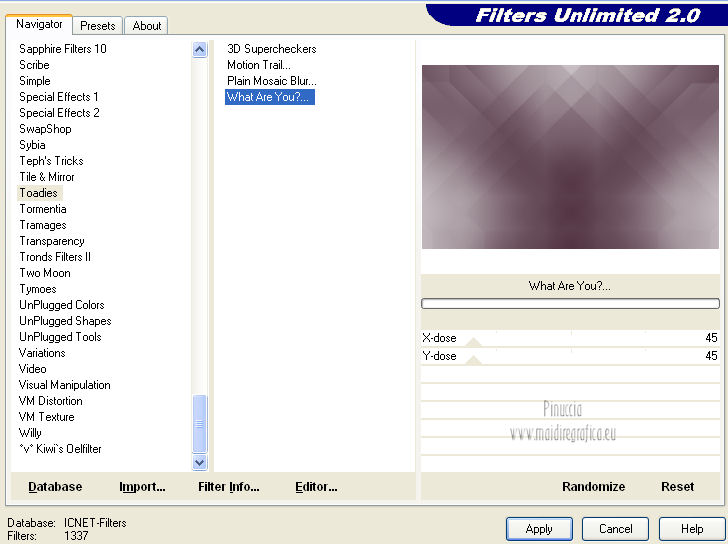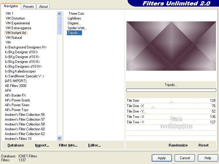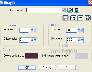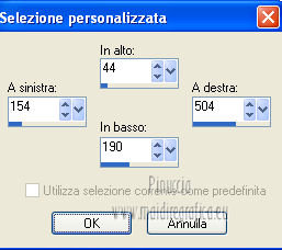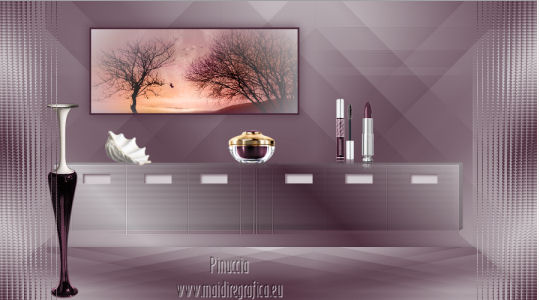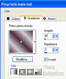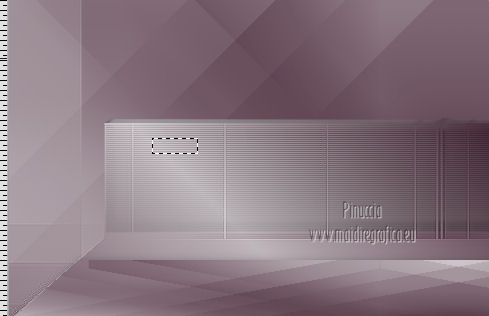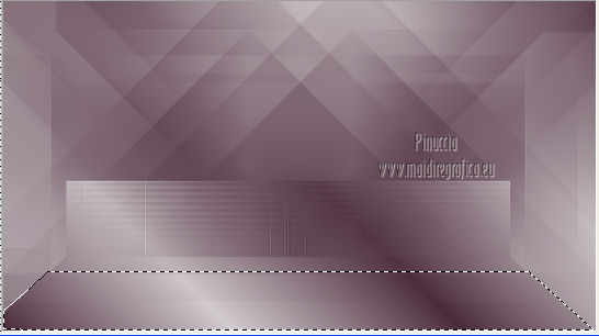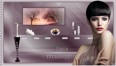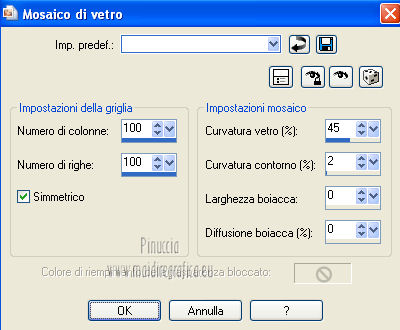 qui puoi trovare qualche risposta ai tuoi dubbi. Se l'argomento che ti interessa non è presente, ti prego di segnalarmelo. Questo tutorial è stato creato con PSP X2 e tradotto con PSP X, ma può essere eseguito anche con le altre versioni. Dalla versione X4, il comando Immagine>Rifletti è stato sostituito con Immagine>Capovolgi in orizzontale, e il comando Immagine>Capovolgi con Immagine>Capovolgi in verticale. Nelle versioni X5 e X6, le funzioni sono state migliorate rendendo disponibile il menu Oggetti. Con la versione X7 sono tornati i comandi Immagine>Rifletti e Immagine>Capovolgi, ma con nuove funzioni. Vedi la scheda sull'argomento qui Traduzione in francese qui Le vostre versioni qui Occorrente: Materiale qui I tubes vengono da Liza - Design Corry. Il © appartiene all'artista originale. Mantieni il credito di chi ha creato il tube. Filtri in caso di dubbi, ricorda di consultare la mia sezione filtri qui Filters Unlimited 2.0 qui VM Instant Art - Tripolis qui Toadies - What are you qui Alien Skin Eye Candy 5 Impact - Extrude qui I filtri VM Instant Art e Toadies si possono usare da soli o importati in Filters Unlimited (come fare vedi qui) Se un filtro fornito appare con questa icona Animation Shop qui ![]() non esitare a cambiare modalità di miscelatura e opacità secondo i colori utilizzati. Nelle ultime versioni di PSP non c'è il gradiente di primo piano/sfondo (Corel_06_029) Trovi i gradienti delle versioni precedenti qui Apri la maschera in PSP e minimizzala con il resto del materiale. 1. Imposta il colore di primo piano con #d1cbcf, e il colore di sfondo con #4c2c3b. ![]() Passa il colore di primo piano a Gradiente, stile Lineare. ![]() 2. Apri una nuova immagine trasparente 800 x 500 pixels, e riempila con il colore di sfondo.3. Livelli>Nuovo livello raster. Riempi con il gradiente.Regola>Sfocatura>Sfocatura gaussiana - raggio 18. ![]() 4. Effetti>Plugins>Filters Unlimited 2.0 - VM Instant Art - Tripolis, con i settaggi standard. ![]() 5. Effetti>Plugins>Filters Unlimited 2.0 - Toadies - What are you. ![]() Modifica>Copia. 6. Livelli>Nuovo livello raster. Riempi con il gradiente.Regola>Sfocatura>Sfocatura gaussiana - raggio 18. ![]() 7. Livelli>Nuovo livello maschera>Da immagine. Apri il menu sotto la finestra di origine e vedrai la lista dei files aperti. Seleziona la maschera masker les 96, con i seguenti settaggi: ![]() Effetti>Effetti di bordo>Aumenta. Livelli>Unisci>Unisci gruppo. 8. Attiva lo strumento Selezione a mano libera ![]() e traccia una selezione della striscia inferiore. ![]() Modifica>Incolla nella selezione (l'immagine copiata al punto 5). Effetti>Effetti 3D>Sfalsa ombra, con il colore nero. ![]() Selezione>Deseleziona. 9. Attiva lo strumento Selezione , rettangolo,e seleziona la striscia centrale. ![]() Effetti>Plugins>Alien Skin Eye Candy Impact 5 Extrude seleziona il preset Small Offset, 30 Degrees e ok. ![]() Selezione>Deseleziona. 10. Livelli>Nuovo livello raster. Con lo strumento Selezione , rettangolo,traccia ora un piccolo rettangolo nella sezione centrale, come nell'esempio. ![]() Riempi con il colore di sfondo.Effetti>Effetti 3D>Ritaglio - con il colore di sfondo, selezionato riempi interno, con il colore di primo piano. ![]() Selezione>Deseleziona. Livelli>Duplica - 5 volte, e posiziona i sei rettangoli lungo la striscia,pressappoco come nell'esempio. ![]() 11. Apri il tube del vaso e vai a Modifica>Copia. Torna al tuo lavoro e vai a Modifica>Incolla come nuovo livello. Immagine>Ridimensiona, all'80%, tutti i livelli non selezionato. Sposta il tube a sinistra.12. Livelli>Nuovo livello raster. Attiva lo strumento Selezione ,clicca sull'icona Selezione personalizzata ![]() e imposta i seguenti settaggi: ![]() Riempi la selezione con il gradiente.13. Effetti>Effetti di trama>Mosaico di vetro. ![]() Livelli>Duplica. Immagine>Rifletti. 14. Livelli>Nuovo livello raster. Selezione personalizzata ![]() ![]() Riempi la selezione con il colore di sfondo.Selezione>Modifica>Contrai - 3 pixels. Riempi con il colore di primo piano.Mantieni selezionato. 15. Apri il tube "trees" di Liza e vai a Modifica>Copia. Torna al tuo lavoro e vai a Modifica>Incolla come nuovo livello. Immagine>Ridimensiona, al 50%, tutti i livelli non selezionato. Posiziona il tube nell'area selezionata.Selezione>Inverti. Premi sulla tastiera il tasto CANC .Selezione>Deseleziona. Livelli>Unisci>Unisci giù. Effetti>Effetti 3D>Sfalsa ombra, con il colore di sfondo #4c2c3b. ![]() Ripeti l'Effetto Sfalsa ombra, cambiando verticale e orizzontale con -4. 16. Apri il tube "diverse", composto da diversi livelli. Copia e incolla come nuovo livello sul tuo lavoro tutti i livelli del tube. Disponi gli oggetti come nel mio esempio.![]() 17. Immagine>Aggiungi bordatura, 1 pixel, simmetriche, con il colore #4c2c3b. Immagine>Aggiungi bordatura, 1 pixel, simmetriche, con il colore #d1cbcf. Immagine>Aggiungi bordatura, 1 pixel, simmetriche, con il colore #4c2c3b. 18. Selezione>Seleziona tutto. Immagine>Aggiungi bordatura, 18 pixels, simmetriche, con il colore #d1cbcf. Effetti>Effetti 3D>Sfalsa ombra, con il colore #4c2c3b. ![]() Ripeti l'Effetto Sfalsa ombra, cambiando verticale e orizzontale con -4. Selezione>Deseleziona. 19. Aggiungi il tuo nome e/o il tuo watermark su un nuovo livello. 20. Apri il tube Lady les 96 e vai a Modifica>Copia. Torna al tuo lavoro e vai a Modifica>Incolla come nuovo livello. Spostalo a destra.21. Immagine>Aggiungi bordatura, 1 pixel, simmetriche, con il colore di sfondo #4c2c3b. 22. Attiva lo strumento Selezione a mano libera ![]() e seleziona le parti trasparenti del vaso e dei cosmetici ![]() 23. Regola>Aggiungi/Rimuovi disturbo>Aggiungi disturbo. ![]() Selezione>Deseleziona. Modifica>Copia. Apri Animation Shop e vai a Modifica>Incolla>Incolla come nuova animazione. 24. Torna in PSP. Modifica>Annulla azione>Deseleziona. Modifica>Annulla azione>Aggiungi disturbo. Regola>Aggiungi/Rimuovi disturbo>Aggiungi disturbo, cambia il settaggio con 22. ![]() Selezione>Deseleziona