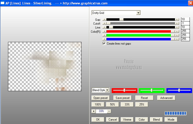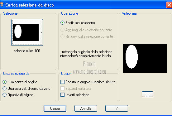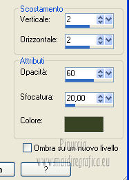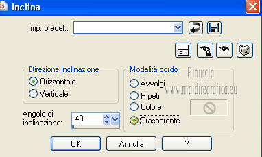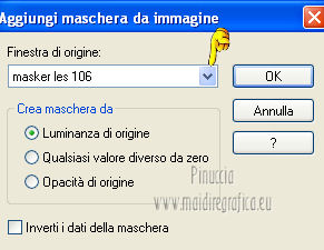 qui puoi trovare qualche risposta ai tuoi dubbi. Se l'argomento che ti interessa non è presente, ti prego di segnalarmelo. Questo tutorial è stato creato con PSP X2, ma può essere eseguito anche con le altre versioni. Per tradurlo ho usato PSP X. Occorrente: Materiale qui Il tube dell'oca è di Lenagold. Il resto del materiale è di Corry. Il © appartiene all'artista originale. Mantieni il credito di chi ha creato il tube. Filtri in caso di dubbi, ricorda di consultare la mia sezione filtri qui Filters Unlimited 2.0 qui Toadies - Weaver qui Flaming Pear - Flood qui Ap lines - Lines SilverLining qui I filtri Toadies si possono usare da soli o importati in Unlimited Animation Shop qui ![]() Metti la selezione nella cartella Selezioni. Apri la maschera in PSP e minimizzala con il resto del materiale (tranne la gif che userai in Animation Shop). 1. Imposta il colore di primo piano con #ffff80, e il colore di sfondo con #384323. ![]() Passa il colore di primo piano a Gradiente, stile Lineare. ![]() 2. Apri una nuova immagine trasparente 900 x 600 pixels, e riempila con il gradiente.3. Effetti>Plugins>Flaming Pear - Flood. ![]() 4. Livelli>Nuovo livello raster. Riempi con il colore di sfondo #384323.Livelli>Nuovo livello maschera>Da immagine. Apri il menu sotto la finestra di origine e vedrai la lista dei files aperti. Seleziona la maschera les106, con i seguenti settaggi: ![]() Livelli>Unisci>Unisci gruppo. 5. Livelli>Nuovo livello raster. Selezione>Seleziona tutto. Apri il tube dell'oca e vai a Modifica>Copia. non chiuderlo perchè ti servirà ancora Torna al tuo lavoro e vai a Modifica>Incolla nella selezione. Selezione>Deseleziona. 6. Regola>Sfocatura>Sfocatura radiale. ![]() 7. Effetti>Plugins>Filters Unlimited 2.0 - Toadies - Weaver, con i settaggi standard. ![]() 8. Livelli>Duplica. Chiudi questo livello e attiva il livello sottostante dell'originale (Raster 2). Effetti>Effetti di immagine>Scostamento. ![]() 9. Effetti>Plugins>AP Lines - Lines SilverLining. ![]() 10. Riapri e attiva il livello superiore. Effetti>Effetti di immagine>Scostamento. ![]() 11. Effetti>Effetti geometrici>Inclina. ![]() 12. Effetti>Effetti di distorsione>Stringi. nelle versioni più recenti di PSP ha assunto la denominazione "Compressione" ![]() 13. Livelli>Nuovo livello raster. Selezione>Carica/Salva selezione>Carica selezione da disco. Cerca e carica la selezione les106. ![]() Riempi la selezione con il colore di sfondo.Cambia la modalità di miscelatura di questo livello in Filtra, e abbassa l'opacità al 60%. Selezione>Deseleziona. 14. Effetti>Plugins>Flaming Pear - Flood, con i settaggi precedenti. 15. Apri il tube "bloemen les 106", che è composto da vari livelli. Attiva il livello "waterbloemen" e vai a Modifica>Copia. Torna al tuo lavoro e vai a Modifica>Incolla come nuovo livello. Sposta il tube in basso a sinistra, con gli steli nell'"acqua".Attiva nuovamente il tube "bloemen les 106". Copia e incolla sul tuo lavoro gli altri livelli "bloemen", e posiziona i fiori a tuo piacimento,o vedi il mio esempio. ![]() Attiva nuovamente il tube "bloemen les 106". Copia e incolla sul tuo lavoro tutti i livelli "vlinder", e posiziona le farfalline a tuo piacimento,o vedi il mio esempio. ![]() 16. Immagine>Aggiungi bordatura, 1 pixel, simmetriche, con il colore di sfondo. Selezione>Seleziona tutto. Immagine>Aggiungi bordatura, 45 pixels, simmetriche, con il colore bianco #ffffff. 17. Effetti>Effetti 3D>Sfalsa ombra, con il colore di sfondo #384323. ![]() Ripeti l'Effetto Sfalsa ombra, cambiando verticale e orizzontale con -2. Selezione>Deseleziona. 18. Apri il tube dell'oca e vai a Modifica>Copia. Torna al tuo lavoro e vai a Modifica>Incolla come nuovo livello. Immagine>Ridimensiona, al 110%, tutti i livelli non selezionato. Immagine>Rifletti. Sposta il tube a destra.19. Aggiungi il tuo nome e/o il tuo watermark su un nuovo livello. 20. Immagine>Aggiungi bordatura, 1 pixel, simmetriche, con il colore di sfondo #384323. 21. Animazione. Modifica>Copia. Apri Animation Shop e vai a Modifica>Incolla>Incolla come nuova animazione. Modifica>Duplica, e ripeti finchè non avrai 7 fotogrammi. Clicca sul primo fotogramma per selezionarlo e vai a Modifica>Seleziona tutto. Apri la gif "vlinder", anche questa composta da 7 fotogrammi. Modifica>Seleziona tutto. Modifica>Copia. 22. Attiva il tuo lavoro e vai a Modifica>Incolla>Incolla nel fotogramma selezionato. Posiziona la farfalla in alto a sinistra. 23. Clicca sul fotogramma 4 per selezionarlo Animazione>Proprietà fotogramma e imposta la velocità a 20. ![]() Controlla il risultato cliccando su Visualizza .Se vuoi ridimensiona (Animazione>Ridimensiona animazione...) a 650 pixels di larghezza, e salva in formato gif. Le vostre versioni. Grazie ![]() Robby ![]() Se hai problemi o dubbi, o trovi un link non funzionante, o anche soltanto per dirmi se questo tutorial ti è piaciuto, scrivimi. 29 Marzo 2013 |