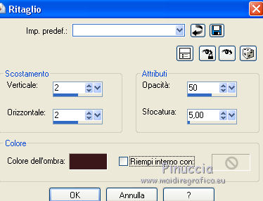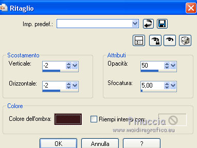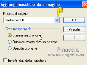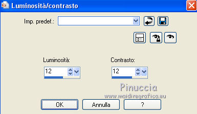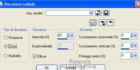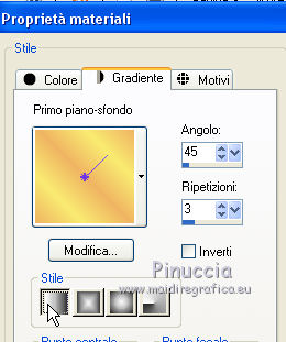Occorrente: Materiale qui Tubes di Reverie - Tub-0-Mania. Filtri in caso di dubbi, ricorda di consultare la mia sezione filtri qui DSB Flux - Blast qui Animation Shop qui ![]() Se utilizzi altri colori, non esitare a cambiare modalità di miscelatura e opacità dei livelli Nelle ultime versioni di PSP non c'è il gradiente di primo piano/sfondo (Corel_06_029) Puoi usare i gradienti delle versioni precedenti. Trovi qui i gradienti Corel X. Apri la maschera in PSP e minimizzala con il resto del materiale. 1. Imposta il colore di primo piano con #efb462, e il colore di sfondo con #f7eb71. ![]() Passa il colore di primo piano a Gradiente di primo piano/sfondo, stile Lineare. ![]() 2. Apri una nuova immagine trasparente 650 x 500 pixels,els, e riempila con il gradiente.3. Livelli>Nuovo livello raster. Selezione>Seleziona tutto. Apri il tube 1228382610 payages e vai a Modifica>Copia. Torna al tuo lavoro e vai a Modifica>Incolla nella selezione. Selezione>Deseleziona. 4. Regola>Sfocatura>Sfocatura radiale. ![]() 5. Modifica>Incolla come nuovo livello (il tube 1228382610 payages è sempre in memoria). Immagine>Ridimensiona, al 120%, tutti i livelli non selezionato. Spostalo in alto a destra,e con lo strumento Puntatore tira un po' il tube verso il basso![]() Livelli>Duplica. Immagine>Rifletti. Allinea il tube con l'originale.Livelli>Unisci>Unisci giù. 6. Livelli>Nuovo livello raster. Riempi con il colore di sfondo.Livelli>Nuovo livello maschera>Da immagine. Apri il menu sotto la finestra di origine e vedrai la lista dei files aperti. Seleziona la maschera masker les 88. ![]() Livelli>Unisci>Unisci gruppo. Livelli>Duplica. Livelli>Unisci>Unisci giù. 7. Regola>Messa a fuoco>Metti a fuoco. Sposta la maschera un po' più a destra.8. Attiva lo strumento Gomma ![]() per il mio esempio ho usato il pennello Bambagia (o Corel_01_027) (standard in PSP) se non hai questo pennello, prendilo qui ![]() e cancella il bordo della maschera visibile a sinistra ![]() 9. Immagine>Dimensioni tela - 680 x 530 pixels. ![]() Livelli>Nuovo livello raster. Selezione>Seleziona tutto. Porta il colore di primo piano a Colore. Riempi con il colore di primo piano.Selezione>Modifica>Contrai - 1 pixels. Riporta il colore di primo piano a Gradiente. Riempi con il gradiente.10. Effetti>Plugins>DSB Flux - Blast. ![]() Selezione>Modifica>Contrai - 26 pixels. Premi sulla tastiera il tasto CANC .Riporta il colore di primo piano a Colore. Riempi con il colore di primo piano.Selezione>Modifica>Contrai - 1 pixel. Premi sulla tastiera il tasto CANC. 11. Effetti>Effetti 3D>Ritaglio. ![]() Livelli>Nuovo livello raster. Ripeti l'Effetto Ritaglio cambiando verticale e orizzontale con -2. ![]() Selezione>Deseleziona. 12. Apri il tube della conchiglia "schelp" e vai a Modifica>Copia. Torna al tuo lavoro e vai a Modifica>Incolla come nuovo livello. Sposta il tube in basso a destra.13. Firma il tuo lavoro su un nuovo livello. 14. Apri il tube zomerlady e vai a Modifica>Copia. Torna al tuo lavoro e vai a Modifica>Incolla come nuovo livello. Immagine>Ridimensiona, al 68%, tutti i livelli non selezionato. Sposta il tube a sinistra.ANIMAZIONE 15. Modifica>Copia Unione. Apri Animation Shop e vai a Modifica>Incolla>Incolla come nuova animazione. 16. Torna in PSP. Attiva il livello della maschera. Regola>Luminosità e contrasto>Luminosità e contrasto. ![]() Modifica>Copia Unione. Torna in Animation Shop e vai a Modifica>Incolla>Incolla dopo il fotogramma corrente. 17. Torna in PSP. Modifica>Annulla Azione Luminosità e contrasto. Attiva il livello della conchiglia. Regola>Luminosità e contrasto>Luminosità e contrasto, con i settaggi precedenti. ![]() Modifica>Copia Unione. Torna in Animation Shop e vai a Modifica>Incolla>Incolla dopo il fotogramma corrente. 18. Modifica>Seleziona tutto. Animazione>Proprietà fotogramma e imposta la velocità a 80. ![]() 19. Animazione>Ridimensiona, 650 pixels di larghezza, o come preferisci. Controlla il risultato cliccando su Visualizza e salva in formato gif.![]() Puoi scrivermi per qualsiasi problema, o dubbio se trovi un link che non funziona, o anche soltanto per dirmi se questo tutorial ti è piaciuto. 12 Giugno 2017 |