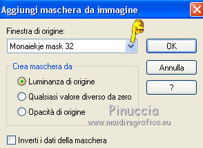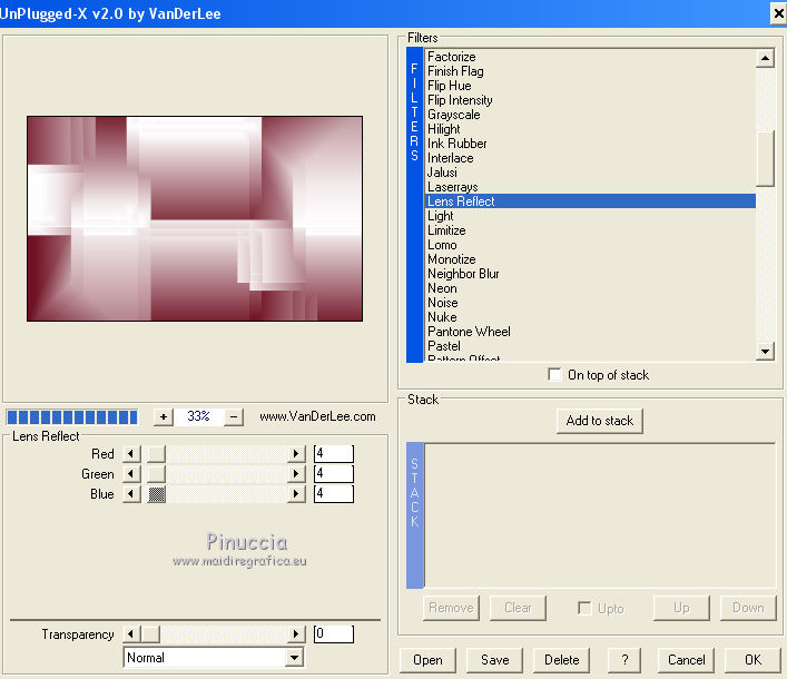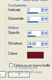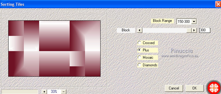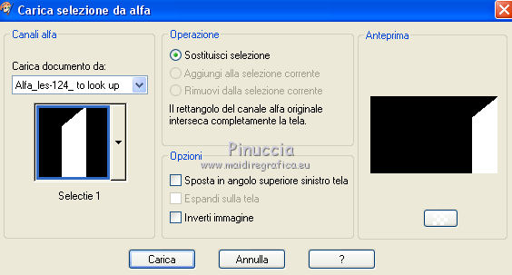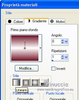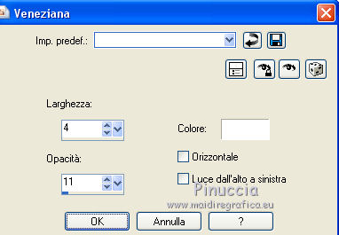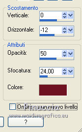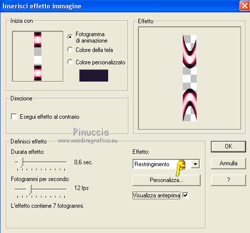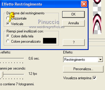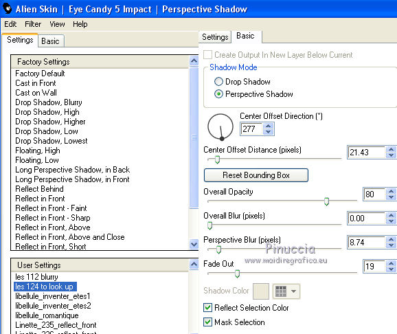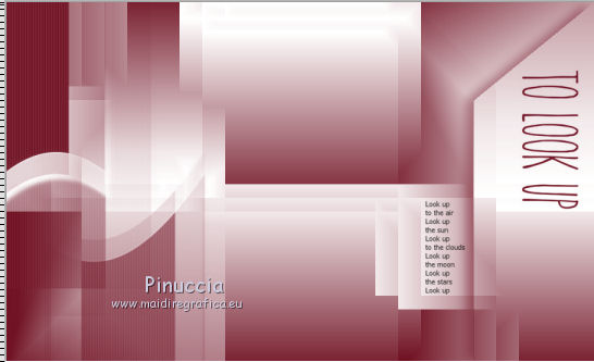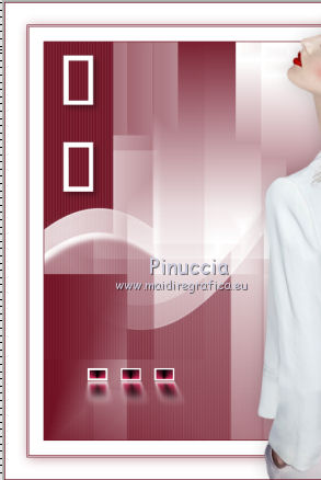 Occorrente: Materiale qui Grazie per il tube della donna Annelies e per la maschera Monaiekje. Il resto del materiale è di Corry. Il © appartiene all'artista originale. Mantieni il credito di chi ha creato il tube. Filtri in caso di dubbi, ricorda di consultare la mia sezione filtri qui AP Lines - Lines SilverLining qui VanDerLee - Unplugged-X qui Alien Skin Eye Candy 5 Impact - Perspective Shadow qui Mehdi - Sorting Tiles qui Animation Shop qui ![]() Metti il preset Cliccando sul file una o due volte (a seconda delle tue impostazioni), automaticamente il preset si installerà nella cartella corretta. perchè uno o due clic vedi qui Apri la maschera in PSP e minimizzala con il resto del materiale. 1. Imposta il colore di primo piano con #701223, e il colore di sfondo con il colore bianco #ffffff. ![]() Passa il colore di primo piano a Gradiente di primo piano/sfondo, stile Lineare. ![]() 2. Apri alfa_les_124. Finestra>Duplica o sulla tastiera maiuscola+D per fare una copia. Chiudi l'originale. La copia, che sarà la base del tuo lavoro, non è vuota, ma contiene una selezione salvata sul canale alfa. 3. Riempi l'immagine trasparente con il gradiente.4. Effetti>Plugins>Mehdi - Sorting Tiles. ![]() 5. Effetti>Plugins>VanDerLee - Unplugged-X - Lens Reflect. ![]() 6. Selezione>Carica/Salva selezione>Carica selezione da canale alfa. La selezione Selectie 1 è subito disponibile. Devi soltanto cliccare Carica. ![]() 7. Effetti>Effetti 3D>Sfalsa ombra, colore di primo piano #701223. ![]() Selezione>Deseleziona. 8. Riporta il colore di primo piano a Colore. Livelli>Nuovo livello raster. Riempi il livello con il colore di primo piano #701223.9. Livelli>Carica/Salva maschera>Carica maschera da disco. Cerca e carica la maschera Monaiekje mask 32. ![]() Livelli>Unisci>Unisci gruppo. 10. Immagine>Rifletti. 11. Effetti>Effetti di immagine>Scostamento. ![]() 12. Effetti>Effetti di trama>Veneziana - colore bianco #ffffff. ![]() 13. Apri tekst, attiva il livello "tekst klein", e vai a Modifica>Copia. Torna al tuo lavoro e vai a Modifica>Incolla come nuovo livello. Spostalo a destra.Abbassa l'opacità di questo livello all'80%. 14. Attiva nuovamente tekst, posizionati sul livello "tekst groot" e vai a Modifica>Copia. Torna al tuo lavoro e vai a Modifica>Incolla come nuovo livello. Posiziona il testo come nell'esempio.![]() 15. Apri element 1 les 124, e vai a Modifica>Copia. Torna al tuo lavoro e vai a Modifica>Incolla come nuovo livello. 16. Effetti>Effetti di immagine>Scostamento. ![]() 17. Effetti>Plugins>Alien Skin Eye Candy 5 Impact - Perspective Shadow. Seleziona il preset les 124 to look up, e ok. In caso di problemi con il preset, copia i settaggi della schermata. ![]() 18. Livelli>Duplica. Immagine>Rifletti. 19. Immagine>Aggiungi bordatura, 1 pixel, simmetriche, colore di primo piano #701223. Immagine>Aggiungi bordatura, 20 pixels, simmetriche, colore bianco #ffffff. Immagine>Aggiungi bordatura, 1 pixel, simmetriche, colore di primo piano #701223. Immagine>Aggiungi bordatura, 1 pixel, simmetriche, colore bianco #ffffff. Immagine>Aggiungi bordatura, 1 pixel, simmetriche, colore di primo piano #701223. Selezione>Seleziona tutto. Immagine>Aggiungi bordatura, 30 pixels, simmetriche, colore bianco #ffffff. Effetti>Effetti 3D>Sfalsa ombra, colore di primo piano #701223. ![]() Selezione>Deseleziona. 20. Apri il tube della donna di Alies, e vai a Modifica>Copia. Torna al tuo lavoro e vai a Modifica>Incolla come nuovo livello. Immagine>Rifletti. Effetti>Effetti 3D>Sfalsa ombra, colore nero. ![]() 21. Immagine>Aggiungi bordatura, 1 pixel, simmetriche, colore di primo piano #701223. 22. Aggiungi il tuo nome e/o il tuo watermark su un nuovo livello. Se vuoi realizzare l'animazione passa al punto 24. Se non vuoi realizzare l'animazione: 23. Apri element 2 les 124. Se non vuoi realizzare l'animazione, chiudi il livello di sfondo Raster 1, e vai a Modifica>Copia Unione. Torna al tuo lavoro e vai a Modifica>Incolla come nuovo livello. Sposta l'elemento in alto a sinistra.Livelli>Unisci>Unisci tutto e salva in formato jpg. ![]() 24. Se vuoi realizzare l'animazione, copia soltanto il livello "kadertje" del tube element 2 les 124, Torna al tuo lavoro e vai a Modifica>Incolla come nuovo livello. Spostalo in alto a sinistra.![]() Modifica>Copia Unione. Apri Animation Shop e vai a Modifica>Incolla>Incolla come nuova animazione. Modifica>Duplica e ripeti finchè non avrai un'animazione composta da 8 fotogrammi. Clicca sul primo fotogramma per selezionarlo e vai a Modifica>Seleziona tutto. 25. Torna in PSP. Attiva element 2 les 124 e posizionati sul livello "middelstukje". Modifica>Copia. Torna in Animation Shop e vai a Modifica>Incolla>Incolla come nuova animazione. 25. Effetti>Inserisci effetto immagine, ![]() seleziona Restringimento con i seguenti settaggi, quindi clicca su Personalizza e seleziona Verticale. ![]() E avrai una animazione composta da 8 fotogrammi. Modifica>Seleziona tutto. Modifica>Copia. 26. Attiva il tuo lavoro e vai a Modifica>Incolla>Incolla nel fotogramma selezionato. Posiziona l'animazione al centro delle piccole cornici bianche. 27. Animazione>Proprietà fotogramma e imposta la velocità a 18. ![]() 28. Controlla il risultato cliccando su Visualizza e salva in formato gif.Per questo esempio ho usato un tube di Guismo. ![]() ![]() Le vostre versioni. Grazie ![]() Olimpia ![]() Mylène ![]() Felinec31 ![]() Puoi scrivermi per qualsiasi problema, o dubbio se trovi un link che non funziona, o anche soltanto per dirmi se questo tutorial ti è piaciuto. 18 Febbraio 2015 |