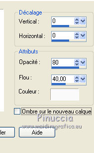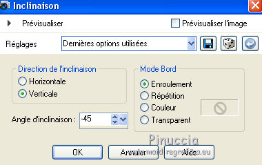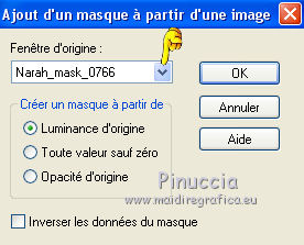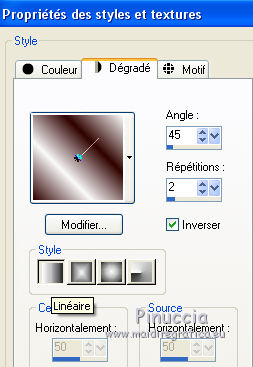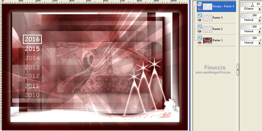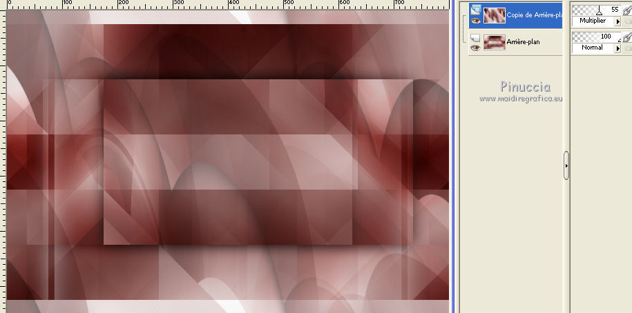 Ce tutoriel a été créé avec CorelX6 et traduit avec CorelX12, mais il peut également être exécuté avec les autres versions. Suivant la version utilisée, vous pouvez obtenir des résultats différents. Depuis la version X4, la fonction Image>Miroir a été remplacée par Image>Renverser horizontalement, et Image>Renverser avec Image>Renverser verticalement. Dans les versions X5 et X6, les fonctions ont été améliorées par la mise à disposition du menu Objets. Avec la nouvelle version X7, nous avons encore Image>Miroir et Image>Renverser/Retourner, mais avec nouvelles différences. Voir les détails à ce sujet ici Certaines dénominations ont changées entre les versions de PSP. Les plus frequentes dénominations utilisées: ![]() Traduction en italien ici Vos versions ici ![]() Nécessaire pour réaliser ce tutoriel: Matériel ici Merci pour le tube Gabry et pour les masques Narah Modules Externes: consulter, si nécessaire, ma section des filtres ici AAA Frames - Foto Frame ici Alien Skin Eye Candy 5 Impact - Backlight ici Mehdi - Sorting Tiles ici ![]() en fonction des couleurs utilisées, vous pouvez changer le mode mélange et l'opacité des calques. Dans les plus récentes versions de PSP, vous ne trouvez pas le dégradé d'avant plan/arrière plan ou Corel_06_029. Vous pouvez utiliser le dégradé des versions antérieures. Ici le dossier Dégradés de CorelX. Placer le preset En cliquant sur le preset une ou deux fois (selon vos réglages) automatiquement il se placera directement dans le dossier Settings de Alien Skin Eye Candy. pourquoi un ou deux clic voir ici Ouvrir les masque dans PSP et les minimiser avec le reste du matériel (une image sera utilisée comme masque). 1. Ouvrir une nouvelle image transparente 650 x 500 pixels. 2. Placer en avant plan la couleur claire #f9f9f9, et en arrière plan la couleur foncée #300300. ![]() Préparer en avant plan un dégradé de premier plan/arrière plan, style Linéaire. ![]() Remplir l'image transparente du dégradé.3. Calques>Dupliquer. Image>Miroir. Placer le calque en mode Recouvrement. Calques>Fusionner>Fusionner le calque de dessous. 4. Calques>Dupliquer. Effets>Modules Externes - Mehdi - Sorting Tiles. ![]() 5. Réduire l'opacité de ce calque à 50%. Calques>Fusionner>Fusionner le calque de dessous. 6. Calques>Dupliquer. Effets>Effets géométriques>Inclinaison. ![]() 7. Image>Renverser. Réduire l'opacité de ce calque à 50%. ![]() Calques>Fusionner>Fusionner le calque de dessous. 8. Activer l'outil Sélection ![]() (peu importe le type de sélection, parce que avec la sélection personnalisée vous obtenez toujours un rectangle), cliquer sur Sélection personnalisée ![]() et setter ces paramètres. ![]() Sélections>Transformer la sélection en calque. 9. Effets>Effets 3D>Ombre portée, couleur noire. ![]() Sélections>Désélectionner tout. 10. Image>Renverser. Image>Ajouter des bordures, symétrique décoché, couleur d'avant plan. ![]() 11. Effets>Effets d'image>Mosaïque sans jointures. ![]() 12. Calques>Dupliquer. Image>Miroir. Placer le calque en mode Lumière douce. ![]() Calques>Fusionner>Fusionner le calque de dessous. 13. Calques>Dupliquer. Effets>Effets de distorsion>Coordonnées polaires. ![]() 14. Effets>Effets géométriques>Inclinaison, comme précédemment, mais Verticale coché. ![]() Placer le calque en mode Multiplier et réduire l'opacité à 55%. ![]() 15. Image>Ajouter des bordures, symétrique décoché, couleur d'arrière plan. ![]() 16 Image>Ajouter des bordures, comme précédemment, mais couleur d'avant plan. ![]() 17. Effets>Effets d'image>Mosaïque sans jointures. ![]() 18. Calques>Nouveau calque raster. Sélection personnalisée ![]() ![]() 19. Activer le tube klok, Édition>Copier. Revenir sur votre travail et Édition>Coller dans la sélection. 20. Placer le calque en mode Luminance (héritée) et réduire l'opacité à 25%. Effets>Effets de bords>Accentuer davantage. Répéter>Accentuer davantage. 21. Effets>Effets 3D>Ombre portée, comme précédemment. Sélections>Désélectionner tout. ![]() 22. Placer en avant plan la Couleur. Calques>Nouveau calque raster. Remplir le calque avec la couleur d'avant plan.23. Calques>Nouveau calque de masque>A partir d'une image. Ouvrir le menu deroulant sous la fenêtre d'origine et vous verrez la liste des images ouvertes. Sélectionner le masque Narah_mask_0766. ![]() Calques>Fusionner>Fusionner le groupe. 24. Placer le calque en mode Luminance (héritée). Image>Miroir. Effets>Effets 3D>Ombre portée, comme précédemment. 25. Sélections>Sélectionner tout. Image>Ajotuer des bordures, 50 pixels, symétrique, couleur d'arrière plan. 26. Effets>Effets 3D>Ombre portée, couleur d'avant plan. ![]() Sélections>Désélectionner tout. 27. Activer le tube jaren - Édition>Copier. Revenir sur votre travail et Édition>Coller comme nouveau calque. 28. Effets>Effets d'image>Décalage. ![]() 29. Activer le tube deco-2016-cre@nnie - Édition>Copier. Revenir sur votre travail et Édition>Coller comme nouveau calque. 30. Effets>Effets d'image>Décalage. ![]() 31. Effets>Effets 3D>Ombre portée, couleur noire. ![]() 32. Calques>Nouveau calque raster. Remplir le calque avec la couleur d'avant plan.33. Calques>Nouveau calque de masque>A partir d'une image. Ouvrir le menu deroulant sous la fenêtre d'origine et sélectionner le masque Narah_mask_0724. ![]() Calques>Fusionner>Fusionner le groupe. 34. Placer le calque en mode Éclaircir et réduire l'opacité à 60%. ![]() 35. Image>Renverser. Image>Miroir. 36. Activer le tube tekst-2016 - Édition>Copier. Revenir sur votre travail et Édition>Coller comme nouveau calque. 37. Effets>Effets d'image>Décalage. ![]() 38. Calques>Dupliquer. Effets>Effets 3D>Ombre portée, comme précédemment. 39. Vous positionner sur le calque de dessous - raster 4. ![]() Effets>Modules Externes>Alien Skin Eye Candy 5 Impact - Backlight. sélectionner le preset 2016-cre@nnie et ok. Ci-dessous les règlages en cas de problè