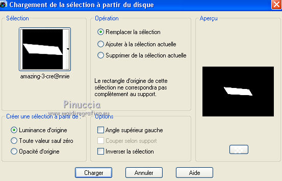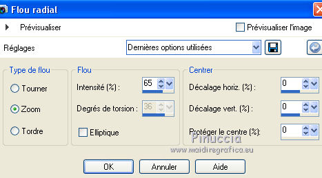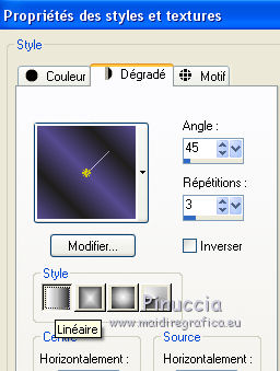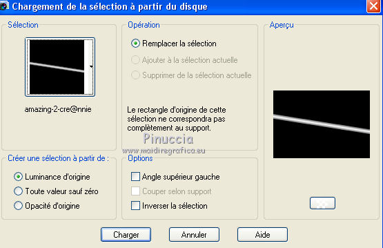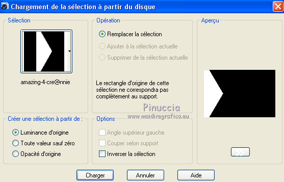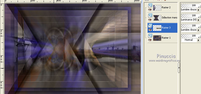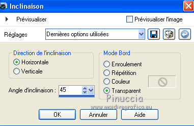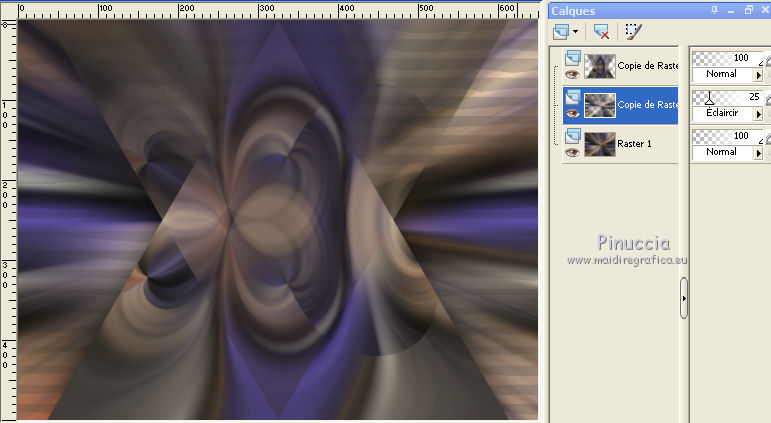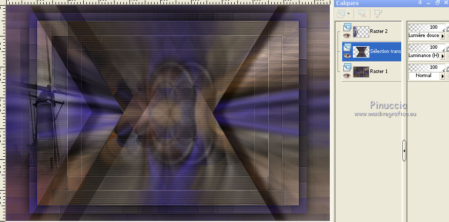 Ce tutoriel a été créé avec CorelX6 et traduit avec CorelX12, mais il peut également être exécuté avec les autres versions. Suivant la version utilisée, vous pouvez obtenir des résultats différents. Depuis la version X4, la fonction Image>Miroir a été remplacée par Image>Renverser horizontalement, et Image>Renverser avec Image>Renverser verticalement. Dans les versions X5 et X6, les fonctions ont été améliorées par la mise à disposition du menu Objets. Avec la nouvelle version X7, nous avons encore Image>Miroir et Image>Renverser/Retourner, mais avec nouvelles différences. Voir les détails à ce sujet ici Certaines dénominations ont changées entre les versions de PSP. Les plus frequentes dénominations utilisées: ![]() Traduction en italien ici Nécessaire pour réaliser ce tutoriel: Matériel ici Merci pour le tube Gabry Modules Externes: consulter, si nécessaire, ma section des filtres ici Carolaine and Sensibility - CS-LDots, Halloween 2 ici Flaming Pear - Flexify 2 ici Filters Unlimited 2.0 ici Toadies - Rasterline, What are you ici VanDerLee - Unplugged-x ici Filtres Toadies peuvent être utilisés seuls ou importés dans Filters Unlimited. voir comment le faire ici). Si un filtre est fourni avec cette icône, ![]() en fonction des couleurs utilisées, vous pouvez changer le mode mélange et l'opacité des calques. Dans les plus récentes versions de PSP, vous ne trouvez pas le dégradé d'avant plan/arrière plan ou Corel_06_029. Vous pouvez utiliser le dégradé des versions antérieures. Ici le dossier Dégradés de CorelX. Placer les sélections dans le dossier Sélections. 1. Placer en avant plan la couleur claire #564b90, et en arrière plan la couleur foncée #1f1e1c. ![]() 2. Ouvrir une nouvelle image transparente 650 x 500 pixels, et remplir du dégradé.3. Sélections>Sélectionner tout. Activer le tube woman-Gabry 104, Édition>Copier. ne pas fermer le tube; on va s'en servir plus tard Revenir sur votre travail et Édition>Coller dans la sélection. Sélections>Désélectionner tout. 4. Effets>Effets d'image>Mosaïque sans jointures, par défaut. ![]() 5. Réglage>Flou>Flou radial. ![]() 6. Calques>Dupliquer. Effets>Modules Externes>Flaming Pear - Flexify 2. ![]() 7. Calques>Dupliquer. Image>Renverser. Réduire l'opacité de ce calque à 50%. Calques>Fusionner>Fusionner le calque de dessous. 8. Effets>Effets 3D>Ombre portée, couleur noire. ![]() 9. Vous positionner sur le calque du bas de la pile. Calques>Dupliquer. 10. Effets>Modules Externes>Toadies - Rasterline. ![]() Placer le calque en mode Éclaircir et réduire l'opacitè à 25%. ![]() Effets>Effets de bords>Accentuer davantage. 11. Image>Rédimensionner, à 80%, redimensionner tous les calques décoché. 12. Effets>Effets géométriques>Inclinaison. ![]() 13. Calques>Fusionner>Tous. Édition>Copier. 14. Sélections>Sélectionner tout. Image>Ajouter des bordures, symétrique décoché, couleur d'arrière plan. ![]() 15. Sélections>Inverser. Édition>Coller dans la sélection. Sélections>Transformer la sélection en calque. Sélections>Désélectionner tout. 16. Effets>Modules Externes>VanDerLee - Unplugged-x - Defocus. ![]() Effets>Effets de bords>Accentuer davantage. 17. Sélections>Charger/Enregistrer une sélection>Charger à partir du disque. Chercher et charger la sélection amazing-1-cre@nnie. ![]() Sélections>Transformer la sélection en calque. 18. Effets>Modules Externes>Carolaine and Sensibility - CS-LDots. ![]() Sélections>Désélectionner tout. 19. Calques>Dupliquer. Image>Miroir. Image>Renverser. Calques>Fusionner>Fusionner le calque de dessous. 20. Calques>Nouveau calque raster. Sélections>Charger/Enregistrer une sélection>Charger à partir du disque. Chercher et charger la sélection amazing-2-cre@nnie. ![]() Remplir la sélection avec la couleur d'avant plan.21. Sélections>Charger/Enregistrer une sélection>Charger à partir du disque. Chercher et charger la sélection amazing-3-cre@nnie. la nouvelle sélection remplacera la précédente ![]() Presser CANC sur le clavier ![]() Sélections>Désélectionner tout. 22. Calques>Dupliquer. Image>Renverser. Calques>Fusionner>Tous. 23. Édition>Copier. Éventuellement, pour précaution: Édition>Coller comme nouvelle image, et minimiser l'image. Vous devrez garder en mémoire l'image jusqu'à l'étape 28. Si nécessaire, vous pourrez la récopier. Sélections>Sélectionner tout. 24. Image>Ajouter des bordures, 25 pixels, symétrique, couleur d'avant plan. Sélections>Inverser. Préparer en avant plan un dégradé de premier plan/arrière plan, style Linéaire. ![]() Remplir la sélection du dégradé.25. Effets>Effets de distorsion>Pixellisation. ![]() Effets>Effets de bords>Accentuer davantage. 26. Sélections>Inverser. Effets>Effets 3D>Ombre portée, comme précédemment. 27. Sélections>Sélectionner tout. Image>Ajouter des bordures, symétrique décoché, couleur d'arrière plan. ![]() 28. Sélections>Inverser. Édition>Coller dans la sélection. 29. Effets>Modules Externes>Toadies - What are you. ![]() 30. Sélections>Inverser. Effets>Effets 3D>Ombre portée, comme précédemment. 31. Calques>Nouveau calque raster. Sélections>Charger/Enregistrer une sélection>Charger à partir du disque. Chercher et charger la sélection amazing-4-cre@nnie. ![]() Placer à nouveau en avant plan la Couleur et remplir la sélection avec la couleur d'avant plan.32. Activer le tube molen - Édition>Copier. Revenir sur votre travail et Édition>Coller dans la sélection. Placer le calque en mode Lumière douce. 33. Effets>Effets 3D>Ombre portée, couleur noire. ![]() 34. Vous positionner sur le calque du bas de la pile. Sélections>Charger/Enregistrer une sélection>Charger à partir du disque. Chercher et charger la sélection amazing-5-cre@nnie. ![]() Sélections>Transformer la sélection en calque. 35. Effets>Modules Externes>Carolaine and Sensibility - Halloween2. ![]() 36. Effets>Effets 3D>Ombre portée, comme précédemment. Placer l