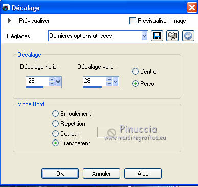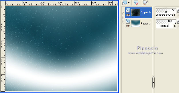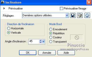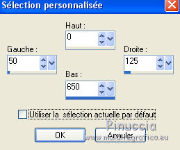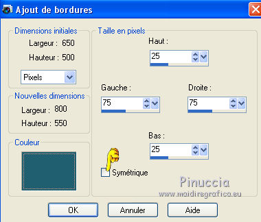 Ce tutoriel a été créé avec CorelX6 et traduit avec CorelX12, mais il peut également être exécuté avec les autres versions. Suivant la version utilisée, vous pouvez obtenir des résultats différents. Depuis la version X4, la fonction Image>Miroir a été remplacée par Image>Renverser horizontalement, et Image>Renverser avec Image>Renverser verticalement. Dans les versions X5 et X6, les fonctions ont été améliorées par la mise à disposition du menu Objets. Avec la nouvelle version X7, nous avons encore Image>Miroir et Image>Renverser/Retourner, mais avec nouvelles différences. Voir les détails à ce sujet ici Certaines dénominations ont changées entre les versions de PSP. Les plus frequentes dénominations utilisées: ![]() Traduction en italien ici Vos versions ici Nécessaire pour réaliser ce tutoriel: Matériel ici Pour le tube merci LuzCristina Modules Externes: consulter, si nécessaire, ma section des filtres ici Filters Unlimited 2.0 ici Alien Skin Eye Candy 5 Impact - Glass ici Flaming Pear - Glitterato ici Toadies - What are you ici Mehdi - Weaver, Sorting Tiles ici Mehdi - Wavy Lab 1.1 ici Filtres Toadies, Simple et VM Natural peuvent être utilisés seuls ou importés dans Filters Unlimited. voir comment le faire ici). Si un filtre est fourni avec cette icône, ![]() en fonction des couleurs utilisées, vous pouvez changer le mode mélange et l'opacité des calques. Placer le preset En cliquant sur le preset une ou deux fois (selon vos réglages) automatiquement il se placera directement dans le dossier Settings de Alien Skin Eye Candy. pourquoi un ou deux clic voir ici Placer les Sélections dans le dossier Sélections. 1. Ouvrir une nouvelle image transparente 650 x 500 pixels. 2. Placer en avant plan la couleur blanche #ffffff, et en arrière plan la couleur foncée #205f6f. ![]() 3. Effets>Modules Externes>Mehdi - Wavy Lab 1.1. Ce filtre travaille avec les couleurs de la palette: la première est la couleur d'arrière plan, la deuxième est la couleur d'avant plan. Garder les autres deux couleurs créées par le filtre. ![]() 4. Calques>Dupliquer. 5. Effets>Modules Externes>Flaming Pear - Glitterato. ![]() 6. Placer le calque en mode Lumière douce et réduire l'opacité à 50%. ![]() 7. Effets>Effets de bords>Accentuer davantage. 8. Calques>Fusionner>Fusionner le calque de dessous. 9. Image>Ajouter des bordures, symétrique décoché, couleur d'arrière plan. ![]() 10. Effets>Effets d'image>Mosaïque sans jointures. ![]() 11. Calques>Dupliquer. Image>Miroir. Image>Renverser. 12. Placer le calque en mode Lumière dure. 13. Calques>Fusionner>Fusionner le calque de dessous. 14. Activer l'outil Sélection ![]() (peu importe le type de sélection, parce que avec la sélection personnalisée vous obtenez toujours un rectangle), cliquer sur Sélection personnalisée ![]() et setter ces paramètres. ![]() Sélections>Transformer la sélection en calque. 15. Effets>Modules Externes>Flaming Pear - Glitterato, comme précédemment. Sélection>Désélectionner tout. 16. Effets>Modules Externes>Toadies - What are you. ![]() 17. Sélection>Sélectionner tout. Image>Ajouter des bordures, 50 pixels, symétrique, couleur d'arrière plan. 18. Effets>Effets d'image>Mosaïque sans jointures, comme précédemment. 19. Effets>Effets 3D>Ombre portée, couleur noire. ![]() Sélection>Désélectionner tout. 20. Effets>Effets d'image>Mosaïque sans jointures, comme précédemment. 21. Sélection personnalisée ![]() ![]() Sélections>Transformer la sélection en calque. 22. Effets>Effets de textures>Stores, couleur d'arrière plan. ![]() 23. Effets>Modules Externes>Alien Skin Eye Candy 5 Impact - Glass. sélectionner le preset birgit-cre@nnie-glass et ok. ![]() Ci-dessous les règlages en cas de problèmes avec le preset. ![]() Effets>Effets de bords>Accentuer. 25. Calques>Noveau calque raster. Sélection personnalisée ![]() ![]() 26. Remplir la sélection avec la couleur d'avant plan.Sélection>Désélectionner tout. 27. Effets>Modules Externes>Toadies - What are you. ![]() Effets>Effets de bords>Accentuer. 28. Sélection personnalisée comme précédemment![]() 29. Effets>Modules Externes>Toadies - What are you. ![]() Sélection>Désélectionner tout. 30. Effets>Effets de textures>Stores, comme précédemment, mais horizontal décoché. ![]() 31. Calques>Noveau calque raster. Sélections>Charger/Enregistrer une sélection>Charger à partir du disque. Chercher et charger la sélection birgit-1-cre@nnie. ![]() Remplir la sélection avec la couleur d'arrière plan.32. Effets>Modules Externes>Alien Skin Eye Candy 5 Impact - Glass, Sélectionner le preset Clear et ok. ![]() 33. Effets>Effets 3D>Ombre portée, couleur noire. ![]() Sélection>Désélectionner tout. 34. Vous positionner sur le calque du bas de la pile. Effets>Effets de bords>Accentuer. 35. Calques>Noveau calque raster. Sélections>Charger/Enregistrer une sélection>Charger à partir du disque. Chercher et charger la sélection birgit-2-cre@nnie. ![]() Sélections>Transformer la sélection en calque. Sélection>Désélectionner tout. 36. Effets>Modules Externes>Mehdi - Weaver. ![]() 37. Effets>Effets de bords>Dilater. Effets>Effets de bords>Accentuer. 38. Calques>Dupliquer. Image>Renverser. 39. Calques>Noveau calque raster. Sélections personnalisée ![]() ![]() Remplir la sélection avec la couleur d'avant plan.40. Sélections>Modifier>Contracter - 10 pixels. Presser CANC sur le clavier ![]() Sélection>Désélectionner tout. 41. Calques>Dupliquer. Effets>Effets d'image>Mosaïque sans jointures, par défaut. ![]() 42. Image>Miroir. 43. Activer le calque de dessous - raster 4. ![]() 44. Activer l'outil Baguette magique ![]() ![]() et cliquer dans le cadre pour le sélectionner. Remplir avec la couleur d'arrière plan.45. Sélections>Modifier>Contracter - 10 pixels. Riempi la sélection avec la couleur d'avant plan.46. Sélections>Modifier>Contracter - 10 pixels. Riempi avec la couleur d'arrière plan.47. Sélections>
