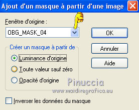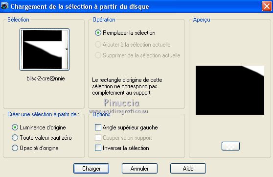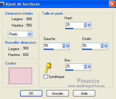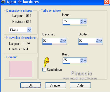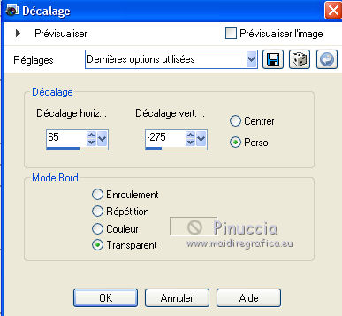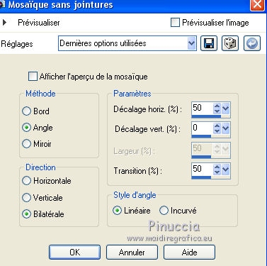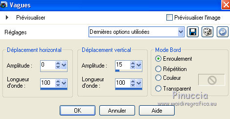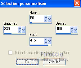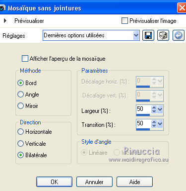 Ce tutoriel a été créé avec CorelX6 et traduit avec CorelX12, mais il peut également être exécuté avec les autres versions. Suivant la version utilisée, vous pouvez obtenir des résultats différents. Depuis la version X4, la fonction Image>Miroir a été remplacée par Image>Renverser horizontalement, et Image>Renverser avec Image>Renverser verticalement. Dans les versions X5 et X6, les fonctions ont été améliorées par la mise à disposition du menu Objets. Avec la nouvelle version X7, nous avons encore Image>Miroir et Image>Renverser/Retourner, mais avec nouvelles différences. Voir les détails à ce sujet ici Certaines dénominations ont changées entre les versions de PSP. Les plus frequentes dénominations utilisées: ![]() Traduction en italien ici Vos versions ici Nécessaire pour réaliser ce tutoriel: Matériel ici Merci pour le tube Hazal et pour les masques Occhiblu Modules Externes: consulter, si nécessaire, ma section des filtres ici AAA Frames - Foto Frame ici Mura's Meister - Perspective Tiling ici L&K's - L&K's Adonis ici L&K's - L&K's Elvida ici L&K's - L&K's Zitah ici Toadies - What are you ici Filters Unlimited 2.0 ici Filtres Toadies peuvent être utilisés seuls ou importés dans Filters Unlimited. voir comment le faire ici) mais ils peuvent obtenir des résultats différents. ![]() en fonction des couleurs utilisées, vous pouvez changer le mode mélange et l'opacité des calques. Placer les sélections dans le dossier Sélections. Ouvrir les masques dans PSP et les minimiser avec le reste du matériel. 1. Ouvrir une nouvelle image transparente 650 x 500 pixels. 2. Placer en avant plan la couleur claire #efced7, et en arrière plan la couleur foncée #608b33. ![]() 3. Remplir l'image transparente avec la couleur d'avant plan.4. Calques>Nouveau calque raster. Remplir avec la couleur d'arrière plan.5. Calques>Nouveau calque de masque>A partir d'une image. Ouvrir le menu deroulant sous la fenêtre d'origine et vous verrez la liste des images ouverts. Sélectionner le masque OBG_MASK_12. ![]() Calques>Fusionner>Fusionner le groupe. 6. Calques>Fusionner>Calques visibles. 7. Activer l'outil Sélection ![]() (peu importe le type de sélection, parce que avec la sélection personnalisée vous obtenez toujours un rectangle), cliquer sur Sélection personnalisée ![]() et setter ces paramètres. ![]() 8. Ouvrir le tube womantubes393-HaZal - Édition>Copier. Revenir sur votre travail et Édition>Coller comme nouveau calque. Positionner le tube sur la sélection.9. Sélections>Inverser. Presser CANC sur le clavier ![]() Sélections>Inverser. 10. Effets>Effets 3D>Ombre portée, couleur noire. ![]() 11. Effets>Effets 3D>Ombre portée, couleur noire. ![]() Sélections>Désélectionner tout. 12. Calques>Fusionner>Calques visibles. 13. Effets>Modules Externes>AAA Frames - Foto Frame. ![]() 14. Fenêtre>Dupliquer, et minimiser cette image: on va s'en servir plus tard. 15. Revenir sur votre travail. Image>Ajouter des bordures, symétrique décoché, couleur d'avant plan. ![]() 16. Effets>Effets d'image>Mosaïque sans jointures, par défaut. ![]() 17. Réglage>Flou>Flou gaussien - rayon 30. ![]() 18. Calques>Dupliquer. Calques>Nouveau calque de masque>A partir d'une image. Ouvrir le menu deroulant sous la fenêtre d'origine et sélectionner le masque OBG_Mask_04. ![]() Calques>Fusionner>Fusionner le groupe. ne vous inquiétez pas si vous aurez l'impression de rien voir 19. Effets>Effets de bords>Accentuer davantage. Effets>Effets de bords>Dilater. 20. Calques>Dupliquer. Image>Miroir. Image>Renverser. 21. Vous positionner sur le calque du bas de la pile. Sélections>Charger/Enregistrer une sélection>Charger à partir du disque. Chercher et charger la sélection bliss-1-cre@nnie. ![]() 22. Effets>Modules Externes>L&K landksiteofwonders - L&K's Adonis. ![]() 23. Sélections>Modifier la sélection, et la partie sélectionné deviendra rouge. ![]() 24. Image>Miroir. Image>Renverser, et la sélection sera en bas à droite. ![]() 25. Sélections>Modifier la sélection, et la sélection reviendra normale. ![]() 26. Effets>Modules Externes>L&K landksiteofwonders - L&K's Zitah. ![]() 27. Sélections>Charger/Enregistrer une sélection>Charger à partir du disque. Chercher et charger la sélection bliss-2-cre@nnie. ![]() 28. Effets>Modules Externes>L&K landksiteofwonders - L&K's Elvida. ![]() Sélections>Désélectionner tout. 29. Image>Ajouter des bordures, symétrique décoché, couleur d'avant plan. ![]() 30. Effets>Effets d'image>Mosaïque sans jointures. ![]() 31. Sélection personnalisée ![]() ![]() 32. Calques>Nouveau calque raster. Effets>Effets 3D>Ombre portée, couleur noire. ![]() Sélections>Désélectionner tout. 33. Effets>Effets d'image>Mosaïque sans jointures. ![]() 34. Effets>Modules Externes>Toadies - What are you, par défaut. ![]() 35. Calques>Dupliquer. Image>Miroir. 36. Effets>Effets de distorsion>Vagues. ![]() 37. Calques>Fusionner>Fusionner le calque de dessous. 38. Calques>Dupliquer. Calques>Fusionner>Fusionner le calque de dessous. 39. Édition>Coller comme nouveau calque (votre tube est toujours en mémoire). 40. Image>Redimensionner, à 150%, redimensionner tous les calques décoché. Déplacer à droite, avec la tête contre le bord supérieur.![]() Réduire l'opacité de ce calque à 30%. ![]() 41. Calques>Agencer>Déplacer vers le bas. 42. Vous positionner sur le calque du bas de la pile. 43. Calques>Dupliquer. Effets>Modules Externes>Mura's Meister - Perspective Shadow. ![]() 44. Effets>Effets 3D>Ombre portée, comme précédemment. 45. Calques>Agencer>Placer en haut de la pile. 46. Activer le cadre minimisé à l'étape 14. Édition>Copier. Revenir sur votre travail et Édition>Coller comme nouveau calque. 47. Image>Redimensionner, à 40%, redimensionner tous les calques décoché. 48. Effets>Effets d'image>Décalage. ![]() 49. Effets>Effets 3D>Ombre portée, comme précédemment. 50. Calques>Dupliquer. Image>Redimensionner, à 50%, redimensionne