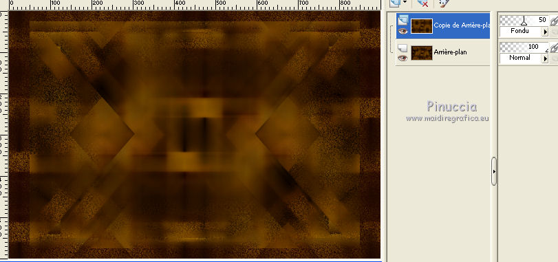 Ce tutoriel a été créé avec CorelX6 et traduit avec CorelX12, mais il peut également être exécuté avec les autres versions. Suivant la version utilisée, vous pouvez obtenir des résultats différents. Depuis la version X4, la fonction Image>Miroir a été remplacée par Image>Renverser horizontalement, et Image>Renverser avec Image>Renverser verticalement. Dans les versions X5 et X6, les fonctions ont été améliorées par la mise à disposition du menu Objets. Avec la nouvelle version X7, nous avons encore Image>Miroir et Image>Renverser/Retourner, mais avec nouvelles différences. Voir les détails à ce sujet ici Certaines dénominations ont changées entre les versions de PSP. Les plus frequentes dénominations utilisées: ![]() Traduction en italien ici Vos versions ici Nécessaire pour réaliser ce tutoriel: Matériel ici Pour les tubes merci Gabry et kitty Modules Externes: consulter, si nécessaire, ma section des filtres ici Filters Unlimited 2.0 ici Alien Skin Eye Candy 5 Impact - Perspective Shadow, Backlight, Extrude ici Mehdi - Weaver ici Mehdi - Kaleidoscope 2.1 ici Simple ici Simple (bonus) ici Filtres VM Natural et Mocks peuvent être utilisés seuls ou importés dans Filters Unlimited. voir comment le faire ici). Si un filtre est fourni avec cette icône, ![]() en fonction des couleurs utilisées, vous pouvez changer le mode mélange et l'opacité des calques. Placer les presets En cliquant sur le preset une ou deux fois (selon vos réglages) automatiquement il se placera directement dans le dossier Settings de Alien Skin Eye Candy. pourquoi un ou deux clic voir ici Placer les sélections dans le dossier Sélections. 1. Ouvrir une nouvelle image transparente 650 x 500 pixels. 2. Placer en avant plan la couleur claire #f8b80e, et en arrière plan la couleur foncée #210706. ![]() Remplir l'image transparente avec la couleur d'avant plan.3. Calques>Nouveau calque raster. Sélections>Sélectionner tout. Ouvrir le tube Gabry-woman 928 - Édition>Copier. minimiser le tube; on va s'en servir plus tard Revenir sur votre travail et Édition>Coller dans la sélection. Sélections>Désélectioner tout. 4. Effets>Effets d'image>Mosaïque sans jointures. ![]() 5. Réglage>Flou>Flou radial. ![]() 6. Calques>Fusionner>Fusionner le calque de dessous. 7. Effets>Effets d'image>Mosaïque sans jointures, comme précédemment. 8. Effets>Modules Externes>Mehdi - Weaver. ![]() 9. Calques>Dupliquer. Effets>Modules Externes>Mehdi - Kaleidoscope 2.1. ![]() 10. Placer le calque en mode Lumière douce. 11. Calques>Fusionner>Fusionner le calque de dessous. 12. Calques>Dupliquer. Image>Renverser. Image>Miroir. Réduire l'opacité de ce calque à 50%. 13. Image>Ajouter des bordures, symétrique décoché, couleur d'avant plan. ![]() 14. Sélections>Charger/Enregistrer une sélection>Charger à partir du disque. Chercher et charger la sélection brenna-1-cre@nnie. ![]() Sélections>Transformer la sélection en calque. Sélections>Désélectionner tout. 15. Effets>Effets d'image>Décalage. ![]() 16. Calques>Dupliquer. Image>Miroir. Calques>Fusionner>Fusionner le calque de dessous. 17. Calques>Dupliquer. Effets>Effets d'image>Mosaïque sans jointures, par défaut. ![]() 18. Calques>Fusionner>Fusionner le calque de dessous. 19. Sélections>Charger/Enregistrer une sélection>Charger à partir du disque. Chercher et charger la sélection brenna-2-cre@nnie. ![]() 20. Calques>Nouveau calque raster. Remplir la sélection avec la couleur d'arrière plan.Sélections>Désélectionner tout. 21. Effets>Modules Externes>Simple - Top Left Mirror. 22. Effets>Effets de textures>Stores, couleur d'avant plan. ![]() 22. Calques>Dupliquer. Effets>Modules Externes>Simple - Left Right Wrap. 23. Réglage>Flou>Moyen. ![]() 24. Image>Ajouter des bordures, symétrique décoché, couleur d'arrière plan. ![]() 25. Calques>Dupliquer. Effets>Modules Externes>Simple - Centre Tile. 26. Placer le calque en mode Fondu et réduire l'opacité à 50%. ![]() 27. Calques>Fusionner>Fusionner le calque de dessous. 28. Effets>Modules Externes>Simple - Left Right Wrap. 29. Image>Ajouter des bordures, comme précédemment. ![]() 30. Effets>Effets d'image>Mosaïque sans jointures. ![]() 31. Calques>Dupliquer. Effets>Modules Externes>Mura's Meister - Perspective Tiling. ![]() 32. Effets>Effets 3D>Ombre portée, couleur noire. ![]() 33. Vous positionner sur le calque du bas de la pile. Effets>Effets de bords>Éroder. Effets>Effets de bords>Accentuer davantage. Effets>Effets de bords>Accentuer. 34. Activer l'outil Sélection ![]() (peu importe le type de sélection, parce que avec la sélection personnalisée vous obtenez toujours un rectangle), cliquer sur Sélection personnalisée ![]() et setter ces paramètres. ![]() Sélections>Transformer la sélection en calque. 35. Calques>Nouveau calque raster. Ouvrir le tube mds10076_Island, Édition>Copier. Revenir sur votre travail et Édition>Coller dans la sélection. Placer le calque en mode Lumière douce. 36. Calques>Dupliquer. Fermers les calques du bas et du haut de la pile. ![]() Calques>Fusionner>Calques visibles. 37. Effets>Effets 3D>Ombre portée, comme précédemment. 38. Calques>Dupliquer. Sélections>Désélectionner tout. 39. Effets>Modules Externes>Mura's Meister - Perspective Tiling. ![]() 40. Calques>Agencer>Déplacer vers le haut. Calques>Afficher>Tous les calques (pour re-ouvrir les calques fermés). ![]() 41. Vous positionner sur le calque du bas de la pile. Sélection personnalisée ![]() ![]() Sélections>Transformer la sélection en calque. 42. Effets>Modules Externes>Simple - Centre Tile. 43. Sélections>Inverser. Effets>Effets 3D>Ombre portée, comme précédemment. 44. Calques>Nouveau calque raster. Sélections>Charger/Enregistrer une sélection>Charger à partir du disque. Chercher et charger la sélection brenna-3-cre@nnie. ![]() Remplir la sélection avec la couleur d'arrière plan.45. Effets>Modules Externes>Alien Skin Eye Candy 5 Impact - Extrude. sélectionner 