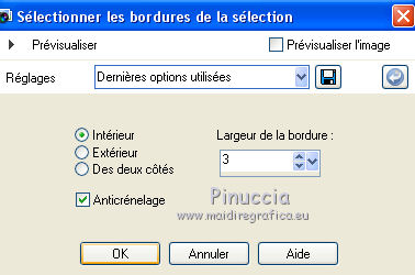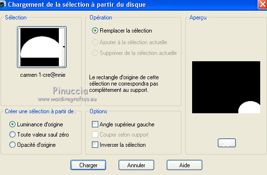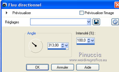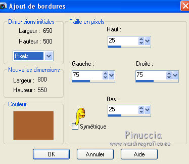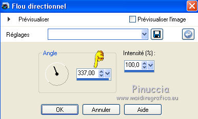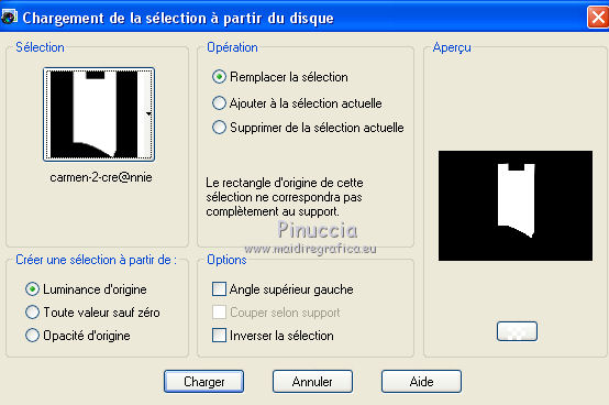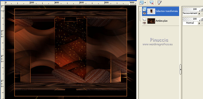 Ce tutoriel a été créé avec CorelX6 et traduit avec CorelX12, mais il peut également être exécuté avec les autres versions. Suivant la version utilisée, vous pouvez obtenir des résultats différents. Depuis la version X4, la fonction Image>Miroir a été remplacée par Image>Renverser horizontalement, et Image>Renverser avec Image>Renverser verticalement. Dans les versions X5 et X6, les fonctions ont été améliorées par la mise à disposition du menu Objets. Avec la nouvelle version X7, nous avons encore Image>Miroir et Image>Renverser/Retourner, mais avec nouvelles différences. Voir les détails à ce sujet ici Certaines dénominations ont changées entre les versions de PSP. Les plus frequentes dénominations utilisées: ![]() Traduction en italien ici Vos versions ici Nécessaire pour réaliser ce tutoriel: Matériel ici Merci pour les tubes Gabry Modules Externes: consulter, si nécessaire, ma section des filtres ici Filters Unlimited 2.0 ici VM Natural - Sparkle, Splash ici Mura's Meister - Perspective Tiling ici Mehdi - Sorting Tiles ici Filtres VM Natural peuvent être utilisés seuls ou importés dans Filters Unlimited. voir comment le faire ici). Si un filtre est fourni avec cette icône, ![]() en fonction des couleurs utilisées, vous pouvez changer le mode mélange et l'opacité des calques. Placer le preset Preset_Lights_carmen-cre@nnie dans le dossier Paramètres par défaut. Placer les sélections dans le dossier Sélections. 1. Ouvrir une nouvelle image transparente 650 x 500 pixels. 2. Placer en avant plan la couleur claire #a9612f, et en arrière plan la couleur foncée #040000. ![]() Remplir l'image transparente avec la couleur d'arrière plan.3. Sélections>Sélectionner tout. Ouvrir le tube gabry-woman 138 - Édition>Copier. ne pas fermer le tube: on va s'en servir plus tard Revenir sur votre travail et Édition>Coller dans la sélection. Sélections>Désélectionner tout. 4. Réglage>Flou>Flou radial. ![]() 5. Calques>Dupliquer. Image>Miroir. Image>Renverser. Réduire l'opacité de ce calque à 50%. Calques>Fusionner>Fusionner le calque de dessous. Effets>Effets de bords>Accentuer davantage. 5. Sélection>Charger/Enregistrer une sélection>Charger à partir du disque. Chercher et charger la sélection carmen-1-cre@nnie. ![]() 6. Effets>Modules Externes>Mehdi - Sorting Tiles. ![]() 7. Effets>Modules Externes>Filters Unlimited 2.0 - Convolution filters - Emboss(strong) ![]() Répéter le filtre une deuxième fois (il faut règler à nouveau emboss: 255, parce que Unlimited ne garde pas les règlages en mémoire). 8. Sélections>Transformer la sélection en calque. Effets>Effets 3D>Ombre portée. ![]() Sélections>Désélectionner tout. 9. Calques>Dupliquer. Image>Miroir. Image>Renverser. Calques>Fusionner>Fusionner le calque de dessous. 10. Calques>Dupliquer. Effets>Effets géométriques>Inclinaison. ![]() 11. Image>Miroir. Calques>Fusionner>Fusionner le calque de dessous. 12. Activer l'outil Baguette magique ![]() ![]() et cliquer sur la partie transparente au centre de l'image. ![]() 13. Vous positionner sur le calque du bas de la pile. Sélections>Transformer la sélection en calque. 14. Effets>Effets 3D>Ombre portée, couleur noire. ![]() 15. Sélections>Modifier>Contracter - 50 pixels. Effets>Effets 3D>Ombre portée, comme précédemment. Sélections>Désélectionner tout. 16. Image>Miroir. Calques>Fusionner>Calques visibles. 17. Édition>Copier. 18. Sélections>Sélectionner tout. Image>Ajouter des bordures, symétrique décoché, couleur d'avant plan. ![]() 19. Sélection>Inverser. Édition>Coller dans la sélection. 20. Sélection>Inverser. Effets>Effets d'image>Mosaïque sans jointures, par défaut. ![]() 21. Effets>Effets 3D>Ombre portée, comme précédemment. 22. Sélections>Modifier>Sélectionner les bordures de la sélection. ![]() Remplir la sélection avec la couleur d'avant plan.Sélections>Désélectionner tout. 23. Image>Ajouter des bordures, 3 pixels, symétrique, couleur d'avant plan. Image>Ajouter des bordures, symétrique décoché, couleur d'arrière plan. ![]() 24. Effets>Effets d'image>Mosaïque sans jointures ![]() 25. Calques>Dupliquer. Effets>Modules Externes>Mura's Meister - Perspective Tiling. ![]() 26. Édition>Copier. Vous positionner sur le calque du bas de la pile. 27. Effets>Effets d'éclairage>Projecteurs. sélectionner le preset carmen-cre@annie et ok. ![]() 28. Image>Ajouter des bordures, symétrique décoché, couleur d'arrière plan. ![]() 29. Édition>Coller comme nouveau calque. Effets>Effets d'image>Décalage. ![]() 30. Sélections>Sélectionner tout. Image>Ajouter des bordures, symétrique décoché, couleur d'arrière plan. ![]() Sélection>Inverser. 31. Effets>Modules Externes>VM Natural - Sparkle. ![]() 32. Effets>Modules Externes>VM Natural - Splash. ![]() 33. Sélection>Inverser. Sélections>Modifier>Sélectionner les bordures de la sélection, comme précédemment. Remplir la sélection avec la couleur d'avant plan.34. Sélection>Charger/Enregistrer une sélection>Charger à partir du disque. Chercher et charger la sélection carmen-2-cre@nnie. ![]() 35. Effets>Modules Externes>VM Natural - Sparkle, comme précédemment. Sélections>Transformer la sélection en calque. Sélections>Désélectionner tout. Placer le calque en mode Recouvrement. ![]() 36. Ouvrir le tube Gabry-varie ornamenti-10, - Édition>Copier. Revenir sur votre travail et Édition>Coller comme nouveau calque. Image>Redimensionner, à 80%, redimensionner tous les calques décoché. Déplacer le tube en bas à gauche (voir mon exemple).37. Calques>Dupliquer. Réglage>Flou>Flou directionnel. ![]() Placer le calque en mode Multiplier. Calques>Agencer>Déplacer vers le bas. 38. Vous positionner sur le calque du haut de la pile. Effets>Effets 3D>Ombre portée, comme précédemment. 39. Activer à nouveau le tube Gabry-woman138, - Édition>Copier. Revenir sur votre travail et Édition>Coller comme nouveau calque. Image>Redimensionner, à 90%, re