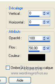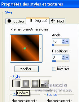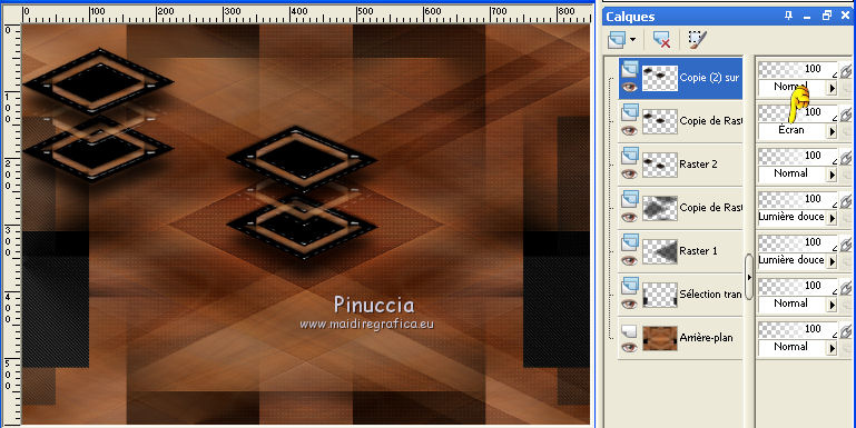 Ce tutoriel a été créé avec CorelX6 et traduit avec CorelX12, mais il peut également être exécuté avec les autres versions. Suivant la version utilisée, vous pouvez obtenir des résultats différents. Depuis la version X4, la fonction Image>Miroir a été remplacée par Image>Renverser horizontalement, et Image>Renverser avec Image>Renverser verticalement. Dans les versions X5 et X6, les fonctions ont été améliorées par la mise à disposition du menu Objets. Avec la nouvelle version X7, nous avons encore Image>Miroir et Image>Renverser/Retourner, mais avec nouvelles différences. Voir les détails à ce sujet ici Certaines dénominations ont changées entre les versions de PSP. Les plus frequentes dénominations utilisées: ![]() Traduction en italien ici Vos versions ici Nécessaire pour réaliser ce tutoriel: Matériel ici Pour le tube merci Kitty Modules Externes: consulter, si nécessaire, ma section des filtres ici Carolaine and Sensibility ici Deformation - Send me an angle ici Alien Skin Eye Candy 5 Impact - Extrude, Perspective Shadow ici Mura's Meister - Perspective Tiling ici Mura's Meister - Copies ici Flaming Pear - Flexify 2 ici Attention, le filtre Deformation utilisé dans ce tutoriel n'a rien à voir avec le filtre Déformation. Il s'agit d'une collection d'effets de déformation en circulation, effets qui font partie d'autres filtres. L'Effet Send me an angle se trouve dans le filtre Factory Gallery L ![]() en fonction des couleurs utilisées, vous pouvez changer le mode mélange et l'opacité des calques. Dans les plus récentes versions de PSP, vous ne trouvez pas le dégradé d'avant plan/arrière plan ou Corel_06_029. Vous pouvez utiliser le dégradé des versions antérieures. Ici le dossier Dégradés de CorelX. Placer les presets En cliquant sur le preset une ou deux fois (selon vos réglages) automatiquement il se placera directement dans le dossier Settings de Alien Skin Eye Candy. pourquoi un ou deux clic voir ici Placer les sélections dans les dossier Sélections. 1. Placer en avant plan la couleur claire #d2570a, et en arrière plan la couleur foncée #000000. ![]() 2. Ouvrir une nouvelle image transparente 650 x 500 pixels, et remplir avec la couleur d'arrière plan.3. Calques>Nouveau calque raster. Sélections>Sélectionner tout. Ouvrir le tube kitty-yellowhear - Édition>Copier. ne pas fermer le tube; on va s'en servir plus tard Revenir sur votre travail et Édition>Coller dans la sélection. Sélections>Désélectionner tout. 4. Effets>Effets d'image>Mosaïque sans jointures, par défaut. ![]() 5. Réglage>Flou>Flou radial. ![]() 6. Calques>Fusionner>Fusionner le calque de dessous. 7. Effets>Modules Externes>Déformation - Send me an angle. ![]() 8. Calques>Dupliquer. Image>Miroir. Réduire l'opacité de ce calque à 50%. Calques>Fusionner>Fusionner le calque de dessous. 9. Calques>Dupliquer. Image>Renverser. Réduire l'opacité de ce calque à 50%. Calques>Fusionner>Fusionner le calque de dessous. 10. Effets>Effets de bords>Accentuer davantage. 11. Image>Ajouter des bordures, symétrique décoché, couleur d'arrière plan. ![]() 12. Effets>Effets d'image>Mosaïque sans jointures. ![]() 13. Calques>Dupliquer. Image>Miroir. Réduire l'opacité de ce calque à 50%. Calques>Fusionner>Fusionner le calque de dessous. 14. Calques>Nouveau calque raster. Sélections>Charger/Enregistrer une sélection>Charger à partir du disque. Chercher et charger la sélection cinzia-1-cre@nnie. ![]() Remplir la sélection avec la couleur d'arrière plan.Sélections>Désélectionner tout. 15. Effets>Modules Externes>Carolaine and Sensiblity - CS-Ldots. ![]() 16. Réduire l'opacité de ce calque à 40%. Effets>Effets de bords>Accentuer. 17. Calques>Dupliquer. 18. Effets>Effets d'image>Décalage. ![]() 19. Calques>Fusionner>Fusionner le calque de dessous. 20. Placer le calque en mode Lumière douce. 21. Calques>Dupliquer. 22. Effets>Effets d'image>Mosaïque sans jointures, comme précédemment. 23. Image>Miroir. Vous positionner sur le calque du bas de la pile. Activer l'outil Baguette magique ![]() ![]() et cliquer dans les deux parties noires pour les sélectionner. ![]() Sélections>Transformer la sélection en calque. Sélections>Désélectionner tout. 24. Effets>Modules Externes>Mura's Meister - Copies. ![]() 25. Effets>Effets géométriques>Cylindre horizontal. ![]() 26. Effets>Modules Externes>Carolaine and Sensibility - CS-Dlines. ![]() Réglage>Netteté>Netteté. 27. Vous positionner sur le calque du bas de la pile. Édition>Copier. 28. Calques>Nouveau calque raster. Sélections>Charger/Enregistrer une sélection>Charger à partir du disque. Chercher et charger la sélection cinzia-2-cre@nnie. ![]() Remplir la sélection avec la couleur d'arrière plan.29. Sélections>Modifier>Contracter - 10 pixels. Édition>Coller dans la sélection. Sélections>Modifier>Contracter - 10 pixels. Remplir la sélection avec la couleur d'arrière plan.30. Activer l'outil Baguette magique ![]() et cliquer sur le bord extérieur pour le sélectionner. ![]() Effets>Modules Externes>Alien Skin Eye Candy 5 Impact - Glass. Sélectionner le preset Clear et ok. ![]() Sélections>Désélectionner tout. 31. Calques>Agencer>Placer en haut de la pile. Calques>Dupliquer. Effets>Effets d'image>Décalage. ![]() 32. Image>Renverser. Calques>Fusionner>Fusionner le calque de dessous. 33. Effets>Effets 3D>Ombre portée, couleur noire. ![]() 34. Calques>Dupliquer. Effets>Effets d'image>Décalage. ![]() 35. Calques>Dupliquer. Effets>Effets d'image>Décalage, comme précédemment. 36. Placer le calque de la première copie en Écran. Si vous avez le menu des calques à droite, pour changer les propriétés n'est pas nécessaire activer le calque. pour visualiser le menu des calques, comme ci-dessous, voir qui ![]() 37. Vous positionner sur le calque du bas de la pile. Calques>Dupliquer. 38. Effets>Modules Externes>Mura's Meister - Perspective Tiling. ![]() 39. Sélections>Charger/Enregistrer une s