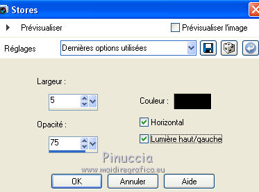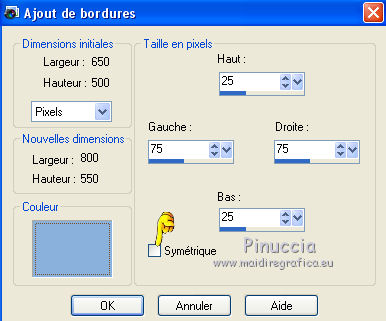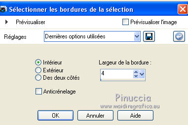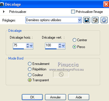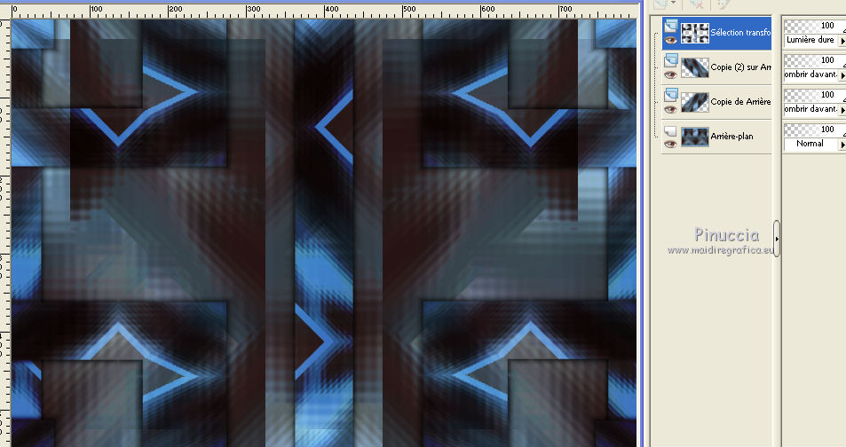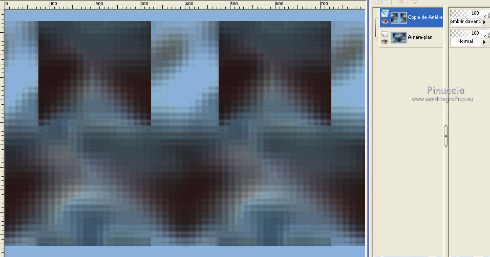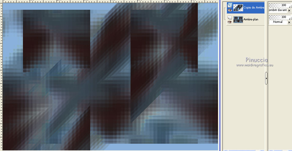 Ce tutoriel a été créé avec CorelX6 et traduit avec CorelX12, mais il peut également être exécuté avec les autres versions. Suivant la version utilisée, vous pouvez obtenir des résultats différents. Depuis la version X4, la fonction Image>Miroir a été remplacée par Image>Renverser horizontalement, et Image>Renverser avec Image>Renverser verticalement. Dans les versions X5 et X6, les fonctions ont été améliorées par la mise à disposition du menu Objets. Avec la nouvelle version X7, nous avons encore Image>Miroir et Image>Renverser/Retourner, mais avec nouvelles différences. Voir les détails à ce sujet ici Certaines dénominations ont changées entre les versions de PSP. Les plus frequentes dénominations utilisées: ![]() Traduction en italien ici Vos versions ici Nécessaire pour réaliser ce tutoriel: Matériel ici Modules Externes: consulter, si nécessaire, ma section des filtres ici Filters Unlimited 2.0 ici Mura's Meister - Perspective Tiling ici Plugin Galaxy ici Simple - Zoom out and flip ici Simple - Left right wrap (bonus) ici Filtres Toadies et Simple peuvent être utilisés seuls ou importés dans Filters Unlimited. voir comment le faire ici). Si un filtre est fourni avec cette icône, ![]() en fonction des couleurs utilisées, vous pouvez changer le mode mélange et l'opacité des calques. Placer le preset Emboss 3 dans le dossier Paramètres par défaut. Placer les sélections dans le dossier Sélections. 1. Ouvrir une nouvelle image transparente 650 x 500 pixels. 2. Placer en avant plan la couleur claire #8ab1dc, et en arrière plan la couleur foncée #261211. ![]() 3. Remplir l'image transparente avec la couleur d'avant plan.4. Sélections>Sélectionner tout. Activer le tube creepy1, Édition>Copier. Revenir sur votre travail et Édition>Coller dans la sélection. Sélections>Désélectionner tout. 5. Effets>Effets d'image>Mosaïque sans jointures, par défaut. ![]() 6. Réglage>Flou>Flou gaussien - rayon 20. ![]() 7. Effets>Modules Externes>The Plugin Site - Warp 1. ![]() 8. Image>Ajouter des bordures, symétrique décoché, couleur d'avant plan. ![]() 9. Calques>Dupliquer. Effets>Modules Externes>Simple - Left right wrap. Placer le calque en mode Assombrir davantage. ![]() 10. Calques>Fusionner>Fusionner le calque de dessous. 11. Calques>Dupliquer. Image>Renverser. 12. Effets>Effets géométriques>Inclinaison. ![]() Placer le calque en mode Assombrir davantage. ![]() 13. Calques>Dupliquer. Image>Miroir. Calques>Fusionner>Fusionner le calque de dessous. 14. Activer l'outil Sélection ![]() (peu importe le type de sélection, parce que avec la sélection personnalisée vous obtenez toujours un rectangle), cliquer sur Sélection personnalisée ![]() et setter ces paramètres. ![]() Sélections>Transformer la sélection en calque. 15. Effets>Effets 3D>Ombre portée, couleur noire. ![]() Sélections>Désélectionner tout. 16. Effets>Modules Externes>Simple - Zoom out and flip. 17. Calques>Dupliquer. Effets>Modules Externes>The Plugin Site - Instant Mirror. ![]() 18. Calques>Dupliquer. Image>Renverser. Calques>Fusionner>Fusionner le calque de dessous. Édition>Répéter Fusionner le calque de dessous. Placer le calque en mode Lumière dure. ![]() 19. Image>Ajouter des bordures, symétrique décoché, couleur d'arrière plan. ![]() 20. Effets>Effets d'image>Mosaïque sans jointures. ![]() Effets>Effets de bords>Accentuer. 21. Image>Ajouter des bordures, 25 pixels, symétrique, couleur d'arrière plan. 22. Effets>Effets d'image>Mosaïque sans jointures, par défaut. ![]() 23. Calques>Dupliquer. Effets>Modules Externes>Mura's Meister - Perspective Tiling. ![]() 24. Effets>Effets 3D>Ombre portée, comme précédemment. 25. Édition>Coller comme nouveau calque (le tube creepy1 est toujours en mémoire). 26. Image>Redimensionner, à 75%, redimensionner tous les calques décoché. 27. Effets>Effets d'image>Décalage. ![]() 28. Effets>Effets 3D>Ombre portée, couleur noire. ![]() Calques>Agencer>Déplacer vers le bas. 29. Vous positionner sur le calque du haut de la pile. Calques>Nouveau calque raster. 30. Sélections>Charger/Enregistrer une sélection>Charger à partir du disque. Chercher et charger la sélection creepy-1-cre@nnie. ![]() 31. Activer l'image Creepy, Édition>Copier. Revenir sur votre travail et Édition>Coller dans la sélection. 32. Sélections>Modifier>Sélectionner les bordures de la sélection. ![]() 33. Calques>Nouveau calque raster. Remplir la sélection avec la couleur d'arrière plan.Sélections>Désélectionner tout. 34. Effets>Effets de bords>Accentuer. Calques>Fusionner>Fusionner le calque de dessous. 35. Effets>Effets 3D>Ombre portée, comme précédemment. 36. Placer le calque en mode Luminance (héritée) et réduire l'opacité à 80%. ![]() 37. Effets>Filtre personnalisé - sélectionner le preset Emboss 3 et ok. ![]() 38. Activer le tube deco-creepy-1-cre@nnie, Édition>Copier. Revenir sur votre travail et Édition>Coller comme nouveau calque. 39. Effets>Effets d'image>Décalage. ![]() 40. Effets>Effets 3D>Ombre portée, comme précédemment. 41. Vous positionner sur le calque du bas de la pile. Édition>Copier. 42. Sélections>Sélectionner tout. Image>Ajouter des bordures, 75 pixels, symétrique, couleur d'arrière plan. Sélections>Inverser. 43. Édition>Coller dans la sélection. 44. Réglage>Flou>Flou gaussien, comme précédemment. 45. Effets>Effets de textures>Stores. ![]() 46. Sélections>Inverser. Effets>Effets 3D>Ombre portée, comme précédemment. Répéter Ombre portée, mais horizontal -25. ![]() 47. Calques>Nouveau calque raster. Sélections>Charger/Enregistrer une sélection>Charger à partir du disque. Chercher et charger la sélection creepy-2-cre@nnie. ![]() 48. Édition>Coller dans la sélection (l'image copiée à l'étape 41 est toujours en mémoire). Sélections>Désélectionner tout. Effets>Effets de bords>Accentuer. Effets>Effets de bords>Accentuer davantage. 49. Effets>Effets 3D>Ombre portée, couleur d'a