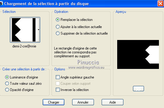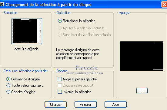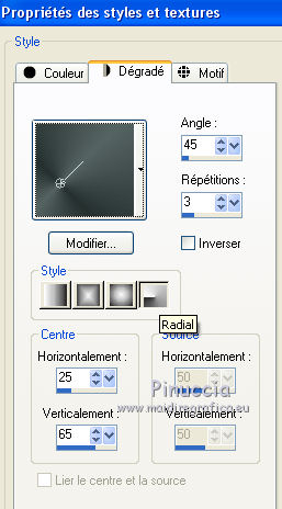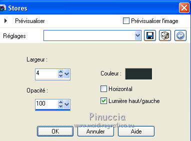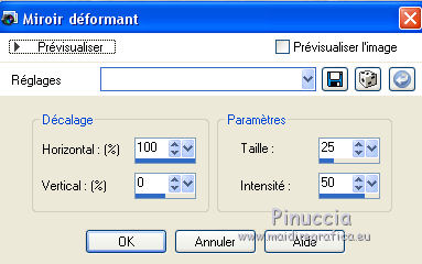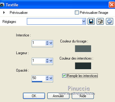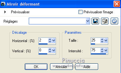 Ce tutoriel a été créé avec CorelX6 et traduit avec CorelX12, mais il peut également être exécuté avec les autres versions. Suivant la version utilisée, vous pouvez obtenir des résultats différents. Depuis la version X4, la fonction Image>Miroir a été remplacée par Image>Renverser horizontalement, et Image>Renverser avec Image>Renverser verticalement. Dans les versions X5 et X6, les fonctions ont été améliorées par la mise à disposition du menu Objets. Avec la nouvelle version X7, nous avons encore Image>Miroir et Image>Renverser/Retourner, mais avec nouvelles différences. Voir les détails à ce sujet ici Certaines dénominations ont changées entre les versions de PSP. Les plus frequentes dénominations utilisées: ![]() Traduction en italien ici Vos versions ici Nécessaire pour réaliser ce tutoriel: Matériel ici Pour le tube merci Tatyana-Radyga Modules Externes: consulter, si nécessaire, ma section des filtres ici Filters Unlimited 2.0 ici &<Bkg Kaleidoscope (da importare in Unlimited) ici Graphics Plus ici Toadies ici Simple ici Filtres Toadies, Graphics plus et Simple peuvent être utilisés seuls ou importés dans Filters Unlimited. voir comment le faire ici). Si un filtre est fourni avec cette icône, ![]() en fonction des couleurs utilisées, vous pouvez changer le mode mélange et l'opacité des calques. Dans les plus récentes versions de PSP, vous ne trouvez pas le dégradé d'avant plan/arrière plan ou Corel_06_029. Vous pouvez utiliser le dégradé des versions antérieures. Ici le dossier Dégradés de CorelX. Placer les sélections dans le dossier Sélections. 1. Placer en avant plan la couleur claire #556362, et en arrière plan la couleur foncée #25302f. ![]() Préparer en avant plan un dégradé de premier plan/arrière plan, style Radial. ![]() 2. Ouvrir une nouvelle image transparente 650 x 500 pixels, et remplir du dégradé.3. Effets>Modules Externes>Graphics Plus - Horizontal Mirror. ![]() 4. Effets>Modules Externes>Filters Unlimited 2.0 - &<Bkg Kaleidoscope> - @Mirrored & Scaled. ![]() 5. Calques>Dupliquer. Effets>Modules Externes>Simple - Half Wrap. Placer le calque en mode Lumière douce. Calques>Fusionner>Fusionner le calque de dessous. 6. Calques>Dupliquer. Effets>Modules Externes>Filters Unlimited 2.0 - &<Bkg Kaleidoscope> - Nomads Rug. ![]() Calques>Fusionner>Fusionner le calque de dessous. 7. Édition>Copier. Image>Ajouter des bordures, symétrique décoché, couleur d'avant plan. ![]() 8. Effets>Modules Externes>Filters Unlimited 2.0 - &<Bkg Kaleidoscope> - Nomads Rug, comme précédemment. ![]() 9. Sélections>Charger/Enregistrer une sélection>Charger à partir du disque. Chercher et charger la sélection shanna-1-cre@nnie. ![]() Sélections>Transformer la sélection en calque. 10. Effets>Effets de textures>Textile. Couleur du tissage: couleur d'avant plan. Couleur des interstices: couleur d'arrière plan. ![]() Sélections>Désélectionner tout. 11. Effets>Modules Externes>Simple - Top Left Mirror. 12. Effets>Modules Externes>Toadies - What are you. ![]() Effets>Effets de bords>Accentuer davantage. Réduire l'opacité de ce calque à 50%. 13. Activer l'outil Sélection ![]() (peu importe le type de sélection, parce que avec la sélection personnalisée vous obtenez toujours un rectangle), cliquer sur Sélection personnalisée ![]() et setter ces paramètres. ![]() Sélections>Transformer la sélection en calque. Sélections>Désélectionner tout. 14. Image>Redimensionner, à 76%, redimensionner tous les calques décoché. 15. Édition>Coller comme nouveau calque. Calques>Agencer>Déplacer vers le bas. 16. Effets>Effets 3D>Ombre portée, couleur noire. ![]() 17. Vous positionner sur le calque du haut de la pile. Calques>Dupliquer. 18. Effets>Effets géométriques>Inclinaison. ![]() 19. Calques>Dupliquer. Image>Miroir. Calques>Fusionner>Fusionner le calque de dessous. Réglage>Netteté>Netteté. 20. Édition>Copie Spéciale>Copier avec fusion. Éventuellement, pour précaution, Édition>Coller comme nouvelle image, et minimiser l'image. Elle doit être en mémoire jusqu'à l'étape 32. Si nécessaire, vous aurez la possibilité de la copier à nouveau 21. Sélections>Sélectionner tout. Image>Ajouter des bordures, 50 pixels, symétrique, couleur d'arrière plan. 22. Sélections>Inverser. Effets>Effets de textures>Textile. couleur du tissage: couleur d'avant plan. couleur des interstices: couleur d'arrière plan. ![]() Effets>Effets de bords>Accentuer. 23. Effets>Modules Externes>Graphics Plus - Cross Shadow, par défaut. ![]() 24. Effets>Effets 3D>Ombre portée, comme précédemment. 25. Calques>Nouveau calque raster. Sélection personnalisée ![]() ![]() 26. Édition>Coller dans la sélection. Sélections>Désélectionner tout. 27. Effets>Modules Externes>Toadies - What are you. ![]() 28. Effets>Effets géométrique>Cylindre vertical. ![]() Effets>Effets de distorsion>Miroir déformant. ![]() Effets>Effets de bords>Accentuer. 29. Effets>Effets 3D>Ombre portée, couleur d'avant plan, ombre sur le nouveau calque coché. ![]() 30. Rester positionné sur le calque de l'ombre. Effets>Effets de textures>Stores, couleur d'arrière plan. ![]() Placer le calque en mode Écran. 31. Sélections>Sélectionner tout. Image>Ajouter des bordures, symétrique décoché, couleur d'avant plan. ![]() 32. Sélections>Inverser. Édition>Coller dans la sélection (l'image copiée à l'étape 20 devrait étre encore en mémoire). 33. Effets>Effets géométriques>Cylindre vertical, comme précédemment. Image>Miroir. 34. Sélections>Inverser. Effets>Effets 3D>Ombre portée, couleur noire, ne pas oublier de désélectionner Ombre sur le nouveau calque. ![]() Sélections>Désélectionner tout. 35. Effets>Effets d'image>Mosaïque sans jointures. ![]() 36. Sélection personnalisée ![]() ![]() Sélections>Transformer la sélection en calque. Placer le calque en mode Exclusion. 37. Vous positionner sur le calque du bas de la pile. Sélections>Charger/Enreg