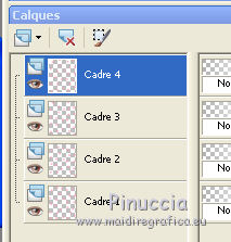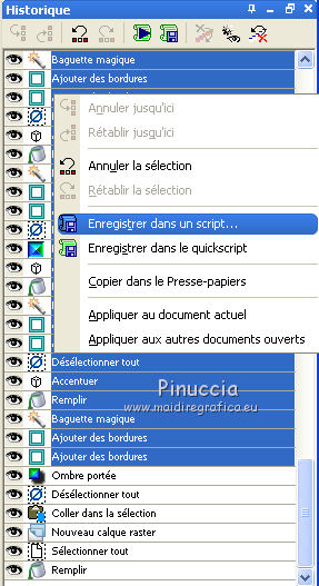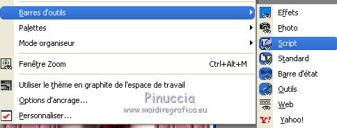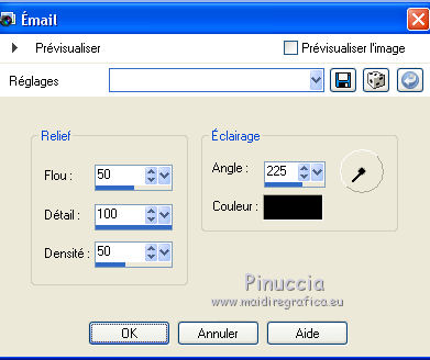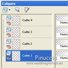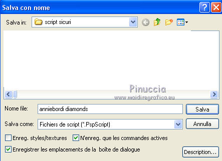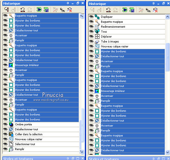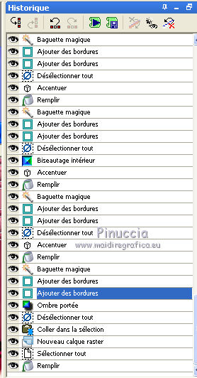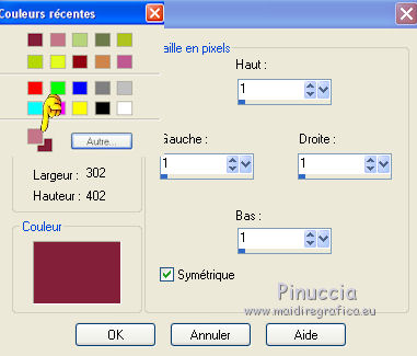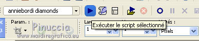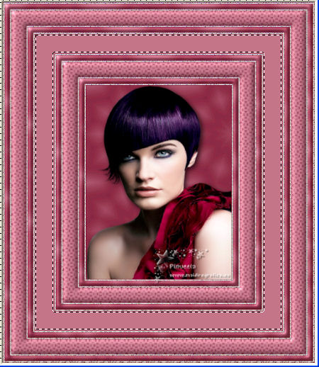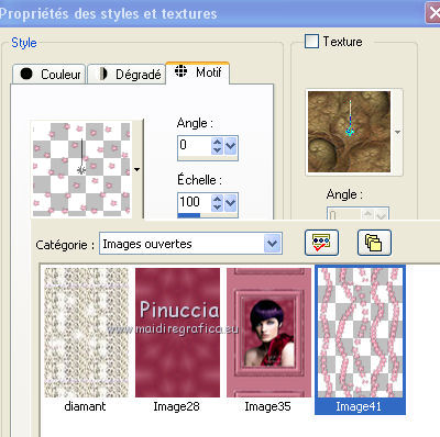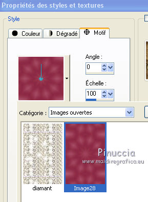 Ce tutoriel a été créé et traduit avec CorelX12, mais il peut également être exécuté avec les autres versions. Suivant la version utilisée, vous pouvez obtenir des résultats différents. Depuis la version X4, la fonction Image>Miroir a été remplacée par Image>Renverser horizontalement, et Image>Renverser avec Image>Renverser verticalement . Dans les versions X5 et X6, les fonctions ont été améliorées par la mise à disposition du menu Objets. Avec la nouvelle version X7, nous avons encore Image>Miroir et Image>Renverser/Retourner, mais avec nouvelles différences. Voir les détails à ce sujet ici Certaines dénominations ont changées entre les versions de PSP. Les plus frequentes dénominations utilisées: ![]() Traduction en italien ici Nécessaire pour réaliser ce tutoriel: Un tube à choix. Le reste du matériel ici Le tube de ma version est de Narah Pamplona Animation Shop ici ![]() Ouvrir la texture "Diamant" in PSP et la minimiser avec le reste du matériel. 1. Ouvrir une nouvelle image transparente 200 x 200 pixels, pour réaliser un motif. 2. Choisir deux couleurs de votre tube. et en arrière plan la couleur foncée. ![]() Préparer en avant plan un dégradé de premier plan/arrière plan, style Linéaire. ![]() Remplir l'image transparente du dégradé.4. Effets>Effets artistiques>Émail. ![]() 5. Effets>Effets de réflexion>Kaléïdoscope. ![]() Minimiser cette image. 6. Placer en avant plan Motif et chercher l'image sous la catégorie Images ouvertes. Sélectionner l'image, qui aura un numéro progressive des images ouverts jusqu'à ce moment, avec ces réglages. ![]() 7. Placer en arrière plan Motif, sous la catégorie Images ouvertes sélectionner le motif "Diamant". ![]() 8. Ouvrir une nouvelle image transparente 300 x 400 pixels, et remplir avec le motif d'avant plan.9. Sélections>Sélectionner tout. Calques>Nouveau calque raster. 10. Ouvrir votre tube et Édition>Copier. Revenir sur votre travail et Édition>Coller dans la sélection. Sélections>Désélectionner tout. 11. Effets>Effets 3D>Ombre portée. ![]() 12. Image>Ajouter des bordures, 1 pixel, symétrique, couleur d'arrière plan. Cliquer avec la touche droite de la souris sur la palette de la couleur, et vous aurez la table des couleurs récentes; en bas à gauche, les petites palettes des vos couleurs d'avant plan et arrière plan. (même si vous avez placé un dégradé ou un motif, sera disponible la couleur pleine) Pour placer la couleur du bord, cliquer sur sa petite palette. ![]() 13. Image>Ajouter des bordures, 2 pixels, symétrique, couleur claire. Activer l'outil Baguette magique ![]() ![]() et cliquer sur le dernier bord pour le sélectionner. Remplir avec le motif d'arrière plan.Effets>Effets de bords>Accentuer. Sélections>Désélectionner tout. 14. Image>Ajouter des bordures, 1 pixel, symétrique, couleur foncée. Image>Ajouter des bordures, 10 pixels, symétrique, couleur claire. Sélectionner ce bord avec la baguette magique ![]() et remplir avec le motif d'avant plan.Effets>Effets de bords>Accentuer. 15. Effets>Effets 3D>Bisautage intérieur. ![]() Sélections>Désélectionner tout. 16. Image>Ajouter des bordures, 1 pixel, symétrique, couleur foncée. Image>Ajouter des bordures, 2 pixels, symétrique, couleur claire. Sélectionner ce bord avec la baguette magique ![]() et remplir avec le motif d'arrière plan (diamant).Effets>Effets de bords>Accentuer. Sélections>Désélectionner tout. 17. Image>Ajouter des bordures, 1 pixel, symétrique, couleur foncée. Image>Ajouter des bordures, 30 pixels, symétrique, couleur claire. Sélectionner ce bord avec la baguette magique ![]() 18. Effets>Effets de textures>Textile. couleur du tissage: couleur foncée - couleur des interstices: couleur claire. ![]() Effets>Effets 3D>Bisautage intérieur, comme précédemment. Sélections>Désélectionner tout. 19. Image>Ajouter des bordures, 1 pixel, symétrique, couleur foncée. Image>Ajouter des bordures, 2 pixels, symétrique, couleur claire. Sélectionner ce bord avec la baguette magique ![]() et remplir avec le motif d'arrière plan (diamant).Effets>Effets de bords>Accentuer. Sélections>Désélectionner tout. 20. Image>Ajouter des bordures, 1 pixel, symétrique, couleur foncée. Image>Ajouter des bordures, 10 pixels, symétrique, couleur claire. Sélectionner ce bord avec la baguette magique ![]() et remplir avec le motif d'avant plan.Effets>Effets de bords>Accentuer. Effets>Effets 3D>Bisautage intérieur, comme précédemment. Sélections>Désélectionner tout. 21. Image>Ajouter des bordures, 1 pixel, symétrique, couleur foncée. Image>Ajouter des bordures, 2 pixels, symétrique, couleur claire. Sélectionner ce bord avec la baguette magique ![]() et remplir avec le motif d'arrière plan (diamant).Effets>Effets de bords>Accentuer. Sélections>Désélectionner tout. 22. Image>Ajouter des bordures, 1 pixel, symétrique, couleur foncée. Image>Ajouter des bordures, 40 pixels, symétrique, couleur claire. Image>Ajouter des bordures, 1 pixel, symétrique, couleur foncée. Image>Ajouter des bordures, 2 pixels, symétrique, couleur claire. Sélectionner le dernier bord avec la baguette magique ![]() et remplir avec le motif d'arrière plan (diamant).Effets>Effets de bords>Accentuer. Sélections>Désélectionner tout. 23. Image>Ajouter des bordures, 1 pixel, symétrique, couleur foncée. Image>Ajouter des bordures, 10 pixels, symétrique, couleur claire. Sélectionner ce bord avec la baguette magique ![]() et remplir avec le motif d'avant plan.Effets>Effets de bords>Accentuer. Effets>Effets 3D>Bisautage intérieur, comme précédemment. Sélections>Désélectionner tout. 24. Image>Ajouter des bordures, 1 pixel, symétrique, couleur foncée. Image>Ajouter des bordures, 2 pixels, symétrique, couleur claire. Sélectionner ce bord avec la baguette magique ![]() et remplir avec le motif d'arrière plan (diamant).Effets>Effets de bords>Accentuer. Sélections>Désélectionner tout. 25. Image>Ajouter