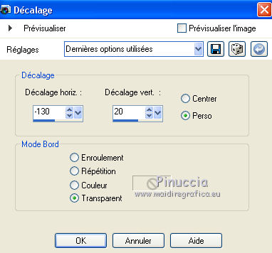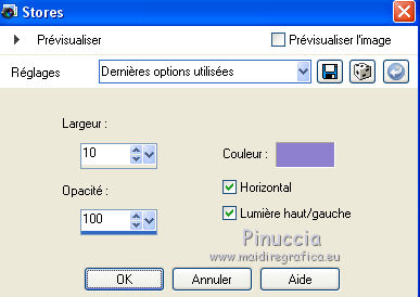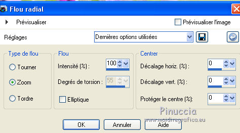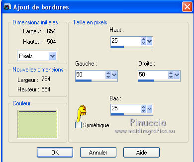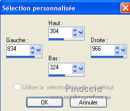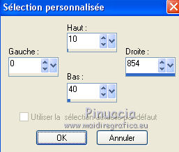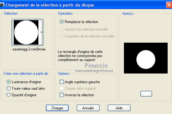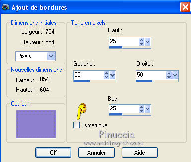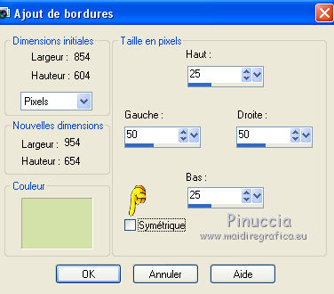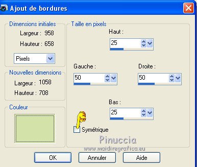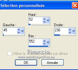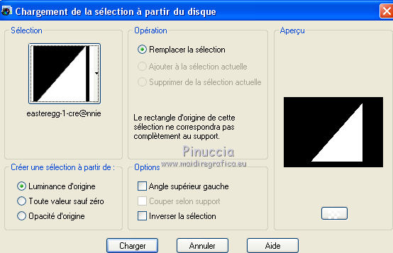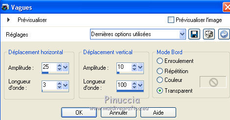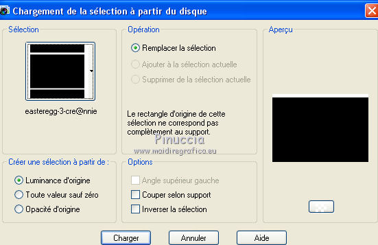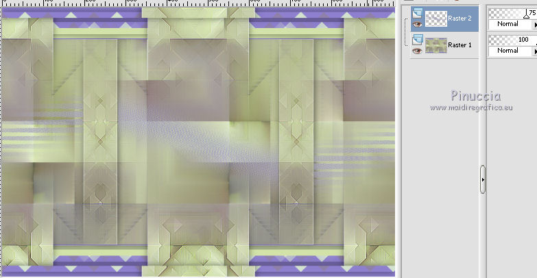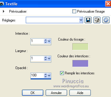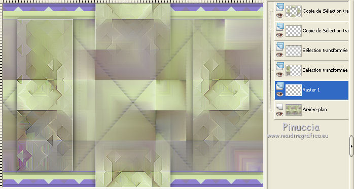 Ce tutoriel a été créé avec CorelX6 et traduit avec CorelX12, mais il peut également être exécuté avec les autres versions. Suivant la version utilisée, vous pouvez obtenir des résultats différents. Depuis la version X4, la fonction Image>Miroir a été remplacée par Image>Renverser horizontalement, et Image>Renverser avec Image>Renverser verticalement. Dans les versions X5 et X6, les fonctions ont été améliorées par la mise à disposition du menu Objets. Avec la nouvelle version X7, nous avons encore Image>Miroir et Image>Renverser/Retourner, mais avec nouvelles différences. Voir les détails à ce sujet ici Certaines dénominations ont changées entre les versions de PSP. Les plus frequentes dénominations utilisées: ![]() Traduction en italien ici Vos versions ici Nécessaire pour réaliser ce tutoriel: Matériel ici Pour le cadre merci Shanna Modules Externes: consulter, si nécessaire, ma section des filtres ici Mehdi - Sorting Tiles ici Mura's Meister - Perspective Tiling ici Alien Skin Eye Candy 5 Impact - Extrude ici ![]() en fonction des couleurs utilisées, vous pouvez changer le mode mélange et l'opacité des calques. Placer le preset En cliquant sur le preset une ou deux fois (selon vos réglages) automatiquement il se placera directement dans le dossier Settings de Alien Skin Eye Candy. pourquoi un ou deux clic voir ici Placer les sélections dans le dossier Sélections. 1. Ouvrir une nouvelle image transparente 650 x 500 pixels. 2. Placer en avant plan la couleur claire #d3e2a9, et en arrière plan la couleur foncée #8e80cf. ![]() 3. Remplir l'image transparente avec la couleur d'avant plan.4. Calques>Nouveau calque raster. Sélections>Sélectionner tout. 5. Activer le cadre Easter Egg. Activer l'outil Sélection , rectangle,et sélectionner le watermark au centre. Sélections>Inverser. Édition>Copier, et minimiser le cadre: on va s'en servir plus tard 6. Revenir sur votre travail et Édition>Coller dans la sélection. Sélections>Désélectionner tout. 7. Réglage>Flou>Flou radial. ![]() 8. Calques>Dupliquer. Placer le calque en mode Multiplier. 9. Calques>Fusionner>Calques visibles. 10. Effets>Modules Externes>Mehdi - Sorting Tiles. ![]() 11. Image>Ajouter des bordures, 2 pixels, symétrique, couleur d'arrière plan. 12. Image>Ajouter des bordures, symétrique décoché, couleur d'avant plan. ![]() 13. Image>Ajouter des bordures, symétrique décoché, comme précédemment, mais couleur d'arrière plan. ![]() 14. Effets>Effets d'image>Mosaïque sans jointures. ![]() 15. Activer l'outil Sélection ![]() (peu importe le type de sélection, parce que avec la sélection personnalisée vous obtenez toujours un rectangle), cliquer sur Sélection personnalisée ![]() et setter ces paramètres. ![]() 16. Effets>Modules Externes>Mehdi - Sorting Tiles. ![]() 17. Sélections>Transformer la sélection en calque. Effets>Effets 3D>Ombre portée, couleur noire. ![]() Sélections>Désélectionner tout. 18. Calques>Dupliquer. Image>Renverser. 19. Activer le calque du bas de la pile. Sélection personnalisée ![]() ![]() Sélections>Transformer la sélection en calque. 20. Effets>Effets 3D>Ombre portée, comme précédemment. 21. Effets>Modules Externes>Mehdi - Sorting Tiles, con i settaggi precedenti. Sélections>Désélectionner tout. 22. Effetti>Effetti di bordo>Aumenta di più. 23. Calques>Dupliquer. Effets>Effets d'image>Mosaïque sans jointures. ![]() 24. Calques>Dupliquer. Image>Miroir. Calques>Fusionner>Fusionner le calque de dessous. Calques>Agences>Placer en haut de la pile. 25. Calques>Nouveau calque raster. Sélections>Charger/Enregistrer une sélection>Charger à partir du disque. Chercher et charger la sélection easteregg-1-cre@nnie. ![]() 26. Effets>Effets 3D>Ombre portée, comme précédemment. Sélections>Désélectionner tout. 27. Effets>Effets de textures>Stores, couleur d'arrière plan. ![]() 28. Effets>Effets d'image>Mosaïque sans jointures. ![]() 29. Calques>Dupliquer. Image>Miroir. Calques>Fusionner>Fusionner le calque de dessous. Calques>Agences>Placer en bas de la pile (en effet, le calque se trouvera au dessus du calque d'arrière plan). ![]() 30. Sélections>Charger/Enregistrer une sélection>Charger à partir du disque. Chercher et charger la sélection easteregg-2-cre@nnie. ![]() Presser CANC sur le clavier CANC ![]() Sélections>Désélectionner tout. 31. Calques>Fusionner>Tous. 32. Édition>Copier. 33. Image>Ajouter des bordures, symétrique décoché, couleur d'avant plan. ![]() 34. Effets>Effets d'image>Mosaïque sans jointures, comme précédemment. 35. Sélections>Charger/Enregistrer une sélection>Charger à partir du disque. Chercher et charger la sélection easteregg-3-cre@nnie. ![]() 36. Édition>Coller dans la sélection. 37. Effets>Effets 3D>Ombre portée, comme précédemment. 38. Calques>Nouveau calque raster. Sélections>Charger/Enregistrer une sélection>Charger à partir du disque. Chercher et charger la sélection easteregg-4-cre@nnie. ![]() Remplir la sélection avec la couleur d'arrière plan.La sélection et dégradée; voici le résultat. ![]() Sélections>Désélectionner tout. 39. Effets>Effets de textures>Textile. couleur du tissage: couleur d'avant plan - couleur des interstices: couleur d'arrière plan. ![]() 40. Effets>Effets de distorsion>Vagues. ![]() 41. Sélections>Charger/Enregistrer une sélection>Charger à partir du disque. Chercher et charger la sélection easteregg-5-cre@nnie. ![]() Presser CANC sur le clavier ![]() Sélections>Désélectionner tout. Réduire l'opacité de ce calque à 75%. ![]() 42. Image>Ajouter des bordures, 2 pixels, symétrique, couleur d'arrière plan. 43. Édition>Copier. 44. Sélections>Sélectionner tout. Image>Ajouter des bordures, symétrique décoché, couleur d'avant plan. ![]() Sélections>Inverser. 45. Édition>Coller dans la sélection. 46. Réglage>Flou>Flou gaussien - rayon 50. ![]() 47. Effets>Effets 3D>Découpe. ![]() Sélections>Désélectionner tout. 48. Édition
