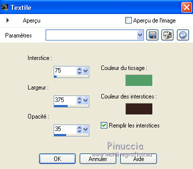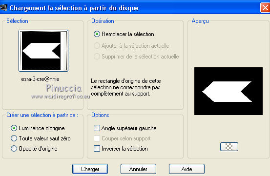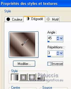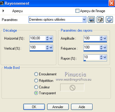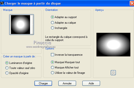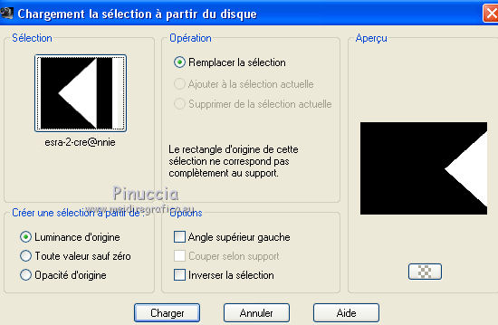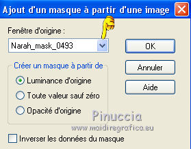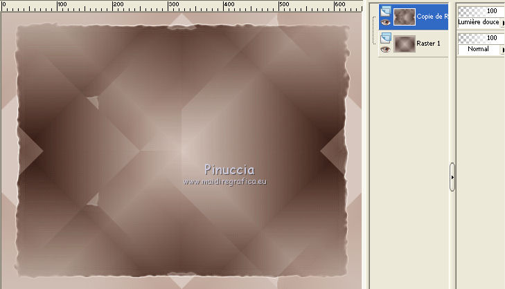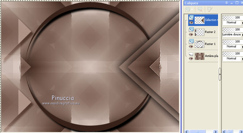 J'ai traduit ce tutoriel avec CorelX12, mais il peut également être exécuté avec les autres versions. Suivant la version utilisée, vous pouvez obtenir des résultats différents. Depuis la version X4, la fonction Image>Miroir a été remplacée par Image>Renverser horizontalement, et Image>Renverser avec Image>Renverser verticalement . Dans les versions X5 et X6, les fonctions ont été améliorées par la mise à disposition du menu Objets. Avec la nouvelle version X7, nous avons à nouveau Miroir/Retourner, mais avec nouvelles différences. Consulter, si vouz voulez, mes notes ici Certaines dénominations ont changées entre les versions de PSP. Les plus frequentes dénominations utilisées: ![]() Traduction en italien ici Vos versions ici Nécessaire pour réaliser ce tutoriel: Matériel qui Merci: pour le tube AnaRidzi et pour le masque Narah Garder le nom du tube. Le © appartient à l'artiste original. Garder le crédit de ceux qui ont créé le tube. Modules Externes: consulter, si nécessaire, ma section des filtres ici Filters Unlimited 2.0 ici DC Special ici Simple ici Filtres DC Special et Simple peuvent être utilisés seuls ou importés dans Filters Unlimited. voir comment le faire ici). Si un filtre est fourni avec cette icône, ![]() Si vous voulez utiliser vos propres couleurs, n'hésitez pas à changer le mode et l'opacité des calques Placer les sélections dans le dossier Sélections. Placer le masque 20-20 dans le dossier Masques. Ouvrir le deuxième masque dans PSP et le minimiser avec le reste du matériel. 1. Ouvrir une nouvelle image transparente 650 x 500 pixels. 2. Placer en avant plan la couleur claire #c9b9b1, et en arrière plan la couleur foncée #37211a. ![]() Préparer un dégradé d'avant plan/arrière plan, style Linéaire. ![]() 3. Remplir l'image transparente du dégradé.4. Calques>Dupliquer. Image>Miroir. Réduire l'opacité de ce calque à 50%. Calques>Fusionner>Fusionner le calque de dessous. 5. Effets>Modules Externes>DC Special - Jaggedge. couleur d'avant plan #c9b9b1 ![]() 6. Effets>Effets de bords>Accentuer davantage. Calques>Dupliquer. 7. Effets>Modules Externes>Simple - Blintz. Effets>Modules Externes>Simple - Pizza slice mirror. 8. Placer le calque en mode Lumière douce. ![]() Calques>Fusionner>Fusionner le calque de dessous. 9. Effes>Effets d'image>Mosaïque sans jointures. ![]() 10. Calques>Dupliquer. Image>Miroir. Réduire l'opacité de ce calque à 50%. 11. Image>Ajouter des bordures, symétrique décoché, couleur d'avant plan. ![]() 12. Effets>Effets d'image>Mosaïque sansa jointures, par défaut. ![]() 13. Calques>Nouveau calque raster. Activer l'outil Sélection ![]() (peu importe le type de sélection, parce que avec la sélection personnalisée vous obtenez toujours un rectangle), cliquer sur Sélection personnalisée ![]() et setter ces paramètres. ![]() Remplir la sélection avec la couleur d'arrière plan.Sélections>Désélectionner tout. 14. Effets>Modules Externes>Simple - Half wrap. 15. Effets>Effets géométriques>Cercle. ![]() 16. Effets>Effets 3D>Ombre portée, couleur noire. ![]() 17. Calques>Nouveau calque raster. Sélections>Charger/Enregistrer une sélection>Charger à partir du disque. Chercher et charger la sélection esra-1-cre@nnie. ![]() Placer en avant plan la Couleur, et remplir la sélection avec la couleur d'avant plan.Sélections>Désélectionner tout. 18. Effets>Modules Externes>Dc special - Book. ![]() 19. Placer le calque en mode Lumière douce. 20. Effets>Effets 3D>Ombre portée, comme précédemment. 21. Vous positionner sur le calque du bas de la pile. 22. Sélections>Charger/Enregistrer une sélection>Charger à partir du disque. Chercher et charger la sélection esra-2-cre@nnie. ![]() Sélections>Transformer la sélection en calque. 23. Effets>Effets 3D>Ombre portée, couleur noire. ![]() 24. Sélections>Modifier>Contracter - 25 pixels. 25. Effets>Effets 3D>Ombre portée, comme précédemment. Sélections>Désélectionner tout. 26. Calques>Agencer>Placer en haut de la pile. ![]() 27. Édition>Copie spéciale>Copier avec fusion. éventuellement, pour précaution: Édition>Coller comme nouvelle image, et minimiser cette image que vous pouvez copier si ne la trouvez plus en mémoire 28. Image>Ajouter des bordures, symétrique décoché, comme précédemment. ![]() 29. Effets>Effets d'image>Mosaïque sans jointures. ![]() 30. Sélections>Charger/Enregistrer une sélection>Charger à partir du disque. Chercher et charger la sélection esra-4-cre@nnie. ![]() 31. Sélections>Inverser. Effets>Effets d'image>Mosaïque sans jointures, par défaut. ![]() 32. Sélections>Inverser. Effets>Effets de textures>Stores - couleur d'avant plan. ![]() Sélections>Désélectionner tout. 33. Calques>Nouveau calque raster. Remplir avec la couleur d'avant plan.34. Calques>Nouveau calque de masque>A partir d'une image. Ouvrir le menu deroulant sous la fenêtre d'origine et vous verrez la liste des images ouverts. Charger le masque Narah_mask_0493. ![]() Calques>Fusionner>Fusionner le groupe. Réduire l'opacité de ce calque à 50%. 35. Édition>Coller comme nouveau calque (l'image en mémoire du point 27). 36. Sélections>Charger/Enregistrer une sélection>Charger à partir du disque. Chercher et charger la sélection esra-3-cre@nnie. ![]() Presser CANC sur le clavier ![]() Sélections>Désélectionner tout. 37. Effets>Effets 3D>Ombre portée, comme précédemment. 38. Caques>Charger/Enregistrer un masque>Charger à partir du disque. Chercher et charger le masque 20-20. ![]() Calques>Fusionner>Fusionner le groupe. 39. Image>Miroir. 40. Calques>Nouveau calque raster. Sélections>Charger/Enregistrer une sélection>Charger à partir du disque. Chercher et charger la sélection esra-3-cre@nnie. ![]() 41. Effets>Effets 3D>Ombre portée, comme précédemment. Sélections>Désélectionner tout. 42. Effets>Effets d'image>Mosaïque sans jointures, comme précédemment. 43. Placer en avant plan une couleur contrastante. pour l'e