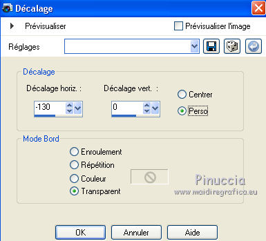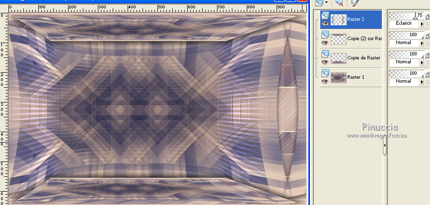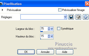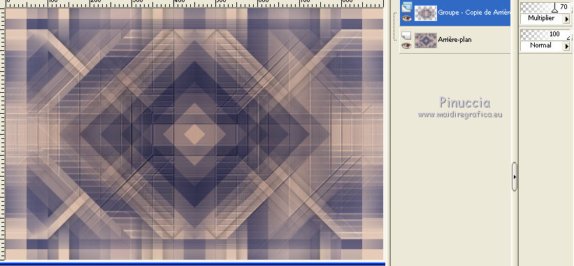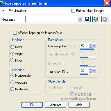 Ce tutoriel a été créé avec CorelX6 et traduit avec CorelX12, mais il peut également être exécuté avec les autres versions. Suivant la version utilisée, vous pouvez obtenir des résultats différents. Depuis la version X4, la fonction Image>Miroir a été remplacée par Image>Renverser horizontalement, et Image>Renverser avec Image>Renverser verticalement. Dans les versions X5 et X6, les fonctions ont été améliorées par la mise à disposition du menu Objets. Avec la nouvelle version X7, nous avons encore Image>Miroir et Image>Renverser/Retourner, mais avec nouvelles différences. Voir les détails à ce sujet ici Certaines dénominations ont changées entre les versions de PSP. Les plus frequentes dénominations utilisées: ![]() Traduction en italien ici Vos versions ici Nécessaire pour réaliser ce tutoriel: Matériel ici Pour le tube merci Min@ et Mou Modules Externes: consulter, si nécessaire, ma section des filtres ici Filters Unlimited 2.0 ici &<Bkg Designer sf10IV> - @Easy Corner UpperLeft (da importare in Unlimited) ici &<Bkg Kaleidoscope> - XTile maker 10 - Kaleidoscope Persian (da importare in Unlimited) ici Richard Rosenman - Pixelate ici ![]() en fonction des couleurs utilisées, vous pouvez changer le mode mélange et l'opacité des calques. Dans les plus récentes versions de PSP, vous ne trouvez pas le dégradé d'avant plan/arrière plan ou Corel_06_029. Vous pouvez utiliser le dégradé des versions antérieures. Ici le dossier Dégradés de CorelX. Placer les preset dans les dossier Paramètres par défaut. Placer le preset Emboss 3 dans le dossier Paramètres par défaut. Placer le masque 20-20 dans le dossier Masques. Placer les sélections dans le dossier Sélections. 1. Ouvrir une nouvelle image transparente 650 x 500 pixels. 2. Placer en avant plan la couleur claire #e7ccba, et en arrière plan la couleur foncée #47496f. ![]() 3. Préparer en avant plan un dégradé de premier plan/arrière plan, style Linéaire. ![]() 4. Remplir l'image transparente du dégradé.5. Effets>Modules Externes>Richard Rosenman - Pixelate. 6. Calques>Dupliquer. 7. Effets>Effets géométriques>Inclinaison. ![]() 8. Calques>Fusionner>Fusionner le calque de dessous. 9. Sélections>Charger/Enregistrer une sélection>Charger à partir du disque. Chercher et charger la sélection fatima-1-cre@nnie. ![]() Sélections>Transformer la sélection en calque. Sélections>Désélectionner tout. 10. Effets>Effets 3D>Ombre portée, couleur noire. ![]() 11. Calques>Dupliquer. Image>Miroir. Image>Renverser. Calques>Fusionner>Fusionner le calque de dessous. 12. Calques>Dupliquer. Image>Miroir. Calques>Fusionner>Fusionner le calque de dessous. 13. Effets>Effets d'image>Mosaïque sans jointures, par défaut. ![]() 14. Image>Ajouter des bordures, symétrique décoché, couleur d'arrière plan. ![]() 15. Effets>Effets d'image>Mosaïque sans jointures. ![]() 16. Effets>Modules Externes>Filters Unlimited 2.0 - &<Bkg Designers sf10IV> - @Easy Corner UpperLeft ![]() 17. Sélections>Charger/Enregistrer une sélection>Charger à partir du disque. Chercher et charger la sélection fatima-2-cre@nnie. ![]() Sélections>Transformer la sélection en calque. Sélections>Désélectionner tout. 18. Effets>Effets de distorsion>Pixelisation. ![]() 19. Effets>Effets de distorsion>Vent - vers la gauche, intensité 100. ![]() 20. Effets>Effets de bords>Accentuer davantage. 21. Effets>Effets de bords>Dilater. 22. Calques>Dupliquer. Image>Miroir. 23. Effets>Effets géométriques,Inclinaison, comme précédemment. 24. Calques>Dupliquer. Image>Renverser. 25. Image>Ajouter des bordures, symétrique décoché, couleur d'avant plan. ![]() 26. Effets>Modules Externes>Filters Unlimited 2.0 - &<Bkg Kaleidoscope> - XTile maker 1.0. ![]() 27. Calques>Dupliquer. 28. Effets>Modules Externes>Filters Unlimited 2.0 - &<Bkg Kaleidoscope> - Kaleidoscope persian. ![]() 29. Calques>Charger/Enregistrer un masque>Charger à partir du disque. Chercher et charger le masque 20-20. ![]() Calques>Fusionner>Fusionner le groupe. 30. Effets>Filtre personnalisé - sélectionner le preset Emboss 3 et ok. ![]() Édition>Répéter Filtre personnalisé. 31. Placer le calque en mode Multiplier et réduire l'opacité à 70%. ![]() 32. Calques>Fusionner>Fusionner le calque de dessous. 33. Calques>Dupliquer. 34. Effets>Effets de distorsion>Distorsion de l'objectif. ![]() 35. Effets>Effets 3D>Ombre portée, comme précédemment. 36. Vous positionner sur le calque du bas de la pile. Réglage>Flou>Moyen. ![]() 37. Image>Rotation à droite. 38. Effets>Effets de distorsion>Pixelisation, comme précédemment. 39. Effets>Effets de bords>Accentuer davantage. Effets>Effets de bords>Dilater. 40. Image>Rotation à gauche. 41. Effets>Effets géométriques>Inclinaison. ![]() 42. Calques>Dupliquer. Image>Miroir. Placer le calque en mode Lumière douce. 43. Image>Ajouter des bordures, comme précédemment. ![]() 44. Effets>Effets d'image>Mosaïque sans jointures. ![]() 45. Calques>Dupliquer. 46. Presser la touche K pour activer l'outil Sélecteur ![]() ouvrir le menu des preset et sélectionner le preset fatima-cre@nnie-1 ![]() Résultat. ![]() Touche M pour désélectioner l'outil. 47. Effets>Effets 3D>Ombre portée, couleur noire. ![]() 48. Calques>Dupliquer. Image>Renverser. 49. Ouvrir le tube deco-1-fatima - Édition>Copier. Revenir sur votre travail et Édition>Coller comme nouveau calque. 50. Image>Rotation libre - 90 degrés à gauche. ![]() 51. Effets>Effets d'image>Décalage. ![]() 52. Touche K pour activer l'outil Sélecteur ![]() Ouvrir le menu des preset et sélectionner le preset fatima-cre@nnie-2 ![]() Résultat. ![]() Touche M pour désélectionner l'outil. 53. Calques>Dupliquer. Image>Miroir. 54. Effets>Effets d'image>Décalage. ![]() 55. Sélections>Charger/Enregistrer une sélection>Charger à partir du disque. Chercher et charger la sélection fatima-3-cre@nnie. ![]() Presser CANC sur le clavier ![]() Sélections>Désélectionner tout. 56. Calques