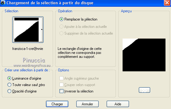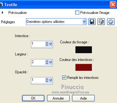Ce tutoriel a été créé avec CorelX6 et traduit avec CorelX12, mais il peut également être exécuté avec les autres versions. Suivant la version utilisée, vous pouvez obtenir des résultats différents. Depuis la version X4, la fonction Image>Miroir a été remplacée par Image>Renverser horizontalement, et Image>Renverser avec Image>Renverser verticalement. Dans les versions X5 et X6, les fonctions ont été améliorées par la mise à disposition du menu Objets. Avec la nouvelle version X7, nous avons à nouveau Miroir/Retourner, mais avec nouvelles différences. Consulter, si vouz voulez, mes notes ici Certaines dénominations ont changées entre les versions de PSP. Les plus frequentes dénominations utilisées: ![]() Traduction en italien ici Vos versions ici Nécessaire pour réaliser ce tutoriel: Matériel ici Pour le tube merci Jeanne Garder le nom du tube. Le © appartient à l'artiste original. Garder le crédit de ceux qui ont créé le tube. Modules Externes: consulter, si nécessaire, ma section des filtres ici VanDerLee - Unplugged-X ici ![]() Placer les sélections dans le dossier Sélections. 1. Ouvrir une nouvelle image transparente 650 x 500 pixels. 2. Placer en avant plan la couleur claire #7b0a08, et en arrière plan la couleur foncée #111111. ![]() Préparer un dégradé de premier plan/arrière plan, style Radial. ![]() 3. Remplir l'image transparente du dégradé.4. Calques>Dupliquer. Image>Miroir. Image>Renverser. 5. Placer le calque en mode Lumière dure. Calques>Fusionner>Fusionner le calque de dessous. 6. Calques>Dupliquer. Image>Miroir. 7. Image>Redimensionner, à 80%, redimensionner tous les calques décoché. Effets>Effets de bords>Accentuer. Calques>Fusionner>Fusionner le calque de dessous. 8. Calques>Dupliquer. Effets>Modules Externes>VanDerLee - Unplugged-X - Wavemaker. ![]() 8. Placer le calque en mode Écran. ![]() Calques>Fusionner>Fusionner le calque de dessous. 9. Sélections>Charger/Enregistrer une sélection>Charger à partir du disque. Chercher et charger la sélection franzisca-1-cre@nnie. ![]() Sélections>Transformer la sélection en calque. Sélections>Désélectionner tout. 10. Effets>Modules Externes>VanDerLee - Unplugged-X - Defocus. ![]() Effets>Effets de bords>Accentuer davantage. 12. Calques>Dupliquer. Image>Miroir. Image>Renverser. 13. Calques>Fusionner>Tous. Édition>Copier. 14. Sélections>Sélectionner tout. Image>Ajouter des bordures, symétrique décoche, couleur d'arrière plan. ![]() 15. Sélections>Inverser. Sélections>Modifier>Contracter - 10 pixels. 16. Édition>Coller dans la sélection. 17. Image>Miroir. Sélections>Désélectionner tout. 18. Activer l'outil Baguette magique ![]() ![]() et cliquer sur les deux bords foncés pour les sélectionner. ![]() 19. Effets>Effets de textures>Textile couleur du tissage: couleur d'arrière plan - couleur des interstices: couleur d'avant plan. ![]() 20. Sélections>Transformer la sélection en calque. Sélections>Désélectionner tout. 21. Effets>Modules Externes>VanDerLee - Unplugged-X - Spiral. ![]() 22. Placer le calque en mode Lumière douce et réduire l'opacité à 50%. ![]() 23. Vous positionner sur le calque du bas de la pile. Activer l'outil Sélection ![]() (peu importe le type de sélection, parce que avec la sélection personnalisée vous obtenez toujours un rectangle), cliquer sur Sélection personnalisée ![]() et setter ces paramètres. ![]() Sélections>Transformer la sélection en calque. Sélections>Désélectionner tout. 24. Image>Rotation libre - 90 degrés à gauche. ![]() 25. Effets>Effets géometriques>Perspective horizontale. ![]() 26. Effets>Effets d'image>Décalage. ![]() 27. Calques>Dupliquer. Image>Miroir. Image>Renverser. Calques>Fusionner>Fusionner le calque de dessous. 28. Effets>Effets 3D>Ombre portée, couleur noire. ![]() 29. Effets>Modules Externes>VanDerLee - Unplugged-X - Interlace. ![]() 30. Effets>Effets géometriques>Inclinaison. ![]() 31. Calques>Dupliquer. Image>Miroir. Calques>Fusionner>Fusionner le calque de dessous. 32. Calques>Nouveau calque raster. Sélections>Charger/Enregistrer une sélection>Charger à partir du disque. Chercher et charger la sélection franzisca-2-cre@nnie. ![]() Remplir la sélection avec la couleur d'arrière plan.Sélections>Désélectionner tout. 33. Effets>Effets de distorsion>Vagues. ![]() 34. Calques>Dupliquer. Image>Miroir. Image>Renverser. Calques>Fusionner>Fusionner le calque de dessous. 35. Effets>Effets de distorsion>Vent, vers la gauche, intensité 75. ![]() 36. Vous positionner sur le calque du bas de la pile. ![]() Activer le tube JVDE_MondRoos - Édition>Copier. Revenir sur votre travail et Édition>Coller comme nouveau calque. 37. Effets>Effets d'image>Décalage. ![]() Placer le calque en mode Lumière douce, et réduire l'opacité à 50%. ![]() Effets>Effets de bords>Accentuer. 38. Calques>Nouveau calque raster. Sélection personnalisée ![]() ![]() Remplir la sélection avec la couleur d'arrière plan.39. Effets>Effets de textures>Textile, comme précédemment. Sélections>Désélectionner tout. 40. Effets>Modules Externes>VanDerLee - Unplugged-X - Defocus. ![]() Effets>Effets de bords>Accentuer. Vous devriez avoir ce-ci. ![]() 41. Sélections>Sélectionner tout. Image>Ajouter des bordures, 25 pixels, symétrique, couleur d'arrière plan. 42. Sélections>Inverser. Effets>Effets de textures>Textile, comme précédemment. Effets>Effets de bords>Accentuer. 43. Sélections>Inverser. Effets>Effets 3D>Ombre portée, comme précédemment. 44. Sélections>Sélectionner tout. Image>Ajouter des bordures, symétrique décoche, couleur d'arrière plan. ![]() 45. Sélections>Inverser. Effets>Plugins>VanderLee - Unplugged X - Defocus, comme précédemment. Sélections>Inverser. 46. Effets>Effets 3D>Ombre portée, comme précédemment. Sélections>Désélectionner tout. 47. Activer le tube Franzisca - Édition>Copier. Revenir sur votre travail et Édition>coller comme nouveau calque. Déplacer le tube en ba