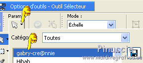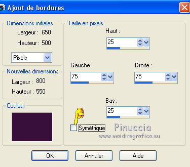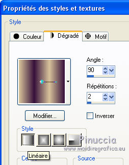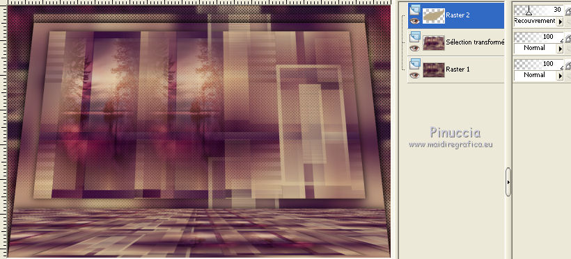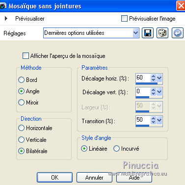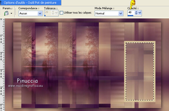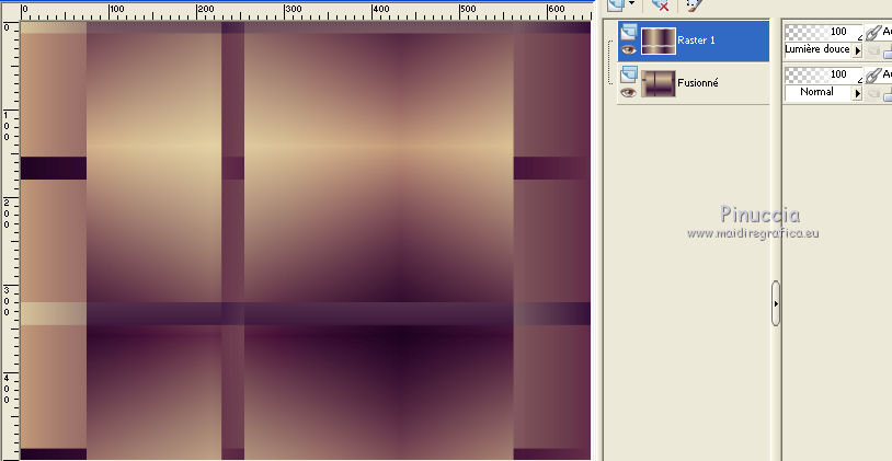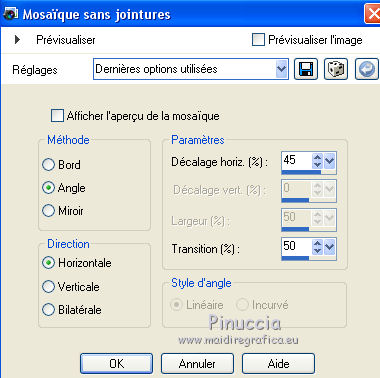 Ce tutoriel a été créé avec CorelX6 et traduit avec CorelX12, mais il peut également être exécuté avec les autres versions. Suivant la version utilisée, vous pouvez obtenir des résultats différents. Depuis la version X4, la fonction Image>Miroir a été remplacée par Image>Renverser horizontalement, et Image>Renverser avec Image>Renverser verticalement. Dans les versions X5 et X6, les fonctions ont été améliorées par la mise à disposition du menu Objets. Avec la nouvelle version X7, nous avons encore Image>Miroir et Image>Renverser/Retourner, mais avec nouvelles différences. Voir les détails à ce sujet ici Certaines dénominations ont changées entre les versions de PSP. Les plus frequentes dénominations utilisées: ![]() Traduction en italien ici Vos versions ici Nécessaire pour réaliser ce tutoriel: Matériel ici Merci pour les tubes Gabry Modules Externes: consulter, si nécessaire, ma section des filtres ici Filters Unlimited 2.0 ici VM Extravaganza ici Mura's Meister - Perspective Tiling ici Mura's Meister - Tone ici Filtres VM Extravaganza peuvent être utilisés seuls ou importés dans Filters Unlimited. voir comment le faire ici). Si un filtre est fourni avec cette icône, ![]() en fonction des couleurs utilisées, vous pouvez changer le mode mélange et l'opacité des calques. Dans les plus récentes versions de PSP, vous ne trouvez pas le dégradé d'avant plan/arrière plan ou Corel_06_029. Vous pouvez utiliser le dégradé des versions antérieures. Ici le dossier Dégradés de CorelX. Placer la sélection dans le dossier Sélections. Placer le preset "Preset Pick gabry-cre@nnie" dans le dossier Paramètres par défaut. 1. Ouvrir une nouvelle image transparente 650 x 500 pixels. 2. Placer en avant plan la couleur claire #d7c39a, et en arrière plan la couleur foncée #37113b. ![]() Préparer en avant plan un Dégradé de premier plan/arrière plan, style Linéaire. ![]() 3. Remplir l'image transparente avec la couleur d'arrière plan.4. Calques>Nouveau calque raster. Remplir le calque du dégradé.5. Effets>Modules Externes>VM Extravaganza - Stay in line! ![]() attention: le filtre ne fonctionne pas importé dans Unlimited, et change le résultat en fonction des couleurs utilisées 6. Calques>Dupliquer. Image>Rotation libre - 90 degrés à gauche. ![]() 7. Effets>Effets 3D>Ombre portée, couleur noire. ![]() 8. Édition>Copier. 9. Calques>Fusionner>Calques visibles. 10. Édition>Coller comme nouveau calque. 11. Image>Rotation libre, comme précédemment. ![]() 12. Placer le calque en mode Lumière douce. ![]() 13. Image>Ajouter des bordures, symétrique décoché, couleur d'arrière plan. ![]() 14. Effets>Effets d'image>Mosaïque sans jointures. ![]() 15. Calques>Nouveau calque raster. Activer l'outil Sélection ![]() (peu importe le type de sélection, parce que avec la sélection personnalisée vous obtenez toujours un rectangle), cliquer sur Sélection personnalisée ![]() et setter ces paramètres. ![]() 16. Activer le tube GABRY_PAESAGGIO 112, Édition>Copier. Revenir sur votre travail et Édition>Coller dans la sélection. Placer le calque en mode Lumière douce. ![]() 17. Vous positionner sur le calque du bas de la pile. Sélection personnalisée ![]() ![]() Sélections>Transformer la sélection en calque. 18. Effets>Modules Externes>VM Extravaganza - Transmission. ![]() Sélections>Désélectionner tout. Réduire l'opacité de ce calque à 30%. ![]() 19. Effets>Effets d'image>Mosaïque sans jointures. ![]() 20. Calques>Dupliquer. Image>Renverser. 21. Image>Ajouter des bordures, symétrique décoché, couleur d'arrière plan. ![]() 22. Effets>Effets d'image>Mosaïque sans jointures. ![]() 23. Calques>Dupliquer. Image>Redimensionner, à 90%, redimensionner tous les calques décoché. 24. Effets>Effets 3D>Ombre portée, couleur noire. ![]() 25. Vous positionner sur le calque du bas de la pile. ![]() Réglage>Flou>Flou gaussien - rayon 20. ![]() 26. Image>Miroir. Vous positionner sur le calque du haut de la pile. 27. Calques>Nouveau calque raster. Sélection personnalisée ![]() ![]() 28. Placer en avant plan la Couleur. ![]() Remplir la sélection avec la couleur d'avant plan.Sélections>Modifier>Contracter - 10 pixels. Presser CANC sur le clavier ![]() 29. Réduire l'opacité de l'outil Pot de Peinture à 40. Remplir la sélection avec la couleur d'avant plan.![]() 30. Placer à nouveau l'opacité de l'outil Pot de Peinture à 100. Sélections>Modifier>Contracter - 50 pixels. Remplir la sélection avec la couleur d'avant plan.![]() 31. Effets>Modules Externes>VM Extravaganza - Transmission. ![]() Réduire l'opacité de ce calque à 60%. ![]() Sélections>Désélectionner tout. 32. Effets>Effets d'image>Mosaïque sans jointures. ![]() 33. Calques>Fusionner>Calques visibles. 34. Édition>Copier. 35. Sélections>Sélectionner tout. Image>Ajouter des bordures, symétrique décoché, couleur d'arrière plan. ![]() 36. Sélections>Inverser. Édition>Coller dans la sélection. Image>Miroir. 37. Effets>Modules Externes>Mura's Meister - Perspective Tiling. ![]() 38. Effets>Effets 3D>Ombre portée, comme précédemment. 39. Sélections>Sélectionner tout. Image>Ajouter des bordures, symétrique décoché, couleur d'arrière plan. ![]() 40. Effets>Effets d'image>Mosaïque sans jointures, comme précédemment. Sélections>Inverser. 41. Effets>Modules Externes>VM Extravaganza - Transmission, comme précédemment. ![]() 42. Réglage>Flou>Flou gaussien - rayon 5. ![]() 43. Sélections>Inverser. Effets>Effets 3D>Ombre portée, comme précédemment. Sélections>Transformer la sélection en calque. Sélections>Désélectionner tout. 44. Touche K pour activer l'outil Sélectionner ![]() chercher et sélectionner le preset gabry-cre@nnie. ![]() Résultat: ![]() Touche M pour désélectionner l'outil. 45. Effets>Effets 3D>Ombre portée, comme précédemment. Édition>Répéter Ombre portée. 46. Effets>Effets d'image>Décalage. ![]() 47. Vous positionner sur le calque