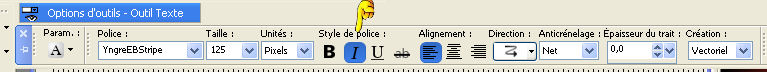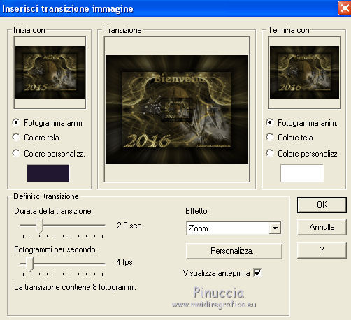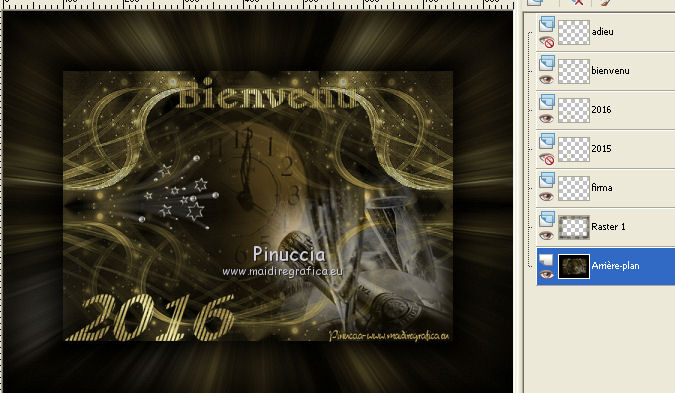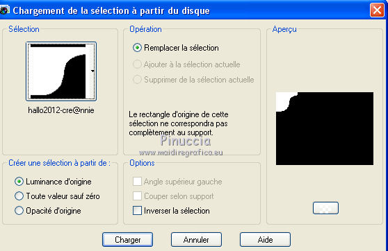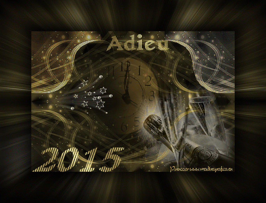 Ce tutoriel a été créé et traduit avec CorelX12, mais peut également être exécuté avec les autres versions. Suivant la version utilisée, vous pouvez obtenir des résultats différents. Depuis la version X4, la fonction Image>Miroir a été remplacée par Image>Renverser horizontalement, et Image>Renverser avec Image>Renverser verticalement. Dans les versions X5 et X6, les fonctions ont été améliorées par la mise à disposition du menu Objets. Avec la nouvelle version X7, nous avons encore Image>Miroir et Image>Renverser/Retourner, mais avec nouvelles différences. Voir les détails à ce sujet ici Certaines dénominations ont changées entre les versions de PSP. Les plus frequentes dénominations utilisées: ![]() Traduction en italien ici Vos versions ici Nécessaire pour réaliser ce tutoriel: Matériel ici Animation Shop ici ![]() en fonction des couleurs utilisées, vous pouvez changer le mode mélange et l'opacité des calques. Ouvrez la police et le minimiser. Vous la trouverez dans la liste des polices disponibles lorsque vous en avez besoin. Avec les nouveaux s.o. ce n'est plus possible. Pour utiliser une police, vous devez le copier dans le dossier Fonts de Windows. Placer la sélection dans le dossier Sélections. Ouvrir le masque dans PSP et le minimiser avec le reste du matériel. 1. Ouvrir une nouvelle image transparente 650 x 500 pixels. 2. Placer en avant plan la couleur claire #d3b764, et en arrière plan la couleur foncée #000000. ![]() 3. Remplir l'image transparente avec la couleur d'arrière plan.4. Calques>Nouveau calque raster. Remplir la sélection avec la couleur d'avant plan.5. Calques>Nouveau calque de masque>A partir d'une image. Ouvrir le menu deroulant sous la fenêtre d'origine et vous verrez la liste des images ouvertes. Sélectionner le masque Narah_mask_Abstract203. ![]() Calques>Fusionner>Fusionner le groupe. Effets>Effets de bords>Accentuer. 6. Calques>Dupliquer. Image>Miroir. Placer le calque en mode Différence. Calques>Fusionner>Fusionner le calque de dessous. 7. Effets>Effets d'image>Mosaïque sans jointures. ![]() 8. Effets>Effets d'image>Décalage. ![]() 9. Calques>Dupliquer. Image>Renverser. Calques>Fusionner>Fusionner le calque de dessous. 10. Effets>Effets d'image>Mosaïque sans jointures, par défaut. ![]() 11. Sélections>Charger/Enregistrer une sélection>Charger à partir du disque. Chercher et charger la sélection hallo2012-cre@nnie. ![]() 12. Sélections>Transformer la sélection en calque. Sélections>Désélectionner tout. 13. Effets>Effets de textures>Textile: couleur du tissage: couleur d'avant plan; couleur des interstices: couleur d'arrière plan. ![]() 14. Effets>Effets de bords>Accentuer. 15. Calques>Dupliquer. Image>Miroir. 16. Activer le tube PatryMists_NewYear01 - Édition>Copier. Revenir sur votre travail et Édition>Coller comme nouveau calque. Réduire l'opacité de ce calque à 40%. 17. Activer le tube AccentStarTrail - Édition>Copier. Revenir sur votre travail et Édition>Coller comme nouveau calque. 18. Image>Rotation libre - 125 degrés à droite. ![]() 19. Effets>Effes d'image>Décalage. ![]() Placer le calque en mode Luminance. Réglage>Netteté>Netteté. 20. Activer le tube PatryMists_NewYear06 - Édition>Copier. Revenir sur votre travail et Édition>Coller comme nouveau calque. Image>Redimensionner, à 90%, redimensionner tous les calques décoché. 21. Déplacer le tube en bas à droite.22. Placer le calque en mode Luminance, et réduire l'opacité à 60%. 23. Signer votre travail sur un nouveau calque. 24. Édition>Copie Spéciale>Copier avec fusion. 25. Image>Ajouter des bordures, 100 pixel, symétrique, couleur d'arrière plan. 26. Activer l'outil Baguette magique ![]() ![]() et cliquer sur le bord pour le sélectionner. 27. Sélection>Modifier>Contracter - 25 pixels. 28. Calques>Nouveau calque raster. Édition>Coller dans la sélection. Sélections>Désélectionner tout. 29. Image>Miroir. Réglage>Flou>Flou radial. ![]() 30. Effets>Effets de bords>Accentuer davantage. 31. Placer en arrière plan Motif, et sélectionner un motif or à choix. ![]() 32. Activer l'outil Texte , font YngreEbStripe.![]() Écrire la première partie du texte: pour moi "Adieu". Calques>Convertir en calque raster. 33. Augmenter la taille du texte à 125 et sélectionner Cursif (I). ![]() Écrire 2015. Calques>Convertir en calque raster. ![]() 34. Édition>Copie Spéciale>Copier avec fusion. Ouvrir Animation Shop et Édition>Coller>Coller comme nouvelle animation. 35. Revenir sur PSP. Écrire en bas à gauche 2016 sur le numéro 2015. 36. Règler à nouveau le texte comme à l'étape 32. ![]() Écrire le mot qui remplacera le premier texte - pour moi "bienvenu". Fermer les calques "adieu" et "2015". ![]() 37. Édition>Copie Spéciale>Copier avec fusion. Revenir sur Animation Shop et Édition>Coller>Coller après l'image active. 38. Édition>Sélectionner tout. Effets>Insérer une transition entre images - Zoom. ![]() 43. Cliquer sur la dernière image pour la sélectionner. Animation>Propriété de l'image et règler la durée à 250. Cliquer sur la première image pour la sélectionner. Animation>Propriété de l'image, et règler la durée à 100. Animation>Redimensionner l'animation - à 650 pixels de largeur. Contrôler le résultat en cliquant sur Visualiser l'animation ![]() et sauvegarder au format gif. L'ancienne version du tutoriel Hallo 2012. ![]() ![]() Si vous avez des problèmes, ou des doutes, ou vous trouvez un link modifié, ou seulement pour me dire que ce tutoriel vous a plu, vous pouvez m'écrire. 11 Décember 2015 |