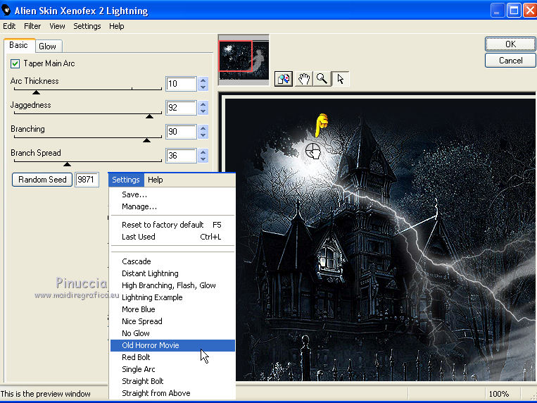 Ce tutoriel a été créé avec CorelX6 et traduit avec CorelX12, mais il peut également être exécuté avec les autres versions. Suivant la version utilisée, vous pouvez obtenir des résultats différents. Depuis la version X4, la fonction Image>Miroir a été remplacée par Image>Renverser horizontalement, et Image>Renverser avec Image>Renverser verticalement. Dans les versions X5 et X6, les fonctions ont été améliorées par la mise à disposition du menu Objets. Avec la nouvelle version X7, nous avons encore Image>Miroir et Image>Renverser/Retourner, mais avec nouvelles différences. Voir les détails à ce sujet ici Certaines dénominations ont changées entre les versions de PSP. Les plus frequentes dénominations utilisées: ![]() Traduction en italien ici Vos versions ici Nécessaire pour réaliser ce tutoriel: Matériel ici Modules Externes. consulter, si nécessaire, ma section de filtre ici Alien Skin Xenofex 2 - Lightning ici Animation Shop ici en fonction des couleurs utilisées, vous pouvez changer le mode mélange et l'opacité des calques. 1. Placer en avant plan la couleur claire #e9eae0, et en arrière plan la couleur foncée #0c0f14. ![]() 2. Ouvrir une nouvelle image transparente 650 x 500 pixels, et remplir avec la couleur d'arrière plan.3. Ouvrir le tube Merel_halloween_achtergrond - Édition>Copier. Revenir sur votre travail et Édition>Coller comme nouveau calque. Image>Redimensionner, à 80%, redimensionner tous les calques décoché. Effets>Effets de bords>Accentuer. 4. Ouvrir le tube Merel_spook_man - Édition>Copier. Revenir sur votre travail et Édition>Coller comme nouveau calque. Déplacer le tube à droite.![]() Réduire l'opacité de ce calque à 56%. 5. Signer votre travail sur un nouveau calque. 6. Image>Ajouter des bordures, 5 pixels, symétrique, couleur d'avant plan. image>Ajouter des bordures, 5 pixels, symétrique, couleur d'arrière plan. 7. Ouvrir le tube mds2440Tot16.02.07 - Édition>Copier. Revenir sur votre travail et Édition>Coller comme nouveau calque. Image>Redimensionner, à 80%, redimensionner tous les calques décoché. Déplacer sur le fantôme.![]() 8. Ouvrir le tube KCVisions-WebOfLies - Édition>Copier. Revenir sur votre travail et Édition>Coller comme nouveau calque. Image>Redimensionner, à 75%, redimensionner tous les calques décoché. Déplacer le tube en bas.9. Effets>Effets 3D>Ombre portée. ![]() 10. Vous positionner sur le calque du bas de la pile. Effets>Modules Externes>Alien Skin Xenofex 2.0 - Lightning. Settings: Old Horror Movie, avec ces paramètres. Tenir enfoncée la touche de la souris sur la petit croix, et positionner le point du début de la foudre sur la zone claire indiquée ci-dessous. ![]() 11. Édition>Copie Spéciale>Copier avec fusion. Ouvrir Animation Shop et Édition>Coller>Coller comme nouvelle animation. 12. Revenir sur PSP. Édition>Annuler Lightning. Répéter l'Effet Lightning, en cliquant une fois sur Random Seed. Réduire l'opacité du calque central à 70%. ![]() vous pouvez rester positionné sur le calque du bas, parce que pour changer les propriétés d'un calque n'est pas nécessaire l'activer. Si vous ne voyez pas le menu des calques, vous devez activer le calque pour en changer les propriétés. Pour visualiser le menu à droite des calques voir qui 13. Édition>Copie Spéciale>Copier avec fusion. Revenir sur Animation Shop et Édition>Coller>Coller après l'image active. 14. À nouveau sur PSP. Édition>Annuler Propriétés du calque. Édition>Annuler Lightning. Répéter l'Effet Lightning, cliquer sur Random Seed et ok. Réduire l'opacitè du calque central à 50%. 15. Édition>Copie Spéciale>Copier avec fusion. Sur Animation Shop: Édition>Coller>Coller après l'image active. 16. Édition>Annuler Propriétés du calque. Édition>Annuler Lightning. Répéter l'Effet Lightning, cliquer sur Random Seed et ok. Réduire l'opacitè du calque central à 30%. 17. Édition>Copie Spéciale>Copier avec fusion. Sur Animation Shop: Édition>Coller>Coller après l'image active. 18. Sur PSP. Édition>Annuler Propriétés du calque. Édition>Annuler Lightning. Répéter l'Effet Lightning, cliquer sur Random Seed et ok. Réduire l'opacitè du calque central à 0, ou fermer le calque. 19. Édition>Copie Spéciale>Copier avec fusion. Sur Animation Shop: Édition>Coller>Coller après l'image active. 20. Édition>Sélectionner tout. Édition>Copier. Cliquer sur la dernière image pour la sélectionner. Édition>Coller>Coller après l'image active. Animation>Inverser les images. 21. Édition>Sélectionner tout. Animation>Propriété de l'image, et règler la durée à 45. ![]() Animation>Redimensionner l'animation - 650 pixels de largeur. 22. Contrôler le résultat en cliquant sur visualiser ![]() et enregistrer en gif. Le tube de cette version est de Krys ![]() ![]() Si vous avez des problèmes, ou des doutes, ou vous trouvez un link modifié, ou seulement pour me dire que ce tutoriel vous a plu, vous pouvez m'écrire. 20 Octobre 2015 |