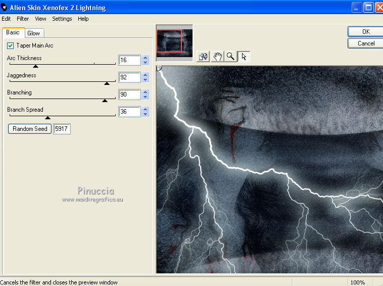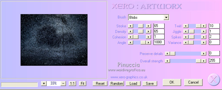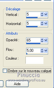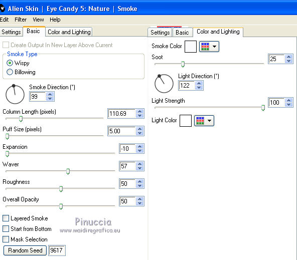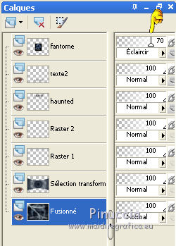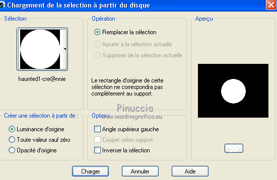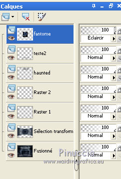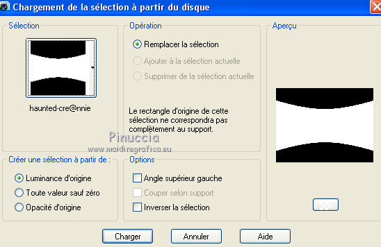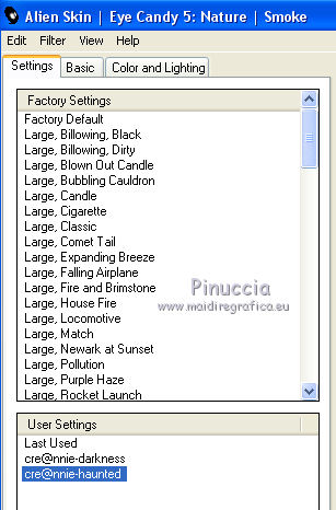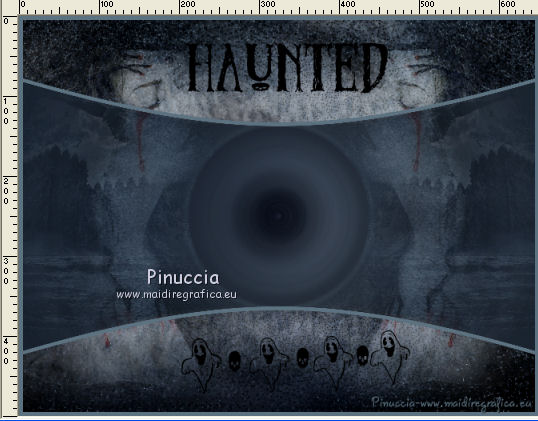 Ce tutoriel a été créé avec CorelX6 et traduit avec CorelX12, mais il peut également être exécuté avec les autres versions. Suivant la version utilisée, vous pouvez obtenir des résultats différents. Depuis la version X4, la fonction Image>Miroir a été remplacée par Image>Renverser horizontalement, et Image>Renverser avec Image>Renverser verticalement. Dans les versions X5 et X6, les fonctions ont été améliorées par la mise à disposition du menu Objets. Avec la nouvelle version X7, nous avons encore Image>Miroir et Image>Renverser/Retourner, mais avec nouvelles différences. Voir les détails à ce sujet ici Certaines dénominations ont changées entre les versions de PSP. Les plus frequentes dénominations utilisées: ![]() Traduction en italien ici Nécessaire pour réaliser ce tutoriel: Matériel ici Modules Externes: consulter, si nécessaire, ma section des filtres ici Alien Skin Eye Candy 5 Nature - Smoke ici Alien Skin Xenofex 2.0 - Lightning ici Xero - Artworx ici MV's Plugins - Panowarp ici Animation Shop qui ![]() en fonction des couleurs utilisées, vous pouvez changer le mode mélange et l'opacité des calques. Dans les plus récentes versions de PSP, vous ne trouvez pas le dégradé d'avant plan/arrière plan ou Corel_06_029. Vous pouvez utiliser le dégradé des versions antérieures. Ici le dossier Dégradés de CorelX. Ouvrez les polices et les minimiser. Vous la trouverez dans la liste des polices disponibles lorsque vous en avez besoin. Avec les nouveaux s.o. ce n'est plus possible. Pour utiliser une police, vous devez le copier dans le dossier Fonts de Windows. Placer le preset En cliquant sur le preset une ou deux fois (selon vos réglages) automatiquement il se placera directement dans le dossier Settings de Alien Skin Eye Candy. pourquoi un ou deux clic voir ici Placer les sélections dans le dossier Sélections. 1. Placer en avant plan la couleur claire #5c7280, et en arrière plan la couleur foncée #000000. ![]() 2. Ouvrir une nouvelle image transparente 650 x 500 pixels, et remplir avec la couleur d'arrière plan.3. Sélections>Sélectionner tout. Calques>Nouveau calque raster. Ouvrir le tube Haunted_MistedByGini_04_21_06 - Édition>Copier. Revenir sur votre travail et Édition>Coller dans la sélection. Image>Redimensionner, à 150%, redimensionner tous les calques décoché. Sélections>Désélectionner tout. 4. Calques>Fusionner>Tous. 5. Réglage>Flou>Flou gaussien - rayon 10. ![]() 6. Effets>Modules Externes>Xero - Artworx. ![]() 7. Calques>Dupliquer. Presser K pour activer l'outil Sélectionner ![]() avec PSP 9 la touche D pour activer l'outil Déformation ![]() en mode Échelle ![]() pousser le noeud central en haut vers le bas jusqu'à 100 pixels, et le noed en bas vers le haut jusqu'à 400 pixels. (si vous ne visualiser pas le règles: Affichage>Règles) ![]() Presser la touche M pour désélectionner l'outil. 8. Effets>Modules Externes>Mv's Plugins - Panowarp. ![]() 9. Effets>Modules Externes>Alien Skin Eye Candy 5 Nature - Smoke. Sélectionner le preset cre@nnie-haunted et ok. ![]() Ci-dessous les paramètres en cas de problèmes avec le preset. ![]() 10. Calques>Dupliquer. Image>Renverser. Réduire l'opacité de ce calque à 65%. Calques>Fusionner>Calques visibles. 11. Sélections>Charger/Enregistrer une sélection>Charger à partir du disque. Chercher et charger la sélection haunted-cre@nnie. ![]() Sélections>Transformer la sélection en calque. 12. Sélections>Modifier>Sélectionner les bordures de la sélection. ![]() Remplir la sélection avec la couleur d'avant plan.13. Sélections>Charger/Enregistrer une sélection>Charger à partir du disque. Charger à nouveau la sélection haunted-cre@nnie. ![]() 13. Réglage>Flou>Flou radial. ![]() 14. Édition>Coller comme nouveau calque (le tube est toujours en mémoire). Effets>Effets d'image>Décalage. ![]() 15. Sélections>Inverser. Presser CANC sur le clavier ![]() Sélections>Désélectionner tout. 16. Calques>Dupliquer. Image>Miroir. Calques>Fusionner>Fusionner le calque de dessous. Réduire l'opacité de ce calque à 15%. ![]() 17. Sélections>Charger/Enregistrer une sélection>Charger à partir du disque. Chercher et charger la sélection haunted-1-cre@nnie. ![]() Presser CANC sur le clavier. Sélections>Désélectionner tout. 18. Calques>Fusionner>Fusionner le calque de dessous. 19. Ouvrir le tube Kat_0641 - Édition>Copier. Revenir sur votre travail et Édition>Coller comme nouveau calque. Image>Redimensionner, à 80%, redimensionner tous les calques décoché. 20. Effets>Effets d'image>Décalage. ![]() Placer le calque en mode Lumière douce. 21. Calques>Agencer>Déplacer vers le bas. Calques>Dupliquer. Image>Miroir. 22. Fermer le calque du haut de lapile. Calques>Fusionner>Calques visibles. 23. Re-ouvrir et vous positionner sur le calque du haut de la pile. Sélections>Sélectionner tout. Sélection>Adapter au support. 24. Sélections>Modifier>Contracter - 5 pixels. Sélections>Inverser. 25. Calques>Nouveau calque raster. Remplir la sélection avec la couleur d'avant plan.Sélections>Désélectionner tout. 26. Signer votre travail sur un nouveau calque. 27. Activer l'outil Texte , font Zombified.![]() En haut au centre, écrire "Haunted". Calques>Convertir en calque raster. Effets>Effets 3D>Ombre portée, couleur blanche. ![]() 28. En bas, cliquer sur le signe "+" ou le signe "-", pour avoir des petits crânes, et avec la police Drac ![]() cliquer sur la "g" minuscule pour avoir des petits fantômes ![]() Calques>Convertir en calque raster. Effets>Effets 3D>Ombre portée, comme précédemment. ![]() 29. Ouvrir "spook" - Édition>Copier. Revenir sur votre travail et Édition>Coller comme nouveau calque. Renommer ce calque "fantome" et placer le calque en mode Éclaircir. ![]() 30. Vous positionner sur le calque du bas de la pile. Effets>Modules Externes>Alien Skin Xenofex 2 - Lightning. ![]() 31. Édition>Copie Spéciale>Copier avec fusion. Ouvrir Animation Shop et Édition>C
