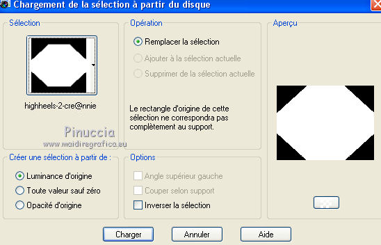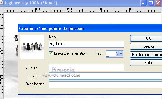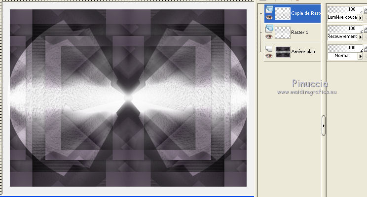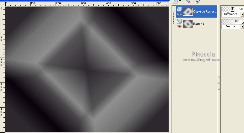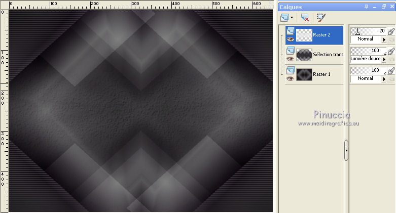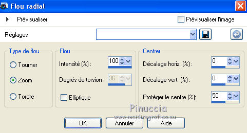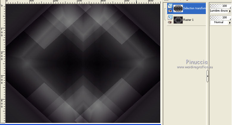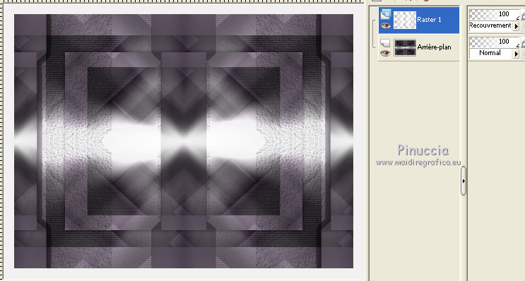 Ce tutoriel a été créé avec CorelX6 et traduit avec CorelX12, mais il peut également être exécuté avec les autres versions. Suivant la version utilisée, vous pouvez obtenir des résultats différents. Depuis la version X4, la fonction Image>Miroir a été remplacée par Image>Renverser horizontalement, et Image>Renverser avec Image>Renverser verticalement. Dans les versions X5 et X6, les fonctions ont été améliorées par la mise à disposition du menu Objets. Avec la nouvelle version X7, nous avons encore Image>Miroir et Image>Renverser/Retourner, mais avec nouvelles différences. Voir les détails à ce sujet ici Certaines dénominations ont changées entre les versions de PSP. Les plus frequentes dénominations utilisées: ![]() Traduction en italien ici Vos versions ici Nécessaire pour réaliser ce tutoriel: Matériel ici Merci pour le tube Annelies Modules Externes: consulter, si nécessaire, ma section des filtres ici Filters Unlimited 2.0 ici &<Bkg Kaleidoscope> - Nomad Rugs (da importare in Unlimited) ici &<Bkg Designersf10I> - Cruncher (da importare in Unlimited) ici °v° Kiwi Oelfilter- Guck Mal ici Simple - Top Left Right ici Simple Left Right Wrap (bonus) ici AAA Frames - Foto Frame ici Filtres Kiwi et Simple peuvent être utilisés seuls ou importés dans Filters Unlimited. voir comment le faire ici). Si un filtre est fourni avec cette icône, ![]() en fonction des couleurs utilisées, vous pouvez changer le mode mélange et l'opacité des calques. La texture Corel_15_044 est standard dans les nouvelles versions de PSP et corresponds à la texture standard des anciennes versions Trottoir. Si vous ne la trouvez pas dans votre PSP, placer la texture fournie dans le dossier Textures. Placer les sélections dans le dossier Sélections. 1. Ouvrir une nouvelle image transparente 650 x 500 pixels. 2. Placer en avant plan la couleur claire #f0f0f0, et en arrière plan la couleur foncée #5a515c. ![]() Préparer en avant plan un dégradé de premier plan/arrière plan, style Rectangulaire. ![]() 3. Remplir l'image transparente du dégradé.4. Calques>Dupliquer. Image>Miroir. Placer le calque en mode Différence et réduire l'opacité à 50%. ![]() Calques>Fusionner>Fusionner le calque de dessous. 5. Effets>Modules Externes>Filters Unlimited 2.0 - °v° kiwi's Oelfilter - Guck mal ![]() 6. Calques>Dupliquer. Image>Renverser. Placer le calque en mode Lumière dure. ![]() Calques>Fusionner>Fusionner le calque de dessous. 7. Sélections>Charger/Enregistrer une sélection>Charger à partir du disque. Chercher et charger la sélection highheels-1-cre@nnie. ![]() Sélections>Transformer la sélection en calque. 8. Effets>Effets de textures>Stores - couleur d'avant plan. ![]() Sélections>Désélectionner tout. 9. Effets>Modules Externes>Simple - Top Left Mirror. Calques>Fusionner>Fusionner le calque de dessous. 10. Sélections>Charger/Enregistrer une sélection>Charger à partir du disque. Chercher et charger la sélection highheels-2-cre@nnie. ![]() Sélections>Transformer la sélection en calque. Sélections>Désélectionner tout. 11. Effets>Modules Externes>Filters Unlimited 2.0 - Special Effects 1 - Shiver. attention, dans le net est partagé une version d'Unlimited qui n'a besoin d'installation, et est composée de files en format .8bf (vous pouvez la télécharger ici) Parfois, les résultats entre les deux versions peuvent être différents, mais il n'y a pas des règles codifiées et on peut réléver ces différences seulement en comparant vos résultats avec les résultats du tutoriel. Ceci est l'un des cas. Avec la version à installer, vous devriez avoir ce résultat. ![]() Avec la version d'Unlimited composée de files en .8bf vous devriez avoir ce-ci. ![]() Et cette-ci est la version que j'ai utilisé pour exécuter le tutoriel, après avoir comparé mes résultats avec les résultats d'Annie. En bas du tutoriel l'exemple avec la version d'Unlimited à installer. 12. Placer le calque en mode Lumière douce. ![]() 13. Calques>Nouveau calque raster. Placer en avant plan la Couleur du début. ![]() 14. Sélections>Charger/Enregistrer une sélection>Charger à partir du disque. Chercher et charger la sélection highheels-3-cre@nnie. ![]() Remplir avec la couleur d'avant plan.Sélections>Désélectionner tout. 15. Réglage>Flou>Flou radial. ![]() 16. Édition>Copier. 17. Effets>Effets de textures>Texture - Sélectionner la texture Trottoir ou Corel_15_044. ![]() Réduire l'opacité de ce calque à 20%. ![]() 18. Image>Ajouter des bordures, symétrique décoché, couleur d'arrière plan. ![]() 19. Calques>Dupliquer. Effets>Modules Externes>Filters Unlimited 2.0 - &<Bkg Kaleidoscope> - Nomads Rug ![]() Placer le calque en mode Lumière dure. ![]() 20. Édition>Coller comme nouveau calque. ![]() 21. Réglage>Flou>Flou radial, comme précédemment. Calques>Fusionner>Calques visibles. 22. Calques>Dupliquer. Image>Redimensionner, à 70%, redimensionner tous les calques décoché. 23. Effets>Effets 3D>Ombre portée, couleur noire. ![]() Calques>Fusionner>Fusionner le calque de dessous. 24. Sélections>Charger/Enregistrer une sélection>Charger à partir du disque. Chercher et charger la sélection highheels-4-cre@nnie. ![]() Sélections>Transformer la sélection en calque. Sélections>Désélectionner tout. 25. Effets>Modules Externes>Simple - Left Right Wrap. 26. Effets>Effets 3D>Ombre portée, comme précèdemment. 27. Image>Ajouter des bordures, 25 pixels, symétrique, couleur d'avant plan. 28. Calques>Nouveau calque raster. Sélections>Charger/Enregistrer une sélection>Charger à partir du disque. Chercher et charger la sélection highheels-5-cre@nnie. ![]() Remplir la sélection avec la couleur d'avant plan.29. Effets>Effets de textures>Texture - Trottoir (Corel_15_44), comme précédemment. Sélections>Désélectionner tout. 30. Effets>Modules Externes>Filters Unlimited 2.0 - &<Bkg Kaleidoscope> - Nomads Rug, par défaut. ![]() Placer le calque en mode Recouvrement. ![