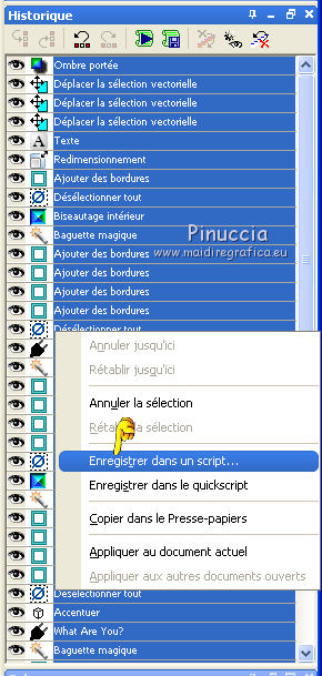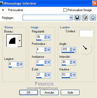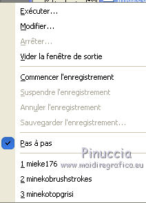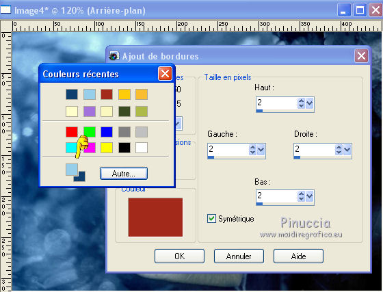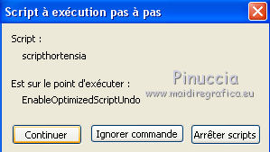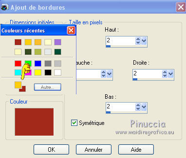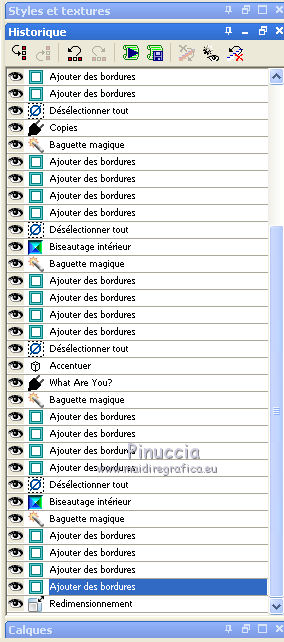 Ce tutoriel a été créé avec CorelX6 et traduit avec CorelX12, mais il peut également être exécuté avec les autres versions. Suivant la version utilisée, vous pouvez obtenir des résultats différents. Depuis la version X4, la fonction Image>Miroir a été remplacée par Image>Renverser horizontalement, et Image>Renverser avec Image>Renverser verticalement . Dans les versions X5 et X6, les fonctions ont été améliorées par la mise à disposition du menu Objets. Avec la nouvelle version X7, nous avons encore Image>Miroir et Image>Renverser/Retourner, mais avec nouvelles différences. Voir les détails à ce sujet ici Certaines dénominations ont changées entre les versions de PSP. Les plus frequentes dénominations utilisées: ![]() Traduction en italien ici Nécessaire pour réaliser ce tutoriel: Matériel ici Modules Externes: consulter, si nécessaire, ma section des filtres ici Filters Unlimited 2.0 ici Toadies ici Mura's Meister - Copies ici Filtres Toadies peuvent être utilisés seuls ou importés dans Filters Unlimited. voir comment le faire ici). Si un filtre est fourni avec cette icône, ![]() 1. Ouvrir votre image dans PSP. Image>Redimensionner, à 450 pixels de largeur, redimensionner tous les calques coché. Activer l'outil Pipette pour choisir deux couleurs de l'image.Cliquer sur la couleur choisie, avec la touche gauche de la souris pour placer en avant plan la couleur claire et avec la touche droite pour placer en arrière plan la couleur foncée. 2. Image>Ajouter des bordures, 2 pixels, symétrique, couleur foncée. cliquer avec la touche droite de la souris sur la palette de la couleur, pour avoir la table des couleurs récentes, en bas à gauche, les petites palettes des vos couleurs d'avant plan et arrière plan; pour placer la couleur du bord, cliquer sur la petite palette correspondante. ![]() Image>Ajouter des bordures, 1 pixel, symétrique, couleur claire. Image>Ajouter des bordures, 2 pixels, symétrique, couleur foncée. 3. Image>Ajouter des bordures, 20 pixels, symétrique, couleur claire. Sélectionner ce bord avec la baguette magique ![]() 4. Effets>Effets 3D>Biseautage intérieur. ![]() Sélections>Désélectionner tout. 5. Image>Ajouter des bordures, 2 pixels, symétrique, couleur foncée. Image>Ajouter des bordures, 1 pixel, symétrique, couleur claire. Image>Ajouter des bordures, 2 pixels, symétrique, couleur foncée. 6. Image>Ajouter des bordures, 35 pixels, symétrique, couleur claire. Sélectionner ce bord avec la baguette magique ![]() 7. Effets>Modules Externes>Toadies - What are you. ![]() 8. Effets>Effets de bords>Accentuer. 9. Image>Ajouter des bordures, 2 pixels, symétrique, couleur foncée. Image>Ajouter des bordures, 1 pixel, symétrique, couleur claire. Image>Ajouter des bordures, 2 pixels, symétrique, couleur foncée. 10. Image>Ajouter des bordures, 20 pixels, symétrique, couleur claire. Sélectionner ce bord avec la baguette magique ![]() 11. Effets>Effets 3D>Biseautage intérieur, comme précédemment. Sélections>Désélectionner tout. 12. Image>Ajouter des bordures, 2 pixels, symétrique, couleur foncée. Image>Ajouter des bordures, 1 pixel, symétrique, couleur claire. Image>Ajouter des bordures, 2 pixels, symétrique, couleur foncée. 13. Image>Ajouter des bordures, 45 pixels, symétrique, couleur claire. Sélectionner ce bord avec la baguette magique ![]() 14. Effets>Modules Externes>Mura's Meister - Copies. ![]() Sélections>Désélectionner tout. 15. Image>Ajouter des bordures, 2 pixels, symétrique, couleur foncée. Image>Ajouter des bordures, 1 pixel, symétrique, couleur claire. Image>Ajouter des bordures, 2 pixels, symétrique, couleur foncée. 16. Image>Ajouter des bordures, 20 pixels, symétrique, couleur claire. Sélectionner ce bord avec la baguette magique ![]() 17. Effets>Effets 3D>Biseautage intérieur, comme précédemment. Sélections>Désélectionner tout. 18. Image>Ajouter des bordures, 2 pixels, symétrique, couleur foncée. 19. Image>Redimensionner, à 500/600 pixels de largeur, à vostre convenance, redimensionner tous les calques coché. 20. Signer votre travail sur un nouveau calque. 21. Calques>Fusionner>Tous et enregistrer en jpg. Script Voulez-vous répéter le tutoriel avec une autre image? Vous pouvez enregistrer le script de toutes les étapes: Préparation: Affichage>Palettes>Historique, pour visualiser la palette des étapes. ![]() Si vous avez annuler des commandes, (vous pouvez voir ces commandes avec la croix rouge): ![]() cliquer sur l'icône ci-dessous pour les remouver. ![]() Répondre oui. ![]() Maintenant, nous pouvons enregistrer le script: sélectionner les commandes relatives aux bords: ![]() Clic droit sur les commandes sélectionées et cliquer sur "Enregistrer dans un script". ![]() Donner un nom au script et décocher "Enreg.styles/textures" (pour pouvoir changer les couleurs) ![]() Exécution Ouvrir votre image. Image>Redimensionner, à 450 pixels de largeur, redimensionner tous les calques coché. Choisir deux couleurs et placer en avant plan la couleur claire, et en arrière plan la couleur foncée. Activer la barre du script; s'elle n'est pas visible: Affichage>Barres d'outils>Script. Ouvrir le menu; chercher et sélectionner votre script ![]() Activer le mode d'exécution, pour contrôler toutes le fenêtres des commandes. ![]() Fichier>Script>Pas à pas et cliquer sur Pas à pas ![]() ![]() Cette option ne serait pas nécessaire pour les commandes de ce script, mais avec ce choix, vous pouvez contrôler toutes les commandes du script. Nous pouvons commencer: Cliquer sur la flèche noire (dans les nouvelles versions de PSP elle est blue) pour exécuter le script. ![]() Répondre "continuer" à la première fenêtre: ![]() Deuxième fenêtre: clic droite sur la palette de la couleur et changer la couleur avec la nouvelle couleur foncée. ![]() troisième fenêtre: clic droite sur la palette et changer la couleur avec la nouvelle couleur claire. ![]() et ainsi de suite jusq