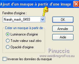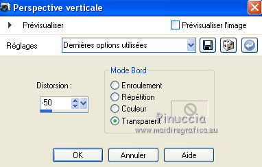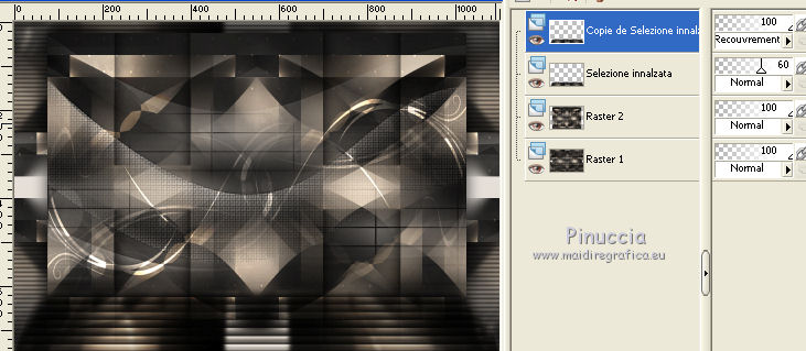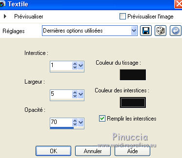 Ce tutoriel a été créé avec CorelX6 et traduit avec CorelX12, mais il peut également être exécuté avec les autres versions. Suivant la version utilisée, vous pouvez obtenir des résultats différents. Depuis la version X4, la fonction Image>Miroir a été remplacée par Image>Renverser horizontalement, et Image>Renverser avec Image>Renverser verticalement. Dans les versions X5 et X6, les fonctions ont été améliorées par la mise à disposition du menu Objets. Avec la nouvelle version X7, nous avons encore Image>Miroir et Image>Renverser/Retourner, mais avec nouvelles différences. Voir les détails à ce sujet ici Certaines dénominations ont changées entre les versions de PSP. Les plus frequentes dénominations utilisées: ![]() Traduction en italien ici Vos versions ici Nécessaire pour réaliser ce tutoriel: Matériel ici Merci: pour le tube Syl et pour les masques Narah Modules Externes: consulter, si nécessaire, ma section des filtres ici Filters Unlimited 2.0 ici Simple - Centre Tile ici Toadies - Weaver, Ommadawn ici Filtres Simple et Toadies peuvent être utilisés seuls ou importés dans Filters Unlimited. voir comment le faire ici). Si un filtre est fourni avec cette icône, ![]() en fonction des couleurs utilisées, vous pouvez changer le mode mélange et l'opacité des calques. Placer les sélections dans le dossier Sélections. Ouvrir les masques dans PSP et les minimiser avec le reste du matériel. 1. Ouvrir une nouvelle image transparente 650 x 500 pixels. 2. Placer en avant plan la couleur claire #e5dfd8, et en arrière plan la couleur foncée #101010. ![]() Préparer un dégradé de premier plan/arrière plan, style Linéaire. ![]() 3. Remplir l'image transparente du dégradé.4. Effets>Effets de distorsion>Vagues. ![]() 5. Sélections>Sélectionner tout. Image>Ajouter des bordures, 50 pixels, symétrique, couleur d'avant plan. 6. Effets>Effets d'image>Mosaïque sans jointures. ![]() 7. Sélections>Inverser. Sélections>Transformer la sélection en calque. Sélections>Désélectionner tout. 8. Image>Miroir. Placer le calque en mode Lumière dure. Calques>Fusionner>Fusionner le calque de dessous. 9. Calques>Dupliquer. Image>Miroir. 10. Effets>Effets d'image>Mosaïque sans jointures, comme précédemment. 11. Placer le calque en mode Lumière dure. Calques>Fusionner>Fusionner le calque de dessous. 12. Activer l'outil Baguette magique ![]() ![]() et cliquer dans les quatres rectangles blancs pour les sélectionner. ![]() 13. Remplir la sélection avec la couleur d'arrière plan.Sélections>Transformer la sélection en calque. Sélections>Désélectionner tout. 14. Effets>Modules Externes>Toadies - Weaver. ![]() 15. Effets>Effets de distorsion>Vagues, comme précédemment. 16. Calques>Dupliquer. Image>Miroir. Calques>Fusionner>Fusionner le calque de dessous. Placer le calque en mode Lumière douce. 17. Image>Ajouter des bordures, symétrique décoché, couleur d'arrière plan. ![]() 18. Effets>Effets d'image>Mosaïque sans jointures. ![]() 19. Placer en avant plan la Couleur. Calques>Nouveau calque raster. Remplir avec la couleur d'avant plan.20. Calques>Nouveau calque de masque>A partir d'une image. Ouvrir le menu deroulant sous la fenêtre d'origine et vous verrez la liste des images ouvertes. Sélectionner le masque Narah_mask_0619. ![]() Calques>Fusionner>Fusionner le groupe. Placer le calque en mode Éclaircir. 21. Calques>Dupliquer. Image>Miroir. Image>Renverser. 22. Calques>Nouveau calque raster. Activer l'outil Sélection ![]() (peu importe le type de sélection, parce que avec la sélection personnalisée vous obtenez toujours un rectangle), cliquer sur Sélection personnalisée ![]() et setter ces paramètres. ![]() 23. Effets>Effets 3D>Ombre portée, couleur noire. ![]() Sélections>Désélectionner tout. 24. Effets>Modules Externes>Simple - Centre Tile. 25. Sélection personnalisée ![]() ![]() Presser CANC sur le clavier ![]() Sélections>Désélectionner tout. 26. Vous positionner sur le calque du bas de la pile. Calques>Nouveau calque raster. Remplir avec la couleur d'avant plan.27. Calques>Nouveau calque de masque>A partir d'une image. Ouvrir le menu deroulant sous la fenêtre d'origine et vous verrez la liste des images ouvertes. Sélectionner le masque Narah_mask_0493. ![]() Calques>Fusionner>Fusionner le groupe. Réduire l'opacité de ce calque à 65%. 28. Sélections>Charger/Enregistrer une sélection>Charger à partir du disque. Chercher et charger la sélection isittrue-1-cre@nnie. ![]() 29. Effets>Effets de textures>Textile, les deux couleurs: couleurs d'arrière plan. ![]() 30. Sélections>Transformer la sélection en calque. Sélections>Désélectionner tout. 31. Effets>Modules Externes>Toadies - Ommadawn. ![]() 32. Image>Renverser. Effets>Effets de bords>Eroder. 33. Édition>Copie Spéciale>Copier avec fusion. 34. Image>Ajouter des bordures, symétrique décoché, couleurs d'avant plan. ![]() 35. Effets>Effets d'image>Mosaïque sans jointures, par défaut. ![]() 36. Sélections>Charger/Enregistrer une sélection>Charger à partir du disque. Chercher et charger la sélection isittrue-2-cre@nnie. ![]() 37. Réglage>Flou>Flou gaussien - rayon 5. ![]() 38. Effets>Effets de textures>Stores, couleur d'arrière plan. ![]() 39. Sélections>Inverser. Effets>Effets 3D>Ombre portée, comme précédemment. Sélections>Désélectionner tout. 40. Édition>Coller comme nouveau calque. 41. Effets>Effets 3D>Ombre portée, couleur noire. ![]() 42. Vous positionner sur le calque du bas de la pile. Sélection personnalisée ![]() ![]() 43. Sélections>Transformer la sélection en calque. Sélections>Désélectionner tout. Calques>Agencer>Placer en haut de la pile. 44. Effets>Effets géométriques>Perspective verticale. ![]() 45. Sélections>Charger/Enregistrer une sélection>Charger à partir du disque. Chercher et charger la sélection isittrue-3-cre@nnie. ![]() Presser CANC sur le clavier. Sélections>Désélectionner tout. Réduire l'opacité de ce cal