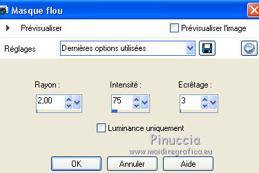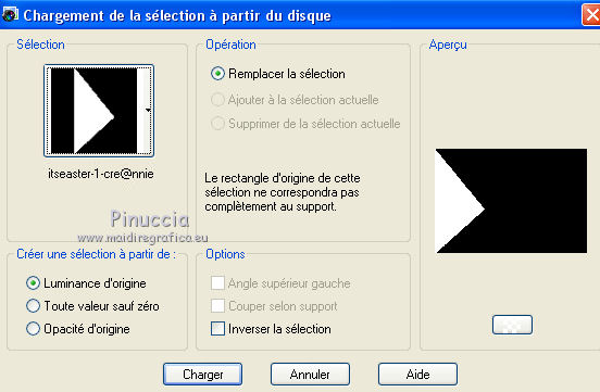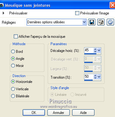 Ce tutoriel a été créé avec CorelX6 et traduit avec CorelX12, mais il peut également être exécuté avec les autres versions. Suivant la version utilisée, vous pouvez obtenir des résultats différents. Depuis la version X4, la fonction Image>Miroir a été remplacée par Image>Renverser horizontalement, et Image>Renverser avec Image>Renverser verticalement. Dans les versions X5 et X6, les fonctions ont été améliorées par la mise à disposition du menu Objets. Avec la nouvelle version X7, nous avons encore Image>Miroir et Image>Renverser/Retourner, mais avec nouvelles différences. Voir les détails à ce sujet ici Certaines dénominations ont changées entre les versions de PSP. Les plus frequentes dénominations utilisées: ![]() Traduction en italien ici Vos versions ici Nécessaire pour réaliser ce tutoriel: Matériel ici Pour le tube merci Kitty . Les autres tubes sont de Annie Modules Externes: consulter, si nécessaire, ma section des filtres ici Filters Unlimited 2.0 ici AP Lines - Lines SilverLining ici Tramages - Perforator 1, Tow the line ici Mura's Meister - Perspective Tiling ici Filtres Tramages peuvent être utilisés seuls ou importés dans Filters Unlimited. voir comment le faire ici). Si un filtre est fourni avec cette icône, ![]() en fonction des couleurs utilisées, vous pouvez changer le mode mélange et l'opacité des calques. Placer le masque dans le dossier Masques. Placer les sélections dans le dossier Sélections. 1. Ouvrir une nouvelle image transparente 650 x 500 pixels. 2. Placer en avant plan la couleur claire #cdbda7, et en arrière plan la couleur foncée #9a7048. ![]() 3. Remplir l'image transparente avec la couleur d'arrière plan.4. Sélections>Sélectionner tout. Ouvrir le tube eierdoos-bloemen, Édition>Copier. Revenir sur votre travail et Édition>Coller dans la sélection. Sélections>Désélectionner tout. 5. Effets>Effets d'image>Mosaïque sans jointures, par défaut. ![]() 6. Réglage>Flou>Flou radial. ![]() 7. Calques>Dupliquer. Image>Miroir. Placer le calque en mode Lumière dure. 8. Calques>Fusionner>Fusionner le calque de dessous. 9. Image>Redimensionner, à 80%, redimensionner tous les calques décoché. 10. Image>Renverser. 11. Effets>Modules Externes>Tramages - Perforator 1. ![]() cet effet est également dans le filtre Factory Gallery E. Le premier filtre ajouté aux Emplacements de Fichiers empêchera l'utilisation de l'Effet dans le deuxième filtre ajouté. Si vous ne trouvez pas l'effet dans Tramages, vous devez supprimer le filtre Factory Gallery des l'Emplacements des fichiers, ou importer l'effet de Tramages dans Unlimited 12. Calques>Fusionner>Fusionner le calque de dessous. 13. Image>Ajouter des bordures, symétrique décoché, couleur d'arrière plan. ![]() 14. Effets>Effets d'image>Mosaïque sans jointures, par défaut. ![]() 15. Sélections>Charger/Enregistrer une sélection>Charger à partir du disque. Chercher et charger la sélection itseaster-1-cre@nnie. ![]() Sélections>Transformer la sélection en calque. 16. Effets>Modules Externes>Tramages - Tow the line. ![]() Sélections>Désélectionner tout. 17. Calques>Dupliquer. 18. Image>Rotation libre - 90 degrés à droite. ![]() 19. Effets>Effets d'image>Décalage. ![]() 20. Calques>Fusionner>Fusionner le calque de dessous. 21. Effets>Effets 3D>Ombre portée, couleur noire. ![]() 22. Effets>Effets d'image>Mosaïque sans jointures, comme précédemment. 23. Image>Ajouter des bordures, symétrique décoché, couleur d'avant plan. ![]() 24. Effets>Effets d'image>Mosaïque sans jointures, comme précédemment. 25. Calques>Nouveau calque raster. Remplir avec la couleur d'avant plan.26. Calques>Charger/Enregistrer un masque>Charger à partir du disque. Chercher et charger le masque mask4-cre@nnie. ![]() Calques>Fusionner>Fusionner le groupe. 27. Effets>Effets de bords>Accentuer. Placer le calque en mode Recouvrement et réduire l'opacité à 75%. ![]() 28. Vous positionner sur le calque du bas de la pile. Sélections>Charger/Enregistrer une sélection>Charger à partir du disque. Chercher et charger la sélection itseaster-2-cre@nnie. ![]() 29. Effets>Modules Externes>AP [Lines] - Lines SilverLining. si vous voulez utiliser AP Innovations - Lines SilverLining le résultat ne change pas ![]() Sélections>Transformer la sélection en calque. 30. Effets>Effets 3D>Ombre portée, comme précédemment. Sélections>Désélectionner tout. 31. Calques>Fusionner>Calques visibles. 32. Calques>Dupliquer. Image>Redimensionner, à 90%, redimensionner tous les calques décoché. 33. Vous positionner sur le calque du bas de la pile. Réglage>Flou>Flou gaussien - rayon 20. ![]() 34. Effets>Modules Externes>AP [Lines] - Lines SilverLining, comme précédemment. 35. Image>Ajouter des bordures, symétrique décoché, comme précédemment. ![]() 36. Effets>Effets d'image>Mosaïque sans jointures. ![]() 37. Activer l'outil Baguette magique ![]() ![]() cliquer sur les bords en haut et en bas pour les sélectionner. 38. Effets>Modules Externes>Tramages - Tow the line, comme précédemment. 39. Effets>Effets 3D>Ombre portée, comme précédemment. 40. Sélections>Transformer la sélection en calque. Sélections>Désélectionner tout. 41. Effets>Effets de distorsion>Coordonnées polaires. ![]() 42. Placer le calque en mode Lumière douce et réduire l'opacité à 30%. ![]() 43. Calques>Fusionner>Fusionner le calque de dessous. 44. Calques>Dupliquer. Effets>Modules Externes>Mura's Meister - Perspective Tiling. ![]() 45. Effets>Effets 3D>Ombre portée, comme précédemment. Édition>Coller comme nouveau calque (le tube eierdoos-bloemen est toujours en mémoire). 46. Image>Redimensionner, à 60%, redimensionner tous les calques décoché. 47. Réglage>Flou>Masque flou. ![]() 48. Image>Miroir. Effets>Effets 3D>Ombre portée, comme précédemment. Déplacer le tube en bas à gauche.![]() 49. Ouvrir le tube bloemstuk-pasen, - Édition>Copier. Revenir sur votre travail et Édition>Coller comme nouve