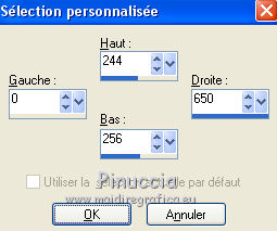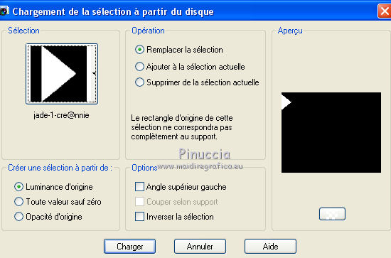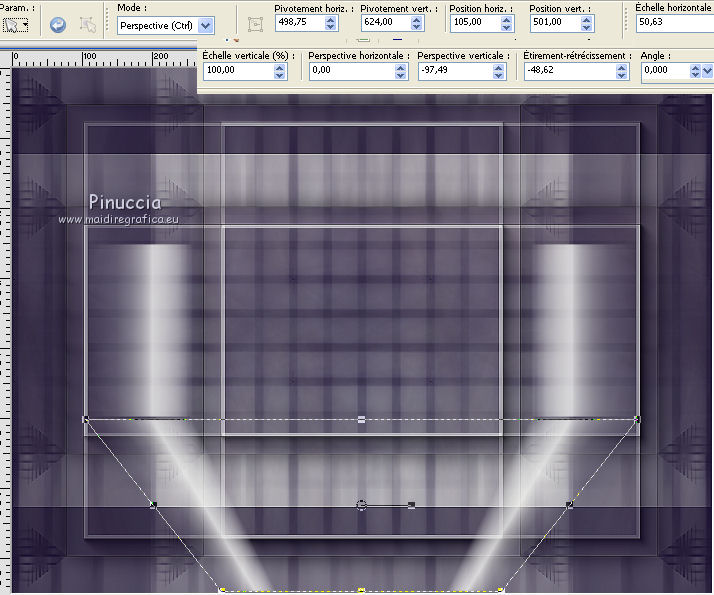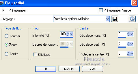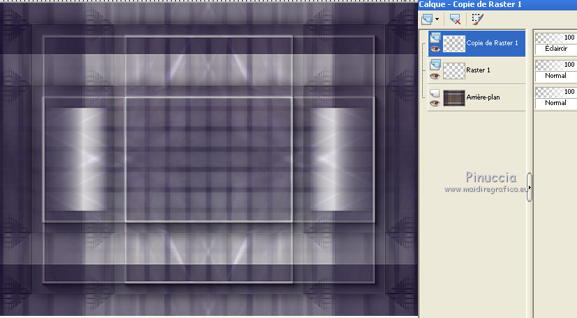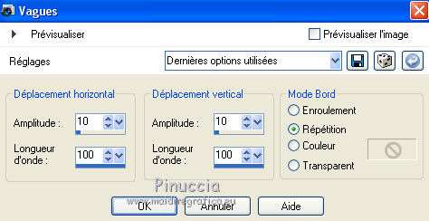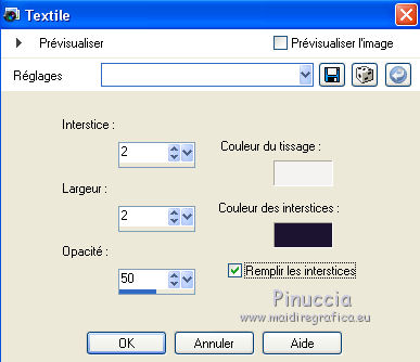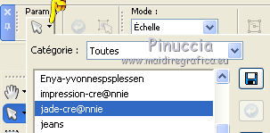 Ce tutoriel a été créé avec CorelX6 et traduit avec CorelX12, mais il peut également être exécuté avec les autres versions. Suivant la version utilisée, vous pouvez obtenir des résultats différents. Depuis la version X4, la fonction Image>Miroir a été remplacée par Image>Renverser horizontalement, et Image>Renverser avec Image>Renverser verticalement . Dans les versions X5 et X6, les fonctions ont été améliorées par la mise à disposition du menu Objets. Avec la nouvelle version X7, nous avons à nouveau Miroir/Retourner, mais avec nouvelles différences. Consulter, si vouz voulez, mes notes ici Certaines dénominations ont changées entre les versions de PSP. Les plus frequentes dénominations utilisées: ![]() Traduction en italien ici Vos versions ici Nécessaire pour réaliser ce tutoriel: Matériel ici Pour le tube merci Annelies Garder le nom du tube. Le © appartient à l'artiste original. Garder le crédit de ceux qui ont créé le tube. Modules Externes: consulter, si nécessaire, ma section des filtres ici AAA Frames - Foto Frame ici Simple - Top Left Mirror ici Toadies - What are you ici ![]() Placer le preset Pick_jade-cre@nnie dans le dossier Paramètres par défaut. Placer les sélections dans le dossier Sélections. 1. Ouvrir une nouvelle image transparente 650 x 500 pixels. 2. Placer en avant plan la couleur claire #f3f3f0, et en arrière plan la couleur foncée #1d1432. ![]() 3. Remplir l'image transparente avec la couleur d'arrière plan.4. Calques>Nouveau calque raster. Sélections>Sélectionner tout. 5. Activer le tube Alies 1VR973-woman-20042014, Édition>Copier. ne pas fermer le tube: on va s'en servir plus tard Revenir sur votre travail et Édition>Coller dans la sélection. Sélections>Désélectionner tout. 6. Effets>Effets d'image>Mosaïque sans jointures. ![]() 7. Réglage>Flou>Flou radial. ![]() 8. À nouveau Effets>Effets d'image>Mosaïque sans jointures, comme précédemment. 9. Calques>Fusionner>Fusionner le calque de dessous. 10. Calques>Nouveau calque raster. Activer l'outil Sélection ![]() (peu importe le type de sélection, parce que avec la sélection personnalisée vous obtenez toujours un rectangle), cliquer sur Sélection personnalisée ![]() et setter ces paramètres. ![]() 11. Remplir la sélection avec la couleur d'arrière plan.Sélections>Désélectionner tout. 12. Effets>Effets de distorsion>Vague. ![]() 13. Calques>Dupliquer. Image>Miroir. Calques>Fusionner>Fusionner le calque de dessous. 14. Effets>Effets de distorsion>Vent - vers la gauche, intensité 100. ![]() 15. Calques>Dupliquer. Image>Miroir. Calques>Fusionner>Fusionner le calque de dessous. 16. Calques>Dupliquer. Effets>Modules Externes>Toadies - What are you. ![]() 17. Calques>Fusionner>Fusionner le calque de dessous. Effets>Modules Externes>Toadies - What are you, comme précédemment. 18. Calques>Dupliquer. Image>Rotation libre - 90 degrés à gauche. ![]() Calques>Fusionner>Fusionner le calque de dessous. 19. Sélections>Sélectionner tout. Sélections>Adapter au support. ![]() 20. Édition>Copier. Édition>Coller comme nouveau image, et minimiser l'image, qui restera en mémoire, mais on va s'en servir plus tard pour les bords. ![]() 21. Revenir sur votre travail. Image>Ajouter des bordures, 75 pixels, symétrique, couleur d'avant plan. 22. Sélections>Inverser. Édition>Coller dans la sélection (l'image de l'étape 20 est toujours en mémoire). 23. Sélections>Inverser. Effets>Effets d'image>Mosaïque sans jointures, comme précédemment. 24. Sélections>Transformer la sélection en calque. Effets>Modules Externes>AAA Frames - Foto Frame. ![]() 25. Effets>Effets 3D>Ombre portée, couleur noire. ![]() 26. Calques>Nouveau calque raster. Sélections>Charger/Enregistrer une sélection>Charger à partir du disque. Chercher et charger la sélection jade-1-cre@nnie. ![]() 27. Édition>Coller dans la sélection (l'image du point 20 est toujours en mémoire). Sélections>Désélectionner tout. 28. Effets>Modules Externes>Simple - Top Left Mirror. 29. Image>Ajouter des bordures, symétrique décoché, couleur d'arrière plan. ![]() 30. Effets>Modules Externes>Toadies - What are you. ![]() Effets>Effets de bords>Accentuer. 31. Calques>Nouveau calque raster. Sélection personnalisée ![]() ![]() Remplir la sélection avec la couleur d'avant plan.Sélections>Désélectionner tout. 32. Effets>Effets de distorsion>Vent, comme précédemment. 33. Calques>Dupliquer. Image>Miroir. Calques>Fusionner>Fusionner le calque de dessous. 34. Calques>Dupliquer. Touche K pour activer l'outil Sélectionner ![]() ouvrir le menu des paramètres par défaut et sélectionner le preset jade-cre@nnie ![]() Vous devriez avoir ce-ci. ![]() Touche M pour désélectionner l'Outil. 35. Calques>Dupliquer. Image>Renverser. Calques>Fusionner>Fusionner le calque de dessous. 36. Effets>Effets géométriques>Cercle. ![]() Édition>Répéter Cercle. 37. Calques>Dupliquer. Image>Rotation libre, comme précédemment, réglages encore en mémoire. ![]() Calques>Fusionner>Fusionner le calque de dessous. 38. Effets>Modules Externes>Toadies - What are you. ![]() Placer le calque en mode Éclaircir. ![]() 39. Calques>Dupliquer. 40. Calques>Nouveau calque raster. Sélections>Charger/Enregistrer une sélection>Charger à partir du disque. Chercher et charger la sélection jade-2-cre@nnie. ![]() 41. Remplir la sélection avec la couleur d'arrière plan.Sélections>Désélectionner tout. 42. Effets>Modules Externes>Toadies - What are you. ![]() 43. Sélections>Charger/Enregistrer une sélection>Charger à partir du disque. Chercher et charger la sélection jade-3-cre@nnie. ![]() 44. Effets>Effets de textures>Textile. couleur du tissage: premier plan - couleur des interstices: couleur d'arrière plan. ![]() 45. Sélections>Modifier>Contracter - 25 pixels. Sélections>Transformer la sélection en calque. 46. Image>Miroir. Sélections>Désélectionner tout. 47. Effets>Effets 3D>Ombre portée, comme précédemment. 48.