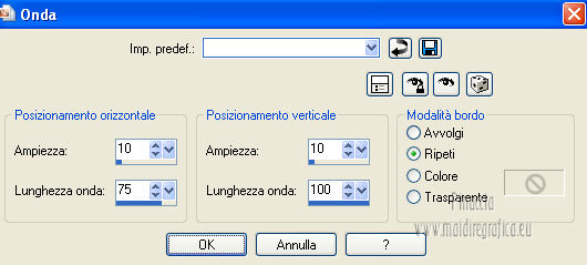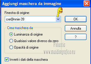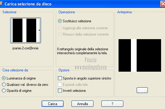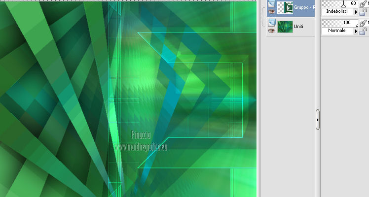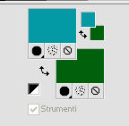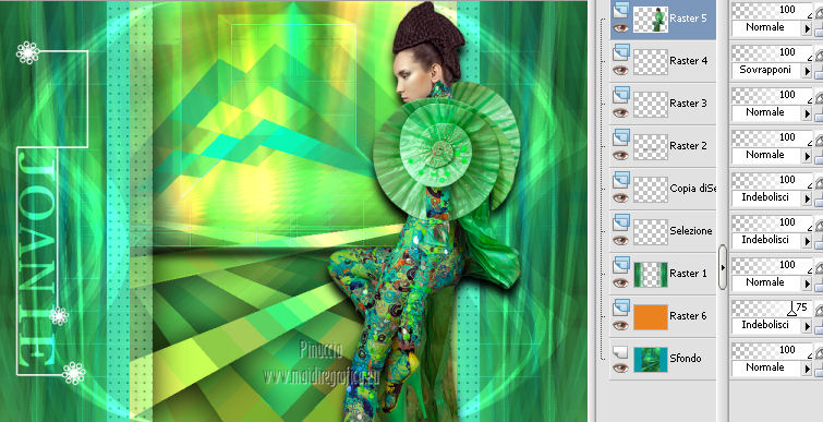 Le vostre versioni qui Occorrente: Materiale qui Per il tube della donna grazie Joanie. Filtri: vedi la mia sezione filtri qui Filters Unlimited qui &<Bkg Designer sf10I> (da importare in Unlimited) qui Alien Skin Eye Candy 5 Impact qui Frischluft - Mosaic Plan qui ![]() non esitare a cambiare modalità di miscelatura e opacità secondo i colori utilizzati. Metti i preset Cliccando sul file una o due volte (a seconda delle tue impostazioni), automaticamente il preset si installerà nella cartella corretta. perchè uno o due clic vedi qui Metti le selezioni nella cartella Selezioni. Apri la maschera in PSP e minimizzala con il resto del materiale. 1. Imposta il colore di primo piano con il colore chiaro #059aa5, e il colore di sfondo con il colore scuro #00600d. ![]() 2. Apri una nuova immagine trasparente 650 x 500 pixels, e riempila con il colore di primo piano.3. Livelli>Nuovo livello raster. Selezione>Seleziona tutto. Apri il tube "Joanie_woman_11_03_2012" e vai a Modifica>Copia. non chiuderlo perchè ti servirà ancora Torna al tuo lavoro e vai a Modifica>Incolla nella selezione. Selezione>Deseleziona. 4. Effetti>Effetti di immagine>Motivo unico, con i settaggi standard. ![]() 5. Regola>Sfocatura>Sfocatura radiale. ![]() 6. Livelli>Duplica. Immagine>Rifletti. Abbassa l'opacità di questo livello al 50%. Livelli>Unisci>Unisci visibile. 7. Effetti>Plugins>Frischluft - Mosaic plane . ![]() 8. Livelli>Duplica. Cambia la modalità di miscelatura di questo livello in Sovrapponi, e abbassa l'opacità al 50%. Livelli>Unisci>Unisci giù. 9. Selezione>Carica/Salva selezione>Carica selezione da disco. Cerca e carica la selezione joanie-1-cre@nnie. ![]() Selezione>Innalza selezione a livello. Selezione>Deseleziona. 10. Effetti>Effetti 3D>Sfalsa ombra, con il colore nero. ![]() 11. Livelli>Duplica. Immagine>Capovolgi. Livelli>Unisci>Unisci giù. 12. Selezione>Carica/Salva selezione>Carica selezione da disco. Carica nuovamente la selezione joanie-1-cre@nnie. ![]() 13. Livelli>Nuovo livello raster. Riempi con il colore di primo piano.Selezione>Deseleziona. 14. Effetti>Effetti di distorsione>Distorsione. ![]() 15. Effetti>Effetti geometrici>Cerchio. ![]() 16. Effetti>Plugins>Frischluft - Mosaic plane, con i settaggi precedenti. 17. Immagine>Rifletti. Immagine>Capovolgi. Livelli>Unisci>Unisci visibile. 18. Livelli>Nuovo livello raster. Riempi con il colore di primo piano.19. Livelli>Nuovo livello maschera>Da immagine. Apri il menu sotto la finestra di origine e vedrai la lista dei files aperti. Seleziona la maschera cre@nnie-39, con i seguenti settaggi: ![]() Livelli>Unisci>Unisci gruppo. 20. Immagine>Rifletti. Effetti>Effetti di immagine>Scostamento. ![]() 21. Selezione>Carica/Salva selezione>Carica selezione da disco. Cerca e carica la selezione joanie-2-cre@nnie. ![]() Premi sulla tastiera il tasto CANC ![]() Selezione>Deseleziona. Effetti>Effetti di bordo>Aumenta di più. 22. Attiva lo strumento Bacchetta magica ![]() e clicca nello spazio verde per selezionarlo. ![]() Premi sulla tastiera il tasto CANC. Selezione>Deseleziona. 23. Effetti>Plugins>Alien Skin Eye Candy 5 Impact - Extrude. Seleziona il preset cre@nnie-joanie e ok. ![]() Questi i settaggi che, in caso di problemi con il preset, puoi impostare manualmente. ![]() Cambia la modalità di miscelatura di questo livello in Indebolisci, e abbassa l'opacità al 60%. ![]() 24. Livelli>Unisci>Unisci visibile. 25. Modifica>Copia. 26. Immagine>Ruota a sinistra se stai usando PSP 9: Immagine>Ruota>90 gradi in senso antiorario 27. Immagine>Aggiungi bordatura, simmetriche non selezionato, con il colore di primo piano. ![]() Seleziona il bordo a sinistra con la bacchetta magica ![]() ![]() 28. Livelli>Nuovo livello raster. Modifica>Incolla nella selezione. 29. Immagine>Rifletti. Selezione>Deseleziona. 30. Effetti>Plugins>Filters Unlimited 2.0 - &<Bkg Designer sf10I> - Cruncher. ![]() 31. Selezione>Carica/Salva selezione>Carica selezione da disco. Cerca e carica la selezione joanie-3-cre@nnie. ![]() 32. Effetti>Effetti di trama>Intessitura colore intessitura: primo piano - colore spazio: colore di sfondo. ![]() Selezione>Deseleziona. 33. Livelli>Duplica. Immagine>Rifletti. Livelli>Unisci>Unisci giù. 34. Seleziona la parte centrale con la bacchetta magica ![]() ![]() Selezione>Inverti. 35. Effetti>Plugins>Alien Skin Eye Candy 5 Impact - Perspective Shadow. Seleziona il preset cre@nnie-joanie-ps e ok. ![]() Questi i settaggi che, in caso di problemi, puoi impostare manualmente ![]() 36. Selezione>Carica/Salva selezione>Carica selezione da disco. Carica nuovamente la selezione joanie-3-cre@nnie. ![]() Selezione>Innalza selezione a livello. Selezione>Deseleziona. 37. Effetti>Effetti di distorsione>Onda. ![]() 38. Effetti>Plugins>Filters Unlimited 2.0 - &<Bkg Designer sf10I> - Cruncher. ![]() 39. Effetti>Effetti geometrici>Cerchio, con i settaggi precedenti. ![]() 40. Effetti>Effetti di immagine>Scostamento. ![]() Cambia la modalità di miscelatura di questo livello in Indebolisci. 41. Livelli>Duplica. Immagine>Rifletti. 42. Livelli>Nuovo livello raster. Selezione>Carica/Salva selezione>Carica selezione da disco. Cerca e carica la selezione joanie-4-cre@nnie. ![]() 43. Effetti>Effetti 3D>Sfalsa ombra, con il colore nero. ![]() Selezione>Deseleziona. 44. Apri deco-cre@nnie e vai a Modifica>Copia. Torna al tuo lavoro e vai a Modifica>Incolla come nuovo livello. Spostalo a sinistra (vedi il mio esempio).45. Apri tekst-cre@nnie e vai a Modifica>Copia. Torna al tuo lavoro e vai a Modifica>Incolla come nuovo livello. Spostalo a sinistra tra le linee.![]() Cambia la modalità di miscelatura di questo livello in Sovrapponi. 46. Attiva nuovamente il tube "Joanie_woman_11_03_2012" e vai a Modifica>Copia. Torna al tuo lavoro e vai a Modifica>Incolla come nuovo livello. Immagine>Ridimensiona, al 71%, tutti i livelli non selezionato. Spostalo a destra (vedi il mio esempio).47. Effetti>Effetti 3D>Sfalsa ombra, con i settaggi precedenti. 48. Livelli>Nuovo livello raster