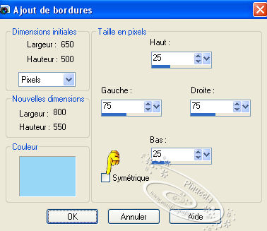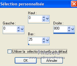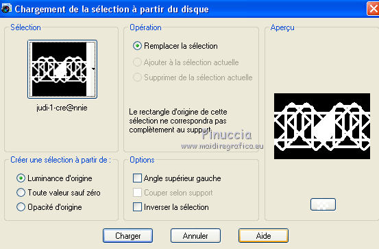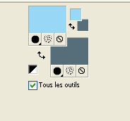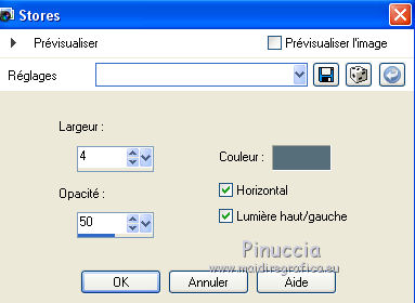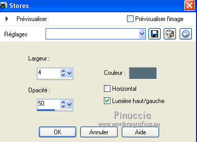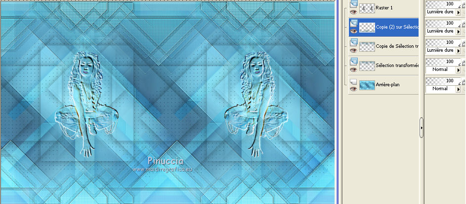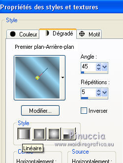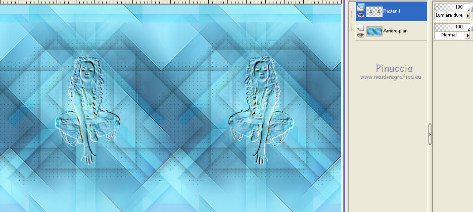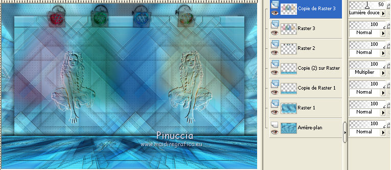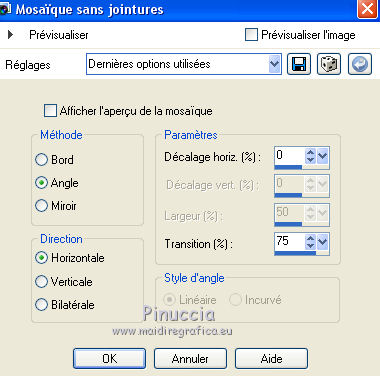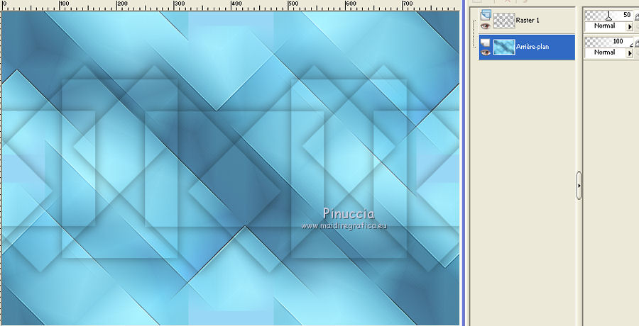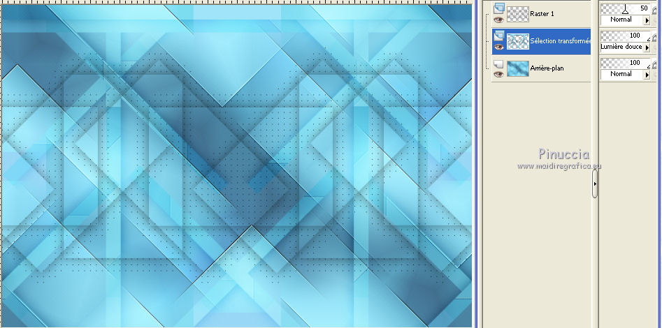Ce tutoriel a été créé avec CorelX6 et traduit avec CorelX12, mais peut également être exécuté avec les autres versions. Suivant la version utilisée, vous pouves obtenir des résultats différents. Depuis la version X4, la fonction Image>Miroir a été remplacée par Image>Renverser horizontalement, et Image>Renverser avec Image>Renverser verticalement. Dans les versions X5 et X6, les fonctions ont été améliorées par la mise à disposition du menu Objets. Avec la nouvelle version X7, nous avons encore Image>Miroir et Image>Renverser/Retourner, mais avec nouvelles différences. Voir les détails à ce sujet ici Certaines dénominations ont changées entre les versions de PSP. Les plus frequentes dénominations utilisées: ![]() Traduction en italien ici Vos versions ici Nécessaire pour réaliser ce tutoriel: Matériel ici Pour le tube merci Danimage Garder le nom du tube. Le © appartient à l'artiste original. Garder le crédit de ceux qui ont créé le tube. Modules Externes: consulter, si nécessaire, ma section des filtres ici Filters Unlimited 2.0 ici Toadies - What are you ici Ap Lines - Lines SilverLining ici Mura's Meister - Copies ici Mura's Meister - Perspective Tiling ici Mehdi - Sorting Tiles ici AAA Frames - Foto Frame ici Filtres Toadies peuvent être utilisés seuls ou importés dans Filters Unlimited. voir comment le faire ici). Si un filtre est fourni avec cette icône, ![]() Placer les sélections dans le dossier Sélections. 1. Ouvrir une nouvelle image transparente 650 x 500 pixels. 2. Placer en avant plan la couleur claire #98d8f6, et en arrière plan la couleur foncée #566d7a. ![]() 3. Préparer un dégradé de premier plan/arrière plan, style Linéaire. ![]() Remplir l'image transparente du dégradé.4. Effets>Modules Externes>Mehdi - Sorting Tiles. ![]() Effets>Effets de bords>Accentuer davantage. 5. Calques>Dupliquer. Image>Miroir. Image>Renverser. Placer le calque en mode Recouvrement. ![]() 6. Image>Ajouter des bordures, symétrique décoché, couleur d'avant plan. ![]() 7. Effets>Effets d'image>Mosaïque sans jointures, par défaut. ![]() 8. Calques>Nouveau calque raster. Activer l'outil Sélection ![]() (peu importe le type de sélection, parce que avec la sélection personnalisée vous obtenez toujours un rectangle), cliquer sur Sélection personnalisée ![]() et setter ces paramètres. ![]() 9. Effets>Effets 3D>Ombre portée, couleur noire. ![]() Sélections>Desélectionner tout. Résultat: ![]() 10. Effets>Modules Externes>Mura's Meister - Copies. ![]() Réduire l'opacité de ce calque à 50%. Image>Renverser. 11. Vous positionner sur le calque du bas de la pile. ![]() 12. Sélections>Charger/Enregistrer une sélection>Charger à partir du disque. Chercher et charger la sélection judi-1-cre@nnie. ![]() 13. Effets>Modules Externes>AP [lines] - Lines SilverLining. ![]() 14. Sélection personnalisée ![]() ![]() Sélections>Transformer la sélection en calque. 15. Effets>Effets 3D>Ombre portée, comme précédemment. Sélections>Desélectionner tout. 16. Effets>Modules Externes>Mura's Meister - Copies, comme précédemment. Placer le calque en mode Lumière douce. ![]() 17. Image>Ajouter des bordures, symétrique décoché, couleur d'arrière plan. ![]() 18. Effets>Effets d'image>Mosaïque sans jointures. ![]() 19. Activer le tube danimage judi - Édition>Copier. ne pas ferme le tube: on va s'en servir plus tard Revenir sur votre travail et Édition>Coller comme nouveau calque. 20. Image>Redimensionner, à 40%, redimensionner tous les calques décoché. 21. Effets>Effets de textures>Gaufrage. 22. Effets>Effets d'image>Décalage. ![]() 23. Calques>Dupliquer. Image>Miroir. Déplacer ce tube un peu plus à droite.Calques>Fusionner>Fusionner le calque de dessous. Placer le calque en mode Lumière dure. ![]() 24. Vous positionner sur le calque du bas de la pile. Sélections>Charger/Enregistrer une sélection>Charger à partir du disque. Chercher et charger la sélection judi-2-cre@nnie. ![]() Sélections>Transformer la sélection en calque. Sélections>Desélectionner tout. 25. Effets>Effets 3D>Ombre portée, couleur noire. ![]() 26. Effets>Effets de textures>Stores, couleur d'arrière plan. ![]() Répéter Effets>Effets de textures>Stores, mais Horizontal décoché. ![]() 27. Effets>Modules Externes>Toadies - What are you, par défaut. ![]() Effets>Effets de bords>Accentuer. 28. Calques>Dupliquer. Placer le calque en mode Lumière dure. 29. Calques>Dupliquer. Image>Renverser. Résultat: ![]() 30. Sélections>Sélectionner tout. Image>Ajouter des bordures, 50 pixels, symétrique, couleur d'arrière plan. 31. Édition>Copier (cette image sera en mémoire jusqu'à l'étape 37). 32. Effets>Effets d'image>Mosaïque sans jointures, par défaut. ![]() 33. Sélections>Inverser. Réglage>Flou>Flou gaussien - rayon 10. ![]() 34. Effets>Modules Externes>AP [lines] - Lines SilverLining, comme précédemment. Sélections>Desélectionner tout. 35. Effets>Modules Externes>Mura's Meister - Perspective Tiling. ![]() 36. Image>Renverser. 37. Édition>Coller comme nouveau calque. 38. Effets>Effets 3D>Ombre portée, couleur noire. ![]() 39. Calques>Dupliquer. Effets>Modules Externes>Mura's Meister - Perspective Tiling. ![]() 40. Effets>Effets 3D>Ombre portée, comme précédemment. 41. Calques>Dupliquer. Placer le calque en mode Multiplier. 42. Activer le tube disco-lampen, Édition>Copier. Revenir sur votre travail et Édition>Coller comme nouveau calque. 43. Effets>Effets d'image>Décalage. ![]() Effets>Effets de bords>Eroder. 44. Apri il tube lichtstralen, Édition>Copier. Revenir sur votre travail et Édition>Coller comme nouveau calque. 45. Effets>Effets d'image>Décalage. ![]() 46. Calques>Dupliquer. Placer ce calque en mode Lumière douce et réduire l'opacité à 50%. ![]() 47. Sélections>Sélectionner tout. Image>Ajouter des bordures, 2 pixels, symétrique, couleur d'arrière plan. Image>Ajouter des bordures, 5 pixels, symétrique, couleur d'avant plan. Ajo