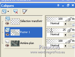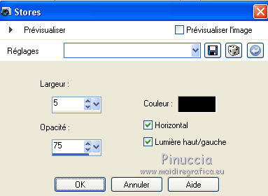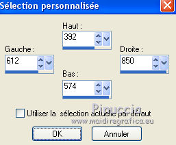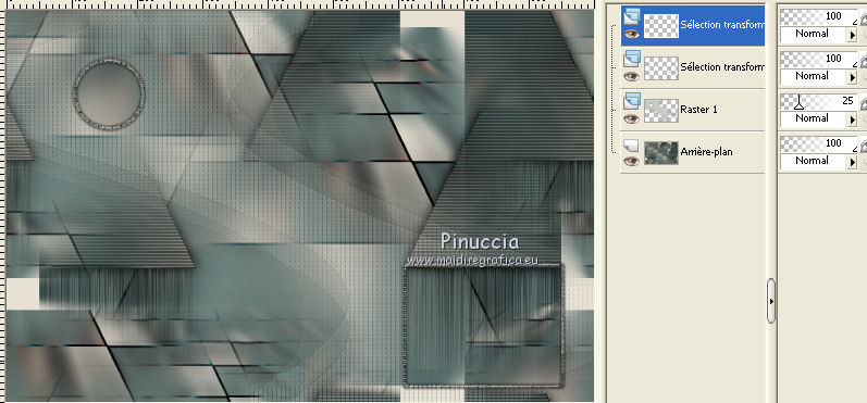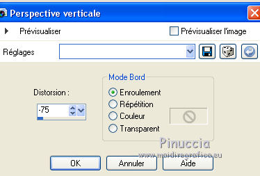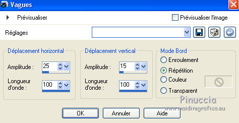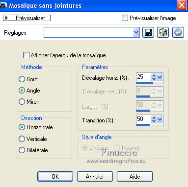 Ce tutoriel a été créé avec CorelX6 et traduit avec CorelX12, mais il peut également être exécuté avec les autres versions. Suivant la version utilisée, vous pouvez obtenir des résultats différents. Depuis la version X4, la fonction Image>Miroir a été remplacée par Image>Renverser horizontalement, et Image>Renverser avec Image>Renverser verticalement. Dans les versions X5 et X6, les fonctions ont été améliorées par la mise à disposition du menu Objets. Avec la nouvelle version X7, nous avons encore Image>Miroir et Image>Renverser/Retourner, mais avec nouvelles différences. Voir les détails à ce sujet ici Certaines dénominations ont changées entre les versions de PSP. Les plus frequentes dénominations utilisées: ![]() Traduction en italien ici Vos versions ici Nécessaire pour réaliser ce tutoriel: Matériel ici Pour le tube merci Jeanne Modules Externes: consulter, si nécessaire, ma section des filtres ici Filters Unlimited 2.0 ici Toadies - What are you ici DSB Flux ici Simple ici AAA Frames - Foto Frame ici Alien Skin Eye Candy 5 Impact - Glass, Perspective Shadow ici Filtres Toadies et Simple peuvent être utilisés seuls ou importés dans Filters Unlimited. voir comment le faire ici). Si un filtre est fourni avec cette icône, ![]() en fonction des couleurs utilisées, vous pouvez changer le mode mélange et l'opacité des calques. Dans les plus récentes versions de PSP, vous ne trouvez pas le dégradé d'avant plan/arrière plan ou Corel_06_029. Vous pouvez utiliser le dégradé des versions antérieures. Ici le dossier Dégradés de CorelX. Placer le preset En cliquant sur le preset une ou deux fois (selon vos réglages) automatiquement il se placera directement dans le dossier Settings de Alien Skin Eye Candy. pourquoi un ou deux clic voir ici Placer les sélections dans le dossier Sélections. 1. Ouvrir une nouvelle image transparente 650 x 500 pixels. 2. Placer en avant plan la couleur claire #e6e1d4, et en arrière plan la couleur foncée #566d6b. ![]() 3. Remplir l'image transparente avec la couleur d'arrière plan.4. Sélections>Sélectionner tout. Ouvrir le tube Jeanne_Woman_Lady_05-03-2016 - effacer le watermark - Édition>Copier. Revenir sur votre travail et Édition>Coller dans la sélection. Sélections>Désélectionner tout. 5. Effets>Effets d'image>Mosaïque sans jointures, par défaut. ![]() 6. Réglage>Flou>Flou gaussien - rayon 20. ![]() 7. Effets>Modules Externes>DSB Flux - Linear Transmission. ![]() 8. Effets>Effets géométriques>Perspective verticale. ![]() Effets>Effets de bords>Accentuer davantage. Effets>Effets de bords>Éroder. 9. Image>Ajouter des bordures, symétrique décoché, couleur d'arrière plan. ![]() 10. Effets>Effets d'image>Mosaïque sans jointures ![]() 11. Sélections>Charger/Enregistrer une sélection>Charger à partir du disque. Chercher et charger la sélection kaitlin-1-cre@nnie. ![]() Sélections>Transformer la sélection en calque. 12. Effets>Effets de textures>Stores, couleur noire. ![]() Sélections>Désélectionner tout. 13. Effets>Effets 3D>Ombre portée, couleur noire. ![]() 14. Image>Renverser. Calques>Dupliquer. Image>Miroir. Calques>Fusionner>Fusionner le calque de dessous. 15. Calques>Dupliquer. Effets>Modules Externes>DSB Flux - Blast. ![]() 16. Calques>Agencer>Déplacer vers le bas. 17. Image>Ajouter des bordures, symétrique décoché, couleur d'avant plan. ![]() 18. Effets>Effets d'image>Mosaïque sans jointures, comme précédemment. 19. Calques>Nouveau calque raster. Sélections>Charger/Enregistrer une sélection>Charger à partir du disque. Chercher et charger la sélection kaitlin-2-cre@nnie. ![]() 20. Remplir la sélection avec la couleur d'avant plan.Réduire l'opacité de ce calque à 25%. Sélections>Désélectionner tout. 21. Effets>Effets de distorsion>Vagues. ![]() 22. Effets>Effets de textures>Textile. Couleur du tissage: couleur d'avant plan couleur des interstices: couleur d'arrière plan. ![]() 23. Effets>Modules Externes>Toadies - What are you. ![]() Effets>Effets de bords>Accentuer. 24. Sélections>Charger/Enregistrer une sélection>Charger à partir du disque. Chercher et charger la sélection kaitlin-3-cre@nnie. ![]() Presser CANC sur le clavier ![]() 25. Sélections>Modifier>Sélectionner les bordures de la sélection. ![]() 26. Effets>Modules Externes>Alien Skin Eye Candy 5 Impact - Glass. Sélectionner le preset Clear et ok. ![]() Sélections>Transformer la sélection en calque. 27. Effets>Effets 3D>Ombre portée, couleur noire. ![]() 28. Effets>Modules Externes>DSB Flux - Bright Noise. ![]() 29. Vous positionner sur le calque de dessous - raster 1. ![]() Activer l'outil Sélection ![]() (peu importe le type de sélection, parce que avec la sélection personnalisée vous obtenez toujours un rectangle), cliquer sur Sélection personnalisée ![]() et setter ces paramètres. ![]() Presser CANC sur le clavier. 30. Sélections>Modifier>Sélectionner les bordures de la sélection, comme précédemment. 31. Effets>Modules Externes>Alien Skin Eye Candy 5 Impact - Glass, comme précédemment. 32. Sélections>Transformer la sélection en calque. Effets>Effets 3D>Ombre portée, comme précédemment. 33. Effets>Modules Externes>DSB Flux - Bright Noise, comme précédemment. Sélections>Désélectionner tout. 34. Vous positionner sur le calque du haut de la pile. ![]() Calques>Fusionner>Fusionner le calque de dessous. 35. Calques>Dupliquer. Effets>Effets d'image>Mosaïque sans jointures, par défaut. ![]() 36. Image>Renverser. Effets>Effets de bords>Éroder. 37. Vous positionner sur le calque de dessous de l'original (sélection transformée 1). ![]() Effets>Modules Externes>Alien Skin Eye Candy 5 Impact - Perspective Shadow sélectionner le preset kaitlin-cre@nnie et ok. Ci-dessous les réglages en cas de problèmes avec le preset. ![]() 38. Calques>Fusionner>Calques visibles. 39. Effets>Modules Externes>Toadies - Sucking Toad Bevel II.2. ![]() 40. Calques>Dupliquer. Effets>Modules Exte