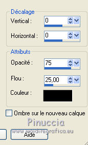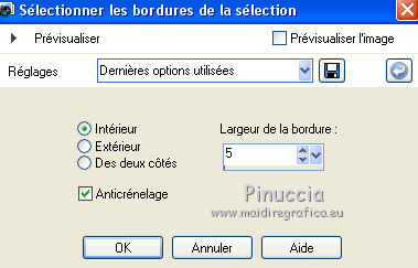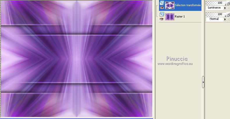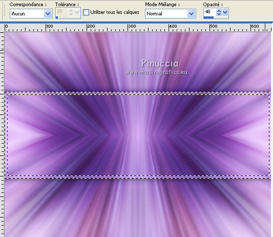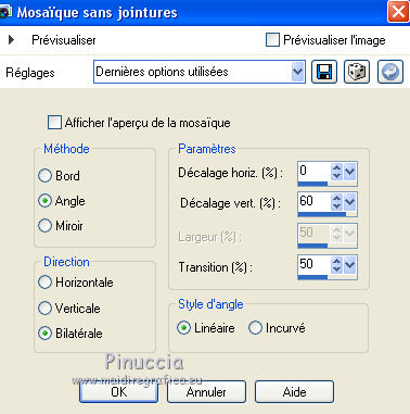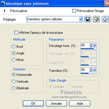 Ce tutoriel a été créé avec CorelX6 et traduit avec CorelX12, mais il peut également être exécuté avec les autres versions. Suivant la version utilisée, vous pouvez obtenir des résultats différents. Depuis la version X4, la fonction Image>Miroir a été remplacée par Image>Renverser horizontalement, et Image>Renverser avec Image>Renverser verticalement. Dans les versions X5 et X6, les fonctions ont été améliorées par la mise à disposition du menu Objets. Avec la nouvelle version X7, nous avons encore Image>Miroir et Image>Renverser/Retourner, mais avec nouvelles différences. Voir les détails à ce sujet ici Certaines dénominations ont changées entre les versions de PSP. Les plus frequentes dénominations utilisées: ![]() Traduction en italien ici Vos versions ici Nécessaire pour réaliser ce tutoriel: Matériel ici Pour le tube merci Gabry et pour le masque Narah Modules Externes: consulter, si nécessaire, ma section des filtres ici Filters Unlimited 2.0 ici Graphics Plus - Cross shadow, Horizontal Mirror, Quick Tile I, Quick Tile II ici Mura's Meister - Perspective Tiling ici Filtres Graphics Plus peuvent être utilisés seuls ou importés dans Filters Unlimited. voir comment le faire ici). Si un filtre est fourni avec cette icône, ![]() en fonction des couleurs utilisées, vous pouvez changer le mode mélange et l'opacité des calques. Placer les sélections dans le dossier Sélections. Ouvrir le masque dans PSP et le minimiser avec le reste du matériel. 1. Ouvrir une nouvelle image transparente 650 x 500 pixels. 2. Placer en avant plan la couleur claire #debffa, et en arrière plan la couleur foncée #47265b. ![]() 3. Remplir l'image transparente avec la couleur de premier plan.4. Sélections>Sélectionner tout. Activer le tube gabry-woman947, Édition>Copier. ne pas fermer le tube: on va s'en servir plus tard Revenir sur votre travail et Édition>Coller dans la sélection. Sélections>Désélectionner tout. 5. Effets>Modules Externes>Graphics Plus - Horizontal mirror. ![]() 6. Réglage>Flou>Flou radial. ![]() 7. Calques>Dupliquer. Placer le calque en mode Lumière dure. Calques>Fusionner>Fusionner le calque de dessous. 8. Effets>Modules Externes>Graphics Plus - Quick Tile I. ![]() 9. Activer l'outil Sélection ![]() (peu importe le type de sélection, parce que avec la sélection personnalisée vous obtenez toujours un rectangle), cliquer sur Sélection personnalisée ![]() et setter ces paramètres. ![]() 10. Sélections>Transformer la sélection en calque. 11. Effets>Effets 3D>Ombre portée, couleur noire. ![]() 12. Sélections>Modifier>Sélectionner les bordures de la sélection. ![]() 13. Réduire l'opacité de l'outil Pot de peinture à 40, et remplir la sélection avec la couleur d'avant plan.![]() Sélections>Désélectionner tout. 14. Effets>Effets d'image>Mosaïque sans jointures, par défaut. ![]() Placer le calque en mode Luminance. ![]() 15. Effets>Effets de bords>Dilater. Calques>Fusionner>Fusionner le calque de dessous. 16. Édition>Copier. l'image sera en mémoire jusqu'à point 27. Si vous voulez, par précaution, Édition>coller comme nouvelle image et la minimiser 17. Image>Ajouter des bordures, symétrique décoché, couleur d'avant plan. ![]() 18. Effets>Modules Externes>Graphics Plus - Quick Tile II. ![]() 19. Sélections>Charger/Enregistrer une sélection>Charger à partir du disque. Chercher et charger la sélection kelly-1-cre@nnie. ![]() Sélections>Transformer la sélection en calque. 20. Effets>Effets 3D>Ombre portée, couleur noire. ![]() Sélections>Désélectionner tout. 21. Effets>Modules Externes>Graphics Plus - Horizontal mirror. ![]() 22. Calques>Dupliquer. Placer le calque en mode Écran. ![]() 23. Calques>Fusionner>Fusionner le calque de dessous. Effets>Effets de bords>Accentuer davantage. 24. Image>Ajouter des bordures, comme précédemment. ![]() 25. Effets>Effets d'image>Mosaïque sans jointures. ![]() 26. Calques>Nouveau calque raster. Sélection personnalisée ![]() ![]() 27. Édition>Coller dans la sélection (l'image en mémoire du point 16). ![]() 28. Effets>Effets 3D>Ombre portée, comme précédemment. 29. Sélections>Modifier>Sélectionner les bordures de la sélection, comme précédemment. 30. Remplir la sélection avec la couleur d'avant plan,opacité toujours à 40. ![]() Sélections>Désélectionner tout. 31. Effets>Effets d'image>Mosaïque sans jointures, comme précédemment. 32. Vous positionner sur le calque du bas de la pile. Calques>Nouveau calque raster. 33. Sélections>Charger/Enregistrer une sélection>Charger à partir du disque. Chercher et charger la sélection kelly-2-cre@nnie. ![]() 34. Placer à nouveau à 100 l'opacité de l'outil Pot de peinture, et remplir la sélection avec la couleur d'arrière plan.Sélections>Désélectionner tout. 35. Effets>Effets de textures>Stores - couleur d'avant plan. ![]() 36. Réglage>Flou>Flou. 37. Vous positionner sur le calque du bas de la pile. Sélections>Charger/Enregistrer une sélection>Charger à partir du disque. Chercher et charger la sélection kelly-3-cre@nnie. ![]() Sélections>Transformer la sélection en calque. Sélections>Désélectionner tout. 38. Image>Renverser. Effets>Effets d'image>Décalage. ![]() 39. Effets>Effets de textures>Stores, comme précédemment. 40. Réduire l'opacité de ce calque à 25%. Calques>Agencer>Placer en haut de la pile. ![]() 41. Image>Ajouter des bordures, 25 pixels, symétrique, couleur d'avant plan. 42. Effets>Effets d'image>Mosaïque sans jointures. ![]() 43. Calques>Nouveau calque raster. Remplir avec la couleur d'avant plan.44. Calques>Nouveau calque de masque>A partir d'une image. Ouvrir le menu deroulant sous la fenêtre d'origine et vous verrez la liste des images ouverts. Sélectionner le masque Narah_mask_0774. ![]() Calques>Fusionner>Fusionner le groupe. 45. Effets>Effets de textures>Gaufrage. Réduire l'opacité de ce calque à 20%. ![]() 46. Vous positionner sur le calque du bas de la pile. Activer l