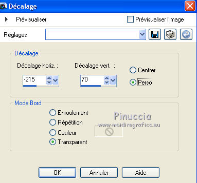 Ce tutoriel a été créé avec CorelX6 et traduit avec CorelX12, mais il peut également être exécuté avec les autres versions. Suivant la version utilisée, vous pouvez obtenir des résultats différents. Depuis la version X4, la fonction Image>Miroir a été remplacée par Image>Renverser horizontalement, et Image>Renverser avec Image>Renverser verticalement. Dans les versions X5 et X6, les fonctions ont été améliorées par la mise à disposition du menu Objets. Avec la nouvelle version X7, nous avons encore Image>Miroir et Image>Renverser/Retourner, mais avec nouvelles différences. Voir les détails à ce sujet ici Certaines dénominations ont changées entre les versions de PSP. Les plus frequentes dénominations utilisées: ![]() Traduction en italien ici Vos versions ici Nécessaire pour réaliser ce tutoriel: Matériel ici Pour le tube et le masque merci Linda Modules Externes: consulter, si nécessaire, ma section des filtres ici Filters Unlimited 2.0 ici &<Bkg Kaleidoscope> - @BlueBerry Pie (à importer dans Unlimited) ici Tramages - Tow the line ici Toadies ici Alien Skin Eye Candy 5 Impact - Glass ici Filtres Toadies et Tramages peuvent être utilisés seuls ou importés dans Filters Unlimited. voir comment le faire ici). Si un filtre est fourni avec cette icône, ![]() en fonction des couleurs utilisées, vous pouvez changer le mode mélange et l'opacité des calques. Dans les plus récentes versions de PSP, vous ne trouvez pas le dégradé d'avant plan/arrière plan ou Corel_06_029. Vous pouvez utiliser le dégradé des versions antérieures. Ici le dossier Dégradés de CorelX. Placer le preset En cliquant sur le preset une ou deux fois (selon vos réglages) automatiquement il se placera directement dans le dossier Settings de Alien Skin Eye Candy. pourquoi un ou deux clic voir ici Placer les sélections dans le dossier Sélections. Placer le masque 20-20 dans le dossier Masque. Ouvrir le masque de Linda dans PSP et le minimiser aver le reste du matériel. 1. Ouvrir une nouvelle image transparente 650 x 500 pixels. 2. Placer en avant plan la couleur claire #e8cdca, et en arrière plan la couleur foncée #a17b73. ![]() 3. Préparer en avant plan un dégradé de premier plan/arrière plan, style Radial. ![]() Remplir l'image transparente du dégradé.4. Calques>Dupliquer. Effets>Effets de distorsion>Coordonnées polaires. ![]() 5. Placer le calque en mode Lumière douce et réduire l'opacité à 50%. 6. Calques>Fusionner>Fusionner le calque de dessous. 7. Calques>Dupliquer. Image>Renverser. 8. Image>Redimensionner, à 65%, redimensionner tous les calques décoché. 9. Image>Ajouter des bordures, symétrique décoché, couleur d'avant plan. ![]() 10. Effets>Effets d'image>Mosaïque sans jointures. ![]() 11. Calques>Dupliquer. 12. Effets>Modules Externes>Filters Unlimited 2.0 - [AFS IMPORT] - sqborder2, par défaut. ![]() 13. Placer le calque en mode Multiplier. 14. Calques>Fusionner>Fusionner le calque de dessous. 15. Effets>Effets d'image>Mosaïque sans jointures, par défaut. ![]() 16. Effets>Modules Externes>Filters Unlimited 2.0 - &<Bkg Kaleidoscope> - @BlueBerry pye. ![]() 17. Image>Ajouter des bordures, symétrique décoché, couleur d'avant plan. ![]() 18. Effets>Effets d'image>Mosaïque sans jointures. ![]() 19. Activer l'outil Sélection ![]() (peu importe le type de sélection, parce que avec la sélection personnalisée vous obtenez toujours un rectangle), cliquer sur Sélection personnalisée ![]() et setter ces paramètres. ![]() Sélectionner>Transformer la sélection en calque. 20. Effets>Effets 3D>Ombre portée, couleur noire. ![]() 21. Calques>Fusionner>Fusionner le calque de dessous. 22. Sélections>Charger/Enregistrer une sélection>Charger à partir du disque. Chercher et charger la sélection lindA-1-cre@nnie. ![]() Sélectionner>Transformer la sélection en calque. 23. Effets>Modules Externes>Tramages - Tow the line. ![]() Sélectionner>Désélectionner tout. 24. Calques>Dupliquer. Image>Miroir. Calques>Fusionner>Fusionner le calque de dessous. 25. Vous positionner sur le calque du bas de la pile. Sélections>Charger/Enregistrer une sélection>Charger à partir du disque. Chercher et charger la sélection lindA-2-cre@nnie. ![]() Sélectionner>Transformer la sélection en calque. 26. Effets>Modules Externes>Tramages - TeeWee. ![]() 27. Effets>Effets 3D>Ombre portée, comme précédemment. Réduire l'opacité de ce calque à 50%. 28. Vous positionner sur le calque du bas de la pile. Sélection personnalisée ![]() ![]() Sélectionner>Transformer la sélection en calque. Sélectionner>Désélectionner tout. 29. Effets>Modules Externes>Toadies - What are you. ![]() 30. Effets>Modules Externes>Tramages, TeeWee, comme précédemment. 31. Réduire l'opacité de ce calque à 50%. 32. Calques>Dupliquer. Image>Renverser. Vous devriez avoir ce-ci. ![]() Calques>Fusionner>Calques visibles. 33. Édition>Copier. 34. Calques>Nouveau calque raster. 35. Sélection personnalisée ![]() ![]() 36. Édition>Coller dans la sélection. Effets>Effets de bords>Accentuer. 37. Effets>Modules Externes>Alien Skin Eye Candy 5 Impact - Glass. Sélectionner le preset LindA-cre@nnie et ok. ![]() Ci-dessous les règlages en cas de problèmes avec le preset. ![]() 38. Sélectionner>Désélectionner tout. 39. Calques>Dupliquer. Effets>Effets d'image>Décalage. ![]() 40. Calques>Dupliquer. Effets>Effets d'image>Décalage, comme précédemment. ![]() 41. Calques>Fusionner>Fusionner le calque de dessous. Édition>Répéter Fusionner le calque de dessous. 42. Effets>Effets 3D>Ombre portée, couleur noire. ![]() 43. Calques>Nouveau calque raster. Placer en avant plan la Couleur. 44. Sélections>Charger/Enregistrer une sélection>Charger à partir du disque. Chercher et charger la sélection lindA-3-cre@nnie. ![]() Remplir la sélection avec la couleur d'avant plan.Sélectionner>Désélectionner tout. 45. Effets>Effets de bords>Accentuer davantage. Édition>Répéter Accentuer davantage. 