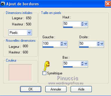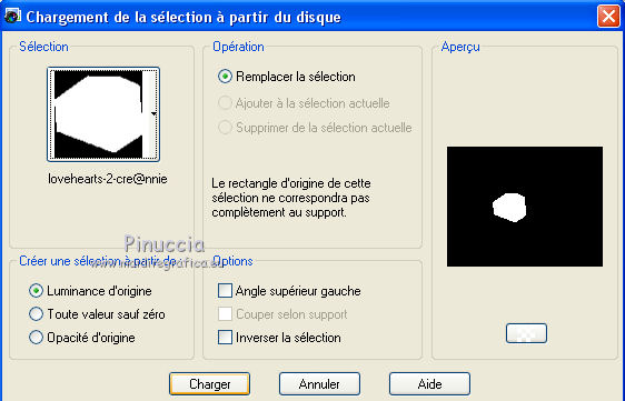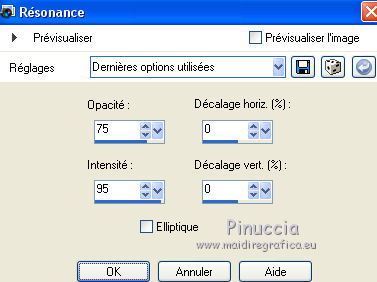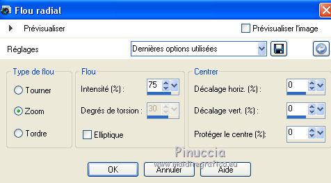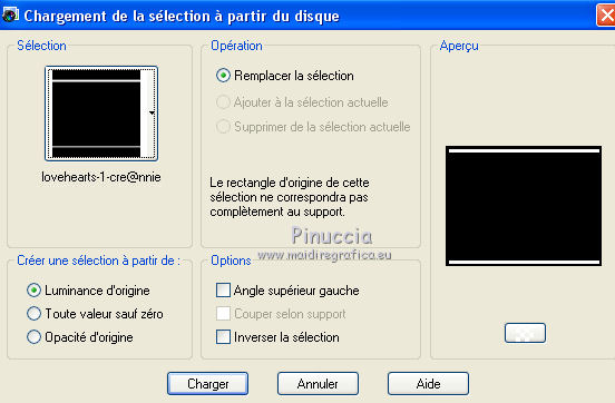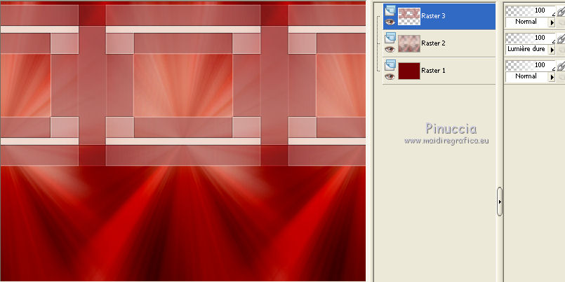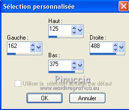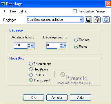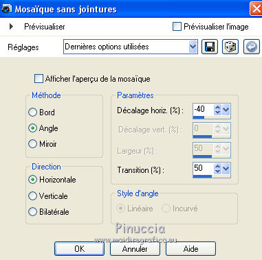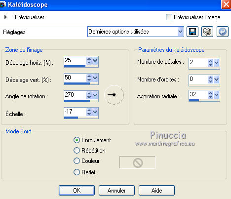 Ce tutoriel a été créé avec CorelX6 et traduit avec CorelX12, mais il peut également être exécuté avec les autres versions. Suivant la version utilisée, vous pouvez obtenir des résultats différents. Depuis la version X4, la fonction Image>Miroir a été remplacée par Image>Renverser horizontalement, et Image>Renverser avec Image>Renverser verticalement . Dans les versions X5 et X6, les fonctions ont été améliorées par la mise à disposition du menu Objets. Avec la nouvelle version X7, nous avons encore Image>Miroir et Image>Renverser/Retourner, mais avec nouvelles différences. Voir les détails à ce sujet ici Certaines dénominations ont changées entre les versions de PSP. Les plus frequentes dénominations utilisées: ![]() Traduction en italien ici Vos versions ici Nécessaire pour réaliser ce tutoriel: Matériel ici Pour les tubes merci Karine e Guismo Garder le nom du tube. Le © appartient à l'artiste original. Garder le crédit de ceux qui ont créé le tube. Modules Externes: consulter, si nécessaire, ma section des filtres ici Filters Unlimited 2.0 ici Toadies - What are you - Banding Supress Noise ici Filtres Toadies peuvent être utilisés seuls ou importés dans Filters Unlimited. voir comment le faire ici). Si un filtre est fourni avec cette icône, ![]() Placer les sélections dans le dossier Sélections. 1. Ouvrir une nouvelle image transparente 650 x 500 pixels. 2. Placer en avant plan la couleur claire #f1dacf, et en arrière plan la couleur foncée #760104. ![]() 3. Remplir l'image transparente avec la couleur d'arrière plan.4. Activer le tube k@rine_dreams_Lady_Heart_Janvier_2011, Édition>Copier. ne pas fermer le tube; on va s'en servir plus tard Revenir sur votre travail et Édition>Coller comme nouveau calque. 5. Effets>Effets d'image>Mosaïque sans jointures, par défaut. ![]() 6. Réglage>Flou>Flou radial. ![]() Placer le calque en mode Lumière dure. 7. Effets>Effets d'image>Mosaïque sans jointures. ![]() 8. Calques>Nouveau calque raster. Activer l'outil Sélection ![]() (peu importe le type de sélection, parce que avec la sélection personnalisée vous obtenez toujours un rectangle), cliquer sur Sélection personnalisée ![]() et setter ces paramètres. ![]() Remplir la sélection avec la couleur d'avant plan.9. Sélections>Modifier>Contracter - 50 pixels. Presser CANC sur le clavier ![]() Sélections>Désélectionner tout. 10. Effets>Modules Externes>Toadies - What are you. ![]() Effets>Effets de bords>Accentuer. 11. Effets>Effets d'image>Mosaïque sans jointures, comme précédemment. 12. Effets>Effets d'image>Décalage. ![]() Vous devriez avoir ce-ci. ![]() 13. Sélections>Sélectionner tout. Sélections>Flottante. Sélections>Statique. 14. Calques>Nouveau calque raster. Activer l'image de fond "achtergrond", Édition>Copier. Revenir sur votre travail et Édition>Coller dans la sélection. Calques>Fusionner>Fusionner le calque de dessous. Sélections>Désélectionner tout. 15. Effets>Effets 3D>Ombre portée, couleur noire. ![]() Résultat. ![]() 16. Image>Ajouter des bordures, symétrique décoché, couleur d'avant plan. ![]() 17. Effets>Effets d'image>Mosaïque sans jointures, comme précédemment. 18. Activer l'outil Baguette magique ![]() ![]() cliquer sur les bords en haut et en bas pour les sélectionner. ![]() 19. Calques>Nouveau calque raster. Édition>Coller dans la sélection (l'image de fond "achtergrond" est toujours en mémoire). Sélections>Désélectionner tout. 20. Effets>Effets 3D>Ombre portée, comme précédemment. Résultat: ![]() 21. Image>Ajouter des bordures, 50 pixels, symétrique, couleur d'avant plan. 22. Effets>Effets d'image>Mosaïque sans jointures. ![]() 23. Cliquer avec la baguette magique ![]() dans les bords en haut et en bas. ![]() 24. Sélections>Modifier>Contracter - 15 pixels. Remplir la sélection avec la couleur d'arrière plan.25. Sélections>Transformer la sélection en calque. Sélections>Désélectionner tout. 26. Effetti>Modules Externes>Toadies - What are you. ![]() 27. Calques>Fusionner>Fusionner le calque de dessous. 28. Sélections>Charger/Enregistrer une sélection>Charger à partir du disque. Chercher et charger la sélection lovehearts-1-cre@nnie. ![]() 29. Effetti>Modules Externes>Toadies - Banding Supress Noise. ![]() Effets>Effets de bords>Accentuer davantage. 30. Effets>Effets 3D>Ombre portée, couleur noire. ![]() 31. Sélections>Transformer la sélection en calque. Sélections>Désélectionner tout. 32. Effets>Effets de distorsion>Coordonnées polaires. ![]() 33. Effets>Effets de réflexion>Kaléidoscope. ![]() 34. Sélections>Charger/Enregistrer une sélection>Charger à partir du disque. Chercher et charger la sélection lovehearts-2-cre@nnie. ![]() 35. Édition>Couper - (ce commande coupe, mais tient aussi en mémoire). Sélections>Désélectionner tout. 36. Calques>Supprimer (le calque ne vous sert plus) et répondre oui. ![]() Édition>Coller comme nouveau calque. Résultat. ![]() 37. Image>Rotation libre - 90 degrés à droite. ![]() 38. Effets>Effets d'image>Décalage. ![]() 39. Effets>Effets 3D>Ombre portée, comme précédemment. 40. Calques>Dupliquer. Effets>Effets d'image>Décalage. ![]() 41. Vous positionner sur le calque du bas de la pile. Sélection personnalisée ![]() ![]() Sélections>Transformer la sélection en calque. Sélections>Désélectionner tout. 42. Effets>Effets de réflexion>Résonance. ![]() 43. Effets>Effets 3D>Ombre portée, comme précédemment. 44. Placer le calque en mode Lumière dure. 45. Sélections>Sélectionner tout. Image>Ajouter des bordures, symétrique décoché, couleur d'arrière plan. ![]() 46. Effets>Effets d'image>Mosaïque sans jointures, par défaut. ![]() 47. Effets>Effets 3D>Ombre portée, comme précédemment. Sélections>Désélectionner tout. 48. Activer le tube calguisdecorlove27102011. Activer l'outil Sélection au lasso ![]() et sélectionner le tube noire. ![]() Édition>Copier, et minimiser le tube. Revenir sur votre tra
