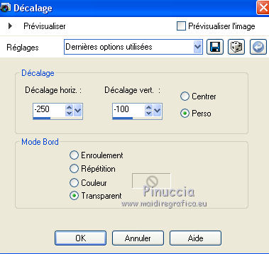 Ce tutoriel a été créé avec CorelX6 et traduit avec CorelX12, mais peut également être exécuté avec les autres versions. Suivant la version utilisée, vous pouvez obtenir des résultats différents. Depuis la version X4, la fonction Image>Miroir a été remplacée par Image>Renverser horizontalement, et Image>Renverser avec Image>Renverser verticalement. Dans les versions X5 et X6, les fonctions ont été améliorées par la mise à disposition du menu Objets. Avec la nouvelle version X7, nous avons encore Image>Miroir et Image>Renverser/Retourner, mais avec nouvelles différences. Voir les détails à ce sujet ici Certaines dénominations ont changées entre les versions de PSP. Les plus frequentes dénominations utilisées: ![]() Traduction en italien ici Vos versions ici Nécessaire pour réaliser ce tutoriel: Matériel ici Pour le tube de la femme merci AnaRidzi Modules Externes: consulter, si nécessaire, ma section des filtres ici Filters Unlimited 2.0 ici Mura's Meister - Copies ici Tramages ici Alf's Power Toys ici Alien Skin Xenofex 2.0 ici Alien Skin Eye Candy 5 Impact - Perspective Shadow ici Filtres Tramages et Alf's Power Toys peuvent être utilisés seuls ou importés dans Filters Unlimited. voir comment le faire ici). Si un filtre est fourni avec cette icône, ![]() en fonction des couleurs utilisées, vous pouvez changer le mode mélange et l'opacité des calques. Dans les plus récentes versions de PSP, vous ne trouvez pas le dégradé d'avant plan/arrière plan ou Corel_06_029. Vous pouvez utiliser le dégradé des versions antérieures. Ici le dossier Dégradés de CorelX. Placer le preset En cliquant sur le preset une ou deux fois (selon vos réglages) automatiquement il se placera directement dans le dossier Settings de Alien Skin Eye Candy. pourquoi un ou deux clic voir ici Placer les sélections dans le dossier Sélections. 1. Ouvrir une nouvelle image transparente 650 x 500 pixels. 2. Placer en avant plan la couleur claire #c4f1f7, et en arrière plan la couleur foncée #0a5185. ![]() 3. Préparer en avant plan un dégradé de premier plan/arrière plan, style Linéaire. ![]() Remplir l'image transparente avec la couleur d'arrière plan.4. Effets>Modules Externes>Tramages - Tow the line. ![]() 5. Calques>Dupliquer. Image>Miroir. Réduire l'opacité de ce calque à 50%. Calques>Fusionner>Fusionner le calque de dessous. 6. Effets>Modules Externes>Alf's Power Toys - Mirror Offset. ![]() 7. Calques>Nouveau calque raster. Remplir le calque du dégradé.8. Effets>Modules Externes>Alf's Power Toys - Split Distortion. ![]() Placer le calque en mode Lumière dure. 9. Réglage>Flou>Flou gaussien - rayon 15. ![]() Réduire l'opacité de ce calque à 70%. Calques>Fusionner>Fusionner le calque de dessous. 10. Sélections>Charger/Enregistrer une sélection>Charger à partir du disque. Chercher et charger la sélection loverings-1-cre@nnie. ![]() Sélections>Transformer la sélection en calque. 11. Effets>Effets 3D>Ombre portée, couleur noire. ![]() Sélections>Désélectionner tout. 12. Image>Rotation libre - 90 degrés à gauche. ![]() 13. Effets>Modules Externes>Mura's Meister - Copies. ![]() Calques>Fusionner>Fusionner le calque de dessous. 14. Effets>Effets d'image>Mosaïque sans jointures, par défaut. ![]() 15. Image>Ajouter des bordures, symétrique décoché, couleur blanche. ![]() 16. Effets>Effets d'image>Mosaïque sans jointures. ![]() 17. Image>Rotation à droite. Si vous utilisez PSP 9: Image>Rotation - Rotation de 90 degrés dans le sens horaire 18. Effets>Effets d'image>Mosaïque sans jointures, comme précédemment. Image>Rotation à gauche. Avec PSP 9: Image>Rotation - Rotation de 90 degrés dans le sens anti-joraire 19. Sélections>Charger/Enregistrer une sélection>Charger à partir du disque. Chercher et charger la sélection loverings-2-cre@nnie. ![]() Sélections>Transformer la sélection en calque. Sélections>Désélectionner tout. 20. Effets>Effets de distorsion>Miroir déformant. ![]() 21. Calques>Dupliquer. Image>Miroir. Calques>Fusionner>Fusionner le calque de dessous. 22. Effets>Effets géométriques>Perspective horizontale. ![]() 23. Effets>Effets 3D>Ombre portée, couleur noire. ![]() À nouveau Effets>Effets 3D>Ombre portée, couleur noire. ![]() 24. Calques>Nouveau calque raster. Sélections>Charger/Enregistrer une sélection>Charger à partir du disque. Chercher et charger la sélection loverings-3-cre@nnie. ![]() 25. Placer en avant plan la Couleur. Remplir la sélection avec la couleur d'avant plan.Réduire l'opacité de ce calque à 25%. Sélections>Désélectionner tout. 26. Effets>Modules Externes>Alien Skin Xenofex 2.0 - Shatter. ![]() Effets>Effets de bords>Accentuer davantage. Placer le calque en mode Multiplier. 27. Effets>Effets de distorsion>Vagues. ![]() 28. Vous positionner sur le calque du bas de la pile. Calques>Nouveau calque raster. Sélections>Charger/Enregistrer une sélection>Charger à partir du disque. Chercher et charger la sélection loverings-4-cre@nnie. ![]() 29. Ouvrir l'image "ringen" - Édition>Copier. Revenir sur votre travail et Édition>Coller dans la sélection. Sélections>Désélectionner tout. 30. Calques>Dupliquer. Image>Miroir. 31. Effets>Effets d'image>Décalage. ![]() 32. Calques>Fusionner>Fusionner le calque de dessous. Placer le calque en mode Éclaircir et réduire l'opacité à 60%. 33. Ouvrir le tube ring3 - Édition>Copier. Revenir sur votre travail et Édition>Coller comme nouveau calque. Calques>Agencer>Déplacer vers le haut. Image>Redimensionner, à 35%, redimensionner tous les calques décoché. Image>Miroir. 34. Effets>Effets d'image>Décalage. ![]() 35. Réduire pour le moment l'opacité de ce calque à 50%. Activer l'outil Sélection au lasso , point à point,et sélectionner la partie du bague qui devrait être couverte par le ruban. ![]() Presser CANC sur le clavier ![]() Sélections>Désélectionner tout. Placer à nouveau l'opacité du calque à 100. ![]() 36. Effets>Modules Ext