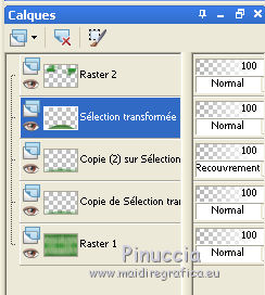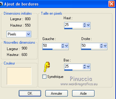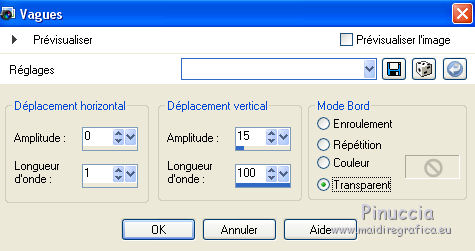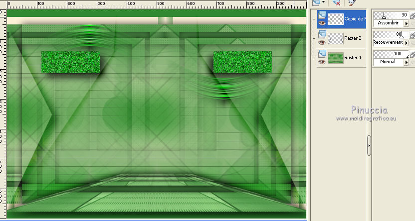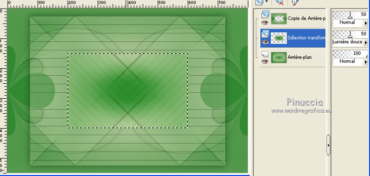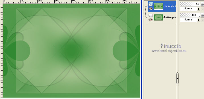 Ce tutoriel a été créé avec CorelX6 et traduit avec CorelX12, mais il peut également être exécuté avec les autres versions. Suivant la version utilisée, vous pouvez obtenir des résultats différents. Depuis la version X4, la fonction Image>Miroir a été remplacée par Image>Renverser horizontalement, et Image>Renverser avec Image>Renverser verticalement. Dans les versions X5 et X6, les fonctions ont été améliorées par la mise à disposition du menu Objets. Avec la nouvelle version X7, nous avons encore Image>Miroir et Image>Renverser/Retourner, mais avec nouvelles différences. Voir les détails à ce sujet ici Certaines dénominations ont changées entre les versions de PSP. Les plus frequentes dénominations utilisées: ![]() Traduction en italien ici Vos versions ici Nécessaire pour réaliser ce tutoriel: Matériel ici Pour le tube merci Franie Modules Externes: consulter, si nécessaire, ma section des filtres ici AP Lines - Lines SilverLining ici Si vous préférez AP 01 Innovation-Lines SilverLining ici le résultat ne change pas Mehdi - Wavy lab 1.1. ici Mehdi - Weaver, Sorting Tiles, Grain natural ici Mura's Meister - Perspective Tiling ici Flaming Pear - Ornament ici ![]() en fonction des couleurs utilisées, vous pouvez changer le mode mélange et l'opacité des calques. Placer la sélection dans le dossier Sélection. 1. Ouvrir une nouvelle image transparente 650 x 500 pixels. 2. Placer en avant plan la couleur claire #fcf0d6, et en arrière plan la couleur foncée #328932. ![]() 3. Effets>Modules Externes>Mehdi - Wavy Lab 1.1. Ce filtre travaille avec les couleurs de la palette Styles et Textures. La première est la couleur d'arrière plan, la deuxième est la couleur d'avant plan. Garder les autres couleurs crées par le filtre. ![]() 4. Effets>Modules Externes>Mehdi - Sorting Tiles. ![]() 5. Effets>Effets de bords>Accentuer davantage. 6. Calques>Dupliquer. Image>Miroir. Réduire l'opacité de ce calque à 50%. 7. Calques>Fusionner>Fusionner le calque de dessous. 8. Calques>Dupliquer. Image>Renverser. Réduire l'opacité de ce calque à 50%. 9. Calques>Fusionner>Fusionner le calque de dessous. 10. Effets>Effets de bords>Éroder. 11. Édition>Copier Vous devrez garder en mémoire l'image jusqu'à l'étape 27; Si vous voulez, pour précaution: Édition>Coller comme nouvelle image et minimiser 12. Image>Ajouter des bordures, symétrique décoché, couleur d'arrière plan. ![]() 13. Calques>Dupliquer. Effets>Modules Externes>Flaming Pear - Ornament. 14. Réduire l'opacité de ce calque à 50%. ![]() 15. Activer l'outil Sélection ![]() (peu importe le type de sélection, parce que avec la sélection personnalisée vous obtenez toujours un rectangle), cliquer sur Sélection personnalisée ![]() et setter ces paramètres. ![]() 16. Effets>Modules Externes>AP [Lines] ou, si vous préférez, AP 01 [Innovations] (le résultat ne change pas). ![]() 17. Effets>Effets 3D>Ombre portée, couleur noire. ![]() 18. Sélections>Modifier>Contracter - 125 pixels. ![]() Presser CANC sur le clavier ![]() 19. Vous positionner sur le calque du bas de la pile. Sélections>Transformer la sélection en calque. 20. Effets>Modules Externes>AP [Lines] ou AP 01 [Innovations] ![]() 21. Placer le calque en mode Lumière douce et réduire l'opacité à 50%. ![]() Sélections>Désélectionner tout. 22. Vous positionner sur le calque du haut de la pile. Effets>Effets 3D>Ombre portée, comme précédemment. 23. Calques>Fusionner>Calques visibles. 24. Effets>Effets d'image>Mosaïque sans jointures. ![]() 25. Sélections>Sélectionner tout. Image>Ajouter des bordures, symétrique décoché, couleur d'avant plan. ![]() 26. Sélections>Inverser. 27. Édition>Coller dans la sélection (vous devriez avoir en mémoire l'image copiée à l'étape 11). 28. Effets>Effets de textures>Textile. Couleur du tissage: couleur d'avant plan couleur des interstices: couleur d'arrière plan ![]() 29. Effets>Effets 3D>Ombre portée, comme précédemment. Sélections>Transformer la sélection en calque. Sélections>Désélectionner tout. 30. Image>Redimensionner, à 85%, rédimensionner tous les calques décoché. Effets>Effets 3D>Ombre portée, comme précédemment. 31. Calques>Fusionner>Fusionner le calque de dessous. 32. Effets>Effets d'image>Mosaïque sans jointures, Côte à côte. ![]() 33. Calques>Nouveau calque raster. Sélection personnalisée ![]() ![]() 34. Remplir la sélection avec la couleur d'arrière plan.35. Effets>Modules Externes>Mehdi - Grain natural. ![]() 36. Calques>Dupliquer. Placer le calque en mode Recouvrement. 37. Calques>Fusionner>Fusionner le calque de dessous. Sélections>Désélectionner tout. 38. Effets>Effets 3D>Ombre portée, couleur noire. ![]() 39. Calques>Dupliquer. Image>Miroir. Calques>Fusionner>Fusionner le calque de dessous. 40. Calques>Dupliquer. Effets>Modules Externes>Mehdi - Weaver. ![]() 41. Effets>Effets de distorsion>Vagues. ![]() 42. Calques>Fusionner>Fusionner le calque de dessous. 43. Vous positionner sur le calque du bas de la pile. Sélection personnalisée ![]() ![]() 44. Effets>Effets géométriques>Perspective verticale. ![]() Sélections>Transformer la sélection en calque. Sélections>Désélectionner tout. 45. Calques>Dupliquer. Effets>Modules Externes>Mehdi - Weaver, comme précédemment. Calques>Agencer>Déplacer vers le bas. 46. Calques>Dupliquer. Placer le calque en mode Recouvrement. 47. Vous positionner sur le calque de dessus (Sélection transformée). ![]() Effets>Effets 3D>Ombre portée, couleur noire. ![]() 48. Réglage>Teinte et Saturation>Vibration. ![]() dans les anciennes versions de PSP vous ne trouvez pas cet effet. Eventuellement, utilisez Réglage>Luminosité et Contraste>Clarifier. 49. Édition>Copier. Sélections>Sélectionner tout. 50. Image>Ajouter des bordures, 25 pixels, symétrique, couleur d'avant plan. Image>Ajouter des bordures, 25 pixels, symétrique, couleur d'arrière plan. 51. Effets>Effets d'image>Mosaïque sans jointures, co
