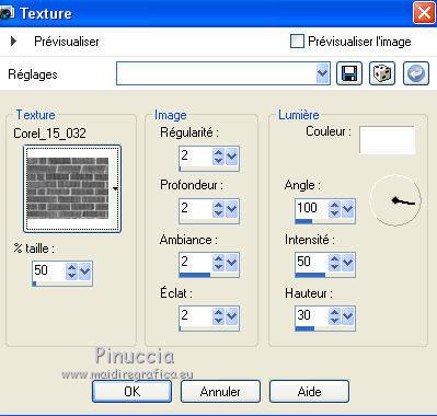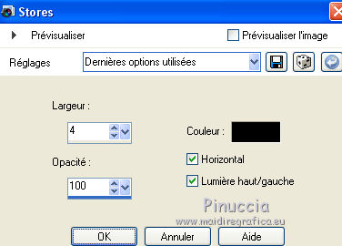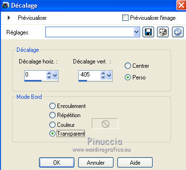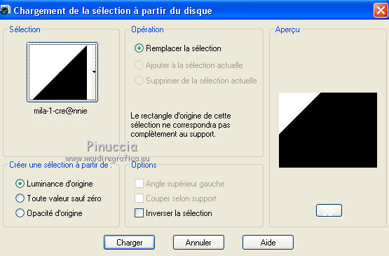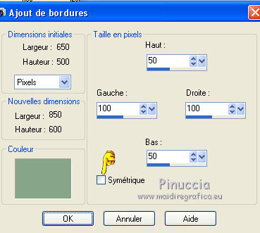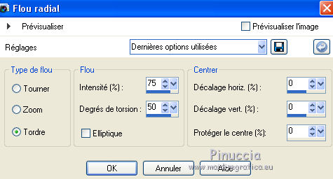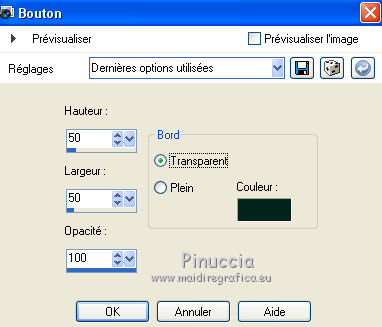 Ce tutoriel a été créé avec CorelX6 et traduit avec CorelX12, mais il peut également être exécuté avec les autres versions. Suivant la version utilisée, vous pouvez obtenir des résultats différents. Depuis la version X4, la fonction Image>Miroir a été remplacée par Image>Renverser horizontalement, et Image>Renverser avec Image>Renverser verticalement. Dans les versions X5 et X6, les fonctions ont été améliorées par la mise à disposition du menu Objets. Avec la nouvelle version X7, nous avons encore Image>Miroir et Image>Renverser/Retourner, mais avec nouvelles différences. Voir les détails à ce sujet ici Certaines dénominations ont changées entre les versions de PSP. Les plus frequentes dénominations utilisées: ![]() Traduction en italien ici Vos versions ici Nécessaire pour réaliser ce tutoriel: Matériel ici Pour le matériel merci Thafs Garder le nom du tube. Le © appartient à l'artiste original. Garder le crédit de ceux qui ont créé le tube. Modules Externes: consulter, si nécessaire, ma section des filtres ici Filters Unlimited 2.0 ici Toadies - What are you ici &<Background Designer IV - @lakeside reflection mmmm (da importare in Unlimited) ici Simple - Centre Tile ici Mehdi - Sorting Tiles ici AAA Frames - Foto Frame ici Filtres Toadies peuvent être utilisés seuls ou importés dans Filters Unlimited. voir comment le faire ici). Si un filtre est fourni avec cette icône, ![]() Placer les sélections dans le dossier Sélections. La texture Corel15_032 est standard dans les versions plus récentes de PSP, et correspond à la texture Mur de briques des versions précédentes. Si vous ne la trouvez pas dans votre PSP, placer la texture fournie dans le dossier Textures. 1. Ouvrir une nouvelle image transparente 650 x 500 pixels. 2. Placer en avant plan la couleur claire #87a689, et en arrière plan la couleur foncée #01241d. ![]() 3. Remplir l'image transparente avec la couleur d'arrière plan.4. Sélections>Sélectionner tout. Activer tube absinthe_fairy_by_ophelias..._thafs, - Édition>Copier. ne pas fermer le tube: on va s'en servir plus tard Revenir sur votre travail et Édition>Coller dans la sélection. Sélections>Désélectionner tout. 5. Réglage>Flou>Flou radial. ![]() 6. Effets>Modules Externes>Mehdi - Sorting Tiles. ![]() 7. Effets>Effets de bords>Accentuer davantage. 8. Calques>Dupliquer. Image>Miroir. Image>Renverser. Réduire l'opacité de ce calque à 50%. Calques>Fusionner>Fusionner le calque de dessous. 9. Sélections>Charger/Enregistrer une sélection>Charger à partir du disque. Chercher et charger la sélection mila-1-cre@nnie. ![]() Sélections>Transformer la sélection en calque. Sélections>Désélectionner tout. 10. Effets>Effets d'image>Décalage. ![]() 11. Effets>Effets 3D>Ombre portée, couleur noire. ![]() 12. Calques>Dupliquer. Image>Miroir. Image>Renverser. Calques>Fusionner>Fusionner le calque de dessous. 13. Calques>Dupliquer. Image>Miroir. Calques>Fusionner>Fusionner le calque de dessous. 14. Effets>Modules Externes>Simple - Centre Tile. Placer le calque en mode Lumière douce. ![]() Calques>Fusionner>Fusionner le calque de dessous. 15. Édition>Copier. 16. Image>Ajouter des bordures, symétrique décoché, couleur d'avant plan. ![]() 17. Effets>Modules Externes>Simple - Centre Tile. 18. Calques>Nouveau calque raster. Remplir avec la couleur d'arrière plan.Réduire l'opacité de ce calque à 50%. 19. Effets>Effets de textures>Stores, couleur noire. ![]() 20. Édition>Coller comme nouveau calque. 21. Effets>Effets 3D>Ombre portée, couleur noire. ![]() 22. Image>Ajouter des bordures, 50 pixels, symétrique, couleur d'avant plan. 23. Effets>Effets 3D>Bouton, couleur d'arrière plan. ![]() 24. Sélections>Sélectionner tout. Image>Ajouter des bordures, 25 pixels, symétrique, couleur d'arrière plan. Sélections>Inverser. 25. Effets>Effets 3D>Bouton, comme précédemment. Sélections>Désélectionner tout. 26. Édition>Copier. 27. Image>Ajouter des bordures, symétrique décoché, couleur d'arrière plan. ![]() 28. Effets>Modules Externes>Toadies - What are you. ![]() Effets>Effets de bords>Accentuer davantage. 29. Effets>Modules Externes>Filters Unlimited 2.0 - &<Background Designers IV> - @Lakeside Reflection mmmm ![]() si vous utilisez autres couleurs, jouer avec les paramètres Red, Green et Blue. Pour la version en bas, par exemple: ![]() 30. Calques>Nouveau calque raster. Activer l'outil Sélection ![]() (peu importe le type de sélection, parce que avec la sélection personnalisée vous obtenez toujours un rectangle), cliquer sur Sélection personnalisée ![]() et setter ces paramètres. ![]() Édition>Coller dans la sélection. Sélections>Désélectionner tout. 31. Activer le tube deco-1-mila-cre@nnie - Édition>Copier. Revenir sur votre travail et Édition>Coller comme nouveau calque. 32. Effets>Effets d'image>Décalage. ![]() Effets>Effets de bords>Accentuer davantage. 33. Calques>Agencer>Déplacer vers le bas. Vous positionner sur le calque du haut de la pile. Calques>Fusionner>Fusionner le calque de dessous. 34. Effets>Effets 3D>Ombre portée, comme précédemment. Édition>Répéter Ombre portée. 35. Activer le tube deco-2-mila-cre@nnie - Édition>Copier. Revenir sur votre travail et Édition>Coller comme nouveau calque. 36. Effets>Effets d'image>Décalage. ![]() Effets>Effets de bords>Eroder. 37. Activer le tube L&K_boom - Édition>Copier. Revenir sur votre travail et Édition>Coller comme nouveau calque. Image>Redimensionner, à 125%, redimensionner tous les calques décoché. 38. Effets>Effets d'image>Décalage. ![]() 39. Calques>Dupliquer. Image>Miroir. Déplacer ce tube en bas.![]() 40. Vous positionner sur le calque du bas de la pile. Sélection personnalisée ![]() ![]() Sélections>Transformer la sélection en calque. Sélections>Désélectionner tout. 41. Effets>Effets de distorsions>Vagues. ![]() 42. Effets>Effets d'image>Décalage. ![]() 43. Effets>Effets 3D>Ombre portée, comme précédemment