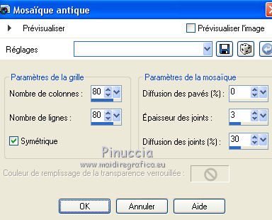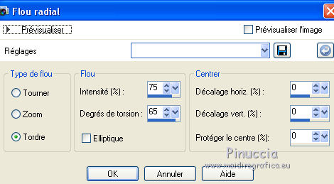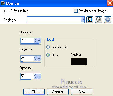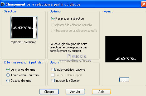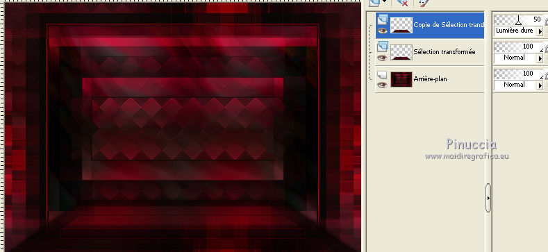 Ce tutoriel a été créé avec CorelX6 et traduit avec CorelX12, mais il peut également être exécuté avec les autres versions. Suivant la version utilisée, vous pouvez obtenir des résultats différents. Depuis la version X4, la fonction Image>Miroir a été remplacée par Image>Renverser horizontalement, et Image>Renverser avec Image>Renverser verticalement. Dans les versions X5 et X6, les fonctions ont été améliorées par la mise à disposition du menu Objets. Avec la nouvelle version X7, nous avons encore Image>Miroir et Image>Renverser/Retourner, mais avec nouvelles différences. Voir les détails à ce sujet ici Certaines dénominations ont changées entre les versions de PSP. Les plus frequentes dénominations utilisées: ![]() Traduction en italien ici Vos versions ici Nécessaire pour réaliser ce tutoriel: Matériel ici Merci pour les tubes Joanie Pour le tube utilisé pour la traduction en français merci K@rine Modules Externes: consulter, si nécessaire, ma section des filtres ici Filters Unlimited 2.0 ici Toadies - What are you ici AP 01 [Innovations] - Lines SilverLining ici Mehdi - Sorting Tiles ici Mehdi - Kaleidoscope 2.1 ici FM Tile Tools - Blend Emboss ici ![]() en fonction des couleurs utilisées, vous pouvez changer le mode mélange et l'opacité des calques. Placer les sélections dans le dossier Sélections. 1. Ouvrir une nouvelle image transparente 650 x 500 pixels. 2. Placer en avant plan la couleur claire #b30005, et en arrière plan la couleur foncée #0b0908. ![]() 3. Remplir l'image transparente avec la couleur d'arrière plan.4. Sélections>Sélectionner tout. Ouvrir le tube Joanie_Woman_30-05-2012 - Édition>Copier. ne pas fermer le tube: on va s'en servir plus tard Revenir sur votre travail et Édition>Coller dans la sélection. Sélections>Désélectionner tout. 5. Effets>Modules Externes>Mehdi - Kaleidoscope 2.1. ![]() 6. Réglage>Flou>Flou radial. ![]() 7. Effets>Effets de distorsion>Coordonnées polaires. ![]() 8. Calques>Dupliquer. Image>Miroir. Image>Renverser. Placer le calque en mode Luminance (héritée). Calques>Fusionner>Fusionner le calque de dessous. 9. Sélections>Sélectionner tout. Sélections>Modifier>Sélectionner les bordures de la sélection. ![]() 10. Remplir la sélection avec la couleur d'arrière plan.Sélections>Désélectionner tout. 11. Calques>Dupliquer. Image>Redimensionner, 75 x 50%, verrouiller les proportions et redimensionner tous les calques décoché. ![]() 12. Calques>Dupliquer. Effets>Modules Externes>Mehdi - Sorting Tiles. ![]() 13. Effets>Modules Externes>Toadies - What are you. ![]() Effets>Effets de bords>Accentuer. 14. Activer l'outil Baguette magique ![]() ![]() cliquer dans la partie transparente pour la sélectionner. ![]() 15. Vous positionner sur le calque du bas de la pile. Sélections>Transformer la sélection en calque. Sélections>Désélectionner tout. 16. Effets>Modules Externes>Toadies - What are you, comme précédemment. Placer le calque en mode Différence. 17. Image>Ajouter des bordures, 2 pixels, symétrique, couleur d'avant plan. 18. Image>Ajouter des bordures, symétrique décoché, couleur d'arrière plan. ![]() 19. Image>Ajouter des bordures, comme précédemment, mais couleur d'avant plan. ![]() 20. Sélectionner le dernier bord avec la baguette magique ![]() Sélections>Inverser. 21. Effets>Effets d'image>Mosaïque sans jointures. ![]() Sélections>Inverser. Sélections>Transformer la sélection en calque. Sélections>Désélectionner tout. 22. Effets>Modules Externes>Toadies - What are you, comme précédemment. Calques>Fusionner>Fusionner le calque de dessous. 23. Sélections>Charger/Enregistrer une sélection>Charger à partir du disque. Chercher et charger la sélection myheart-1-cre@nnie. ![]() Sélections>Transformer la sélection en calque. 24. Effets>Modules Externes>Toadies - What are you, comme précédemment. Sélections>Désélectionner tout. 25. Effets>Effets 3D>Ombre portée, couleur noire. ![]() 26. Calques>Dupliquer. Placer le calque en mode Lumière dure et réduire l'opacité à 50%. ![]() 27. Vous positionner sur le calque du bas de la pile. Calques>Nouveau calque raster. 28. Activer l'outil Sélection ![]() (peu importe le type de sélection, parce que avec la sélection personnalisée vous obtenez toujours un rectangle), cliquer sur Sélection personnalisée ![]() et setter ces paramètres. ![]() Remplir la sélection avec la couleur d'avant plan.Sélections>Désélectionner tout. 29. Effets>Modules Externes>AP 01 [Innovations] - Lines SilverLining. ![]() Placer le calque en mode Assombrir davantage. 30. Calques>Dupliquer. Image>Miroir. Calques>Fusionner>Calques visibles. 31. Sélections>Charger/Enregistrer une sélection>Charger à partir du disque. Chercher et charger la sélection myheart-2-cre@nnie. ![]() 32. Effets>Effets 3D>Bouton, couleur d'arrière plan. ![]() Sélections>Désélectionner tout. 33. Ouvrir le tube takken1, Édition>Copier. Revenir sur votre travail et Édition>Coller comme nouveau calque. Image>Redimensionner, à 75%, redimensionner tous les calques décoché ne pas oublier de cocher Verouiller les proportions. ![]() 34. Effets>Effets d'image>Décalage. ![]() 35. Ouvrir le tube deco-myheart - Édition>Copier. Revenir sur votre travail et Édition>Coller comme nouveau calque. 36. Effets>Effets d'image>Décalage. ![]() Réduire l'opacité de ce calque à 65%. 37. Ouvrir le tube harten. Vous positionner sur le calque raster 2 et Édition>Copier. Revenir sur votre travail et Édition>Coller comme nouveau calque. Image>Redimensionner, à 60%, redimensionner tous les calques décoché. Positionner le coeur sous la branche (voir mon exemple).38. Répéter l'étape 37 avec les autres 3 calques du tube harten. 39. Fermer le calque du bas de la pile. Calques>Fusionner>Calques visibles. Effets>Effets 3D>Ombre portée, comme précédemment. 40. Re-ouvrir le calque du bas de la pile et rester positionné sur le calque du haut. Activer à nouveau le tub