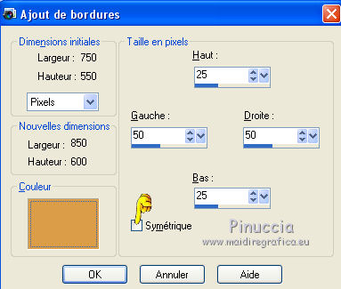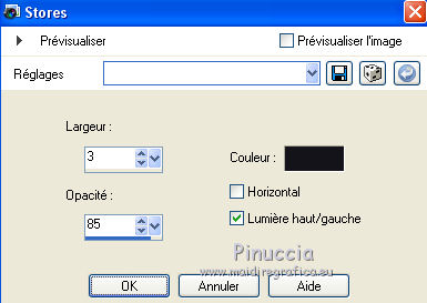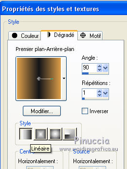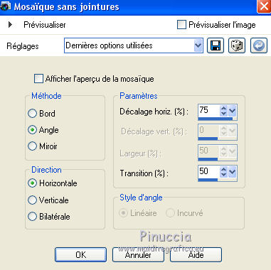 Ce tutoriel a été créé avec CorelX6 et traduit avec CorelX12, mais il peut également être exécuté avec les autres versions. Suivant la version utilisée, vous pouvez obtenir des résultats différents. Depuis la version X4, la fonction Image>Miroir a été remplacée par Image>Renverser horizontalement, et Image>Renverser avec Image>Renverser verticalement. Dans les versions X5 et X6, les fonctions ont été améliorées par la mise à disposition du menu Objets. Avec la nouvelle version X7, nous avons encore Image>Miroir et Image>Renverser/Retourner, mais avec nouvelles différences. Voir les détails à ce sujet ici Certaines dénominations ont changées entre les versions de PSP. Les plus frequentes dénominations utilisées: ![]() Traduction en italien ici Vos versions ici Nécessaire pour réaliser ce tutoriel: Matériel ici Pour le tube merci Maryse Modules Externes: consulter, si nécessaire, ma section des filtres ici Filters Unlimited 2.0 ici Carolaine and Sensibility - CS-LDots ici Flaming Pear - Flood ici Toadies - What are you ici VM Natural - Cross Weave ici Filtres Toadies et VM Natural peuvent être utilisés seuls ou importés dans Filters Unlimited. voir comment le faire ici). Si un filtre est fourni avec cette icône, ![]() en fonction des couleurs utilisées, vous pouvez changer le mode mélange et l'opacité des calques. Dans les plus récentes versions de PSP, vous ne trouvez pas le dégradé d'avant plan/arrière plan ou Corel_06_029. Vous pouvez utiliser le dégradé des versions antérieures. Ici le dossier Dégradés de CorelX. 1. Ouvrir une nouvelle image transparente 650 x 500 pixels. 2. Placer en avant plan la couleur claire #db9d48, et en arrière plan la couleur foncée #14151a. ![]() 3. Préparer en avant plan un dégradé de premier plan/arrière plan, style Linéaire. ![]() Remplir l'image transparente avec la couleur d'arrière plan.4. Calques>Nouveau calque raster. Remplir le calque du dégradé.5. Effets>Modules Externes>VM Natural - Cross Weave. ![]() 6. Calques>Dupliquer. Effets>Effets de textures>Stores, couleur d'arrière plan. ![]() 7. Effets>Effets 3D>Ombre portée, couleur noire. ![]() 8. Vous positionner sur le calque de dessous - Raster 2. ![]() 9. Calques>Fusionner>Fusionner le calque de dessous. 10. Réglage>Flou>Flou gaussien - rayon 35. ![]() 11. Effets>Modules Externes>Carolaine and Sensibility - CS-LDots ![]() 12. Image>Ajouter des bordures, symétrique décoché, couleur d'arrière plan. ![]() 13. Effets>Effets d'image>Mosaïque sans jointures, par défaut. ![]() 14. Calques>Nouveau calque raster. Placer en avant plan la Couleur, et remplir le calque avec la couleur d'avant plan.15. Image>Redimensionner, 50%, redimensionner tous les calques décoché. 16. Image>Rotation libre - 45 degrés à droite. ![]() Placer le calque en mode Lumière douce. 17. Sélections>Sélectionner tout. Image>Ajouter des bordures, symétrique décoché, comme précédemment, couleur d'avant plan. ![]() 18. Effets>Effets d'image>Mosaïque sans jointures, comme précédemment. 19. Sélections>Inverser. Réglage>Flou>Flou gaussien, comme précédemment. 20. Effets>Modules Externes>Toadies - What are you. ![]() Sélections>Désélectionner tout. 21. Effets>Effets d'image>Mosaïque sans jointures. ![]() 22. Calques>Nouveau calque raster. Activer l'outil Sélection ![]() (peu importe le type de sélection, parce que avec la sélection personnalisée vous obtenez toujours un rectangle), cliquer sur Sélection personnalisée ![]() et setter ces paramètres. ![]() Remplir la sélection avec la couleur d'avant plan.23. Ouvrir le tube MR_Nadja, effacer le watermark, et Édition>Copier. ne pas fermer le tube; on va s'en servir plus tard Revenir sur votre travail et Édition>Coller comme nouveau calque. Positionner le tube sur la sélection.![]() 24. Sélections>Inverser. Presser CANC sur le clavier ![]() 25. Sélections>Inverser. Calques>Fusionner>Fusionner le calque de dessous. 26. Calques>Nouveau calque raster. Remplir la sélection avec la couleur d'arrière plan.27. Sélections>Modifier>Contracter - 15 pixels. Presser CANC sur le clavier. 28. Réduire l'opacité de l'outil Pot de peinture à 50, ![]() Remplir la sélection avec la couleur d'arrière plan.ne pas oublier de placer à nouveau l'opacité à 100 28. Effets>Effets de textures>Stores - couleur d'avant plan. ![]() Sélections>Désélectionner tout. 29. Calques>Fusionner>Fusionner le calque de dessous. 30. Calques>Dupliquer. Vous positionner sur le calque de dessous de l'original. 31. Effets>Modules Externes>Toadies - What are you, comme précédemment. Effets>Effets 3D>Ombre portée, comme précédemment. 32. Vous positionner sur le calque du haut de la pile. Édition>Répéter Ombre portée. 33. Calques>Fusionner>Fusionner le calque de dessous. Calques>Dupliquer. 34. Effets>Effets d'image>Mosaïque sans jointures. ![]() 35. Calques>Fusionner>Calques visibles. 36. Édition>Copier. 37. Image>Ajouter des bordures, symétrique décoché, comme précédemment. ![]() 38. Effets>Modules Externes>Toadies - What are you, comme précédemment. Effets>Effets de bords>Accentuer davantage. 39. Édition>Coller comme nouveau calque. Image>Redimensionner, à 80%, redimensionner tous les calques décoché. 40. Vous positionner sur le calque du bas de la pile. Effets>Modules Externes>Flaming Pear - Flood. ![]() 41. Vous positionner sur le calque du haut de la pile. Effets>Modules Externes>Flaming Pear - Flood, comme précédemment. 42. Effets>Effets 3D>Ombre portée, comme précédemment. 43. Calques>Dupliquer. Effets>Effets de distorsion>Bombage. ![]() 44. Image>Miroir. Calques>Agencer>Déplacer vers le bas. 45. Ouvrir le tube chain, Édition>Copier. Revenir sur votre travail et Édition>Coller comme nouveau calque. 46. Effets>Effets d'image>Décalage. ![]() 47. Effets>Effets 3D>Ombre portée, comme précédemment. Placer le calque en mode Lumière dure. 48. Calques>Dupliquer. Image>Miroir. 49. Image>Ajouter des bor