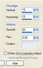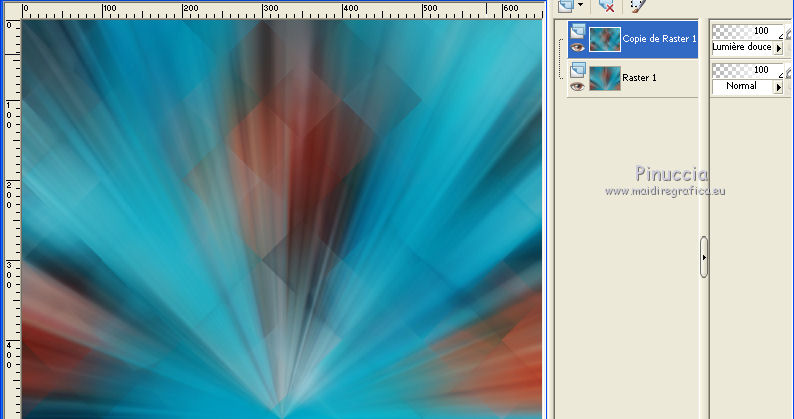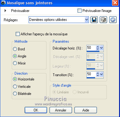 Ce tutoriel a été créé avec CorelX6 et traduit avec CorelX12, mais il peut également être exécuté avec les autres versions. Suivant la version utilisée, vous pouvez obtenir des résultats différents. Depuis la version X4, la fonction Image>Miroir a été remplacée par Image>Renverser horizontalement, et Image>Renverser avec Image>Renverser verticalement. Dans les versions X5 et X6, les fonctions ont été améliorées par la mise à disposition du menu Objets. Avec la nouvelle version X7, nous avons encore Image>Miroir et Image>Renverser/Retourner, mais avec nouvelles différences. Voir les détails à ce sujet ici Certaines dénominations ont changées entre les versions de PSP. Les plus frequentes dénominations utilisées: ![]() Traduction en italien ici Vos versions ici Nécessaire pour réaliser ce tutoriel: Matériel ici Pour le tube merci Maryse Modules Externes: consulter, si nécessaire, ma section des filtres ici Filters Unlimited 2.0 ici Carolaine and Sensibility - CS-LDots ici Mehdi - Sorting Tiles ici Simple - Blintz ici Simple - Left Right Wrap (bonus) ici Toadies - What are you ici Filtres Simple et Toadies peuvent être utilisés seuls ou importés dans Filters Unlimited. voir comment le faire ici). Si un filtre est fourni avec cette icône, ![]() en fonction des couleurs utilisées, vous pouvez changer le mode mélange et l'opacité des calques. Placer les sélections dans le dossier Sélections. 1. Ouvrir une nouvelle image transparente 650 x 500 pixels. 2. Placer en avant plan la couleur claire #e8ecf6, et en arrière plan la couleur foncée #0499b6. ![]() 3. Remplir l'image transparente avec la couleur d'arrière plan.4. Calques>Nouveau calque raster. Sélections>Sélectionner tout. Activer le tube MR_Wella. Sélectionner le watermark avec l'outil Sélection ![]() ![]() Sélections>Inverser. Édition>Copier, et minimiser le tube, pour l'utiliser plus tard. Revenir sur votre travail et Édition>Coller dans la sélection. Sélections>Désélectionner tout. 5. Effets>Effets d'image>Mosaïque sans jointures, par défaut. ![]() 6. Réglage>Flou>Flou radial. ![]() 7. Calques>Fusionner>Fusionner le calque de dessous. 8. Calques>Dupliquer. Effets>Modules Externes>Mehdi - Sorting Tiles. ![]() 9. Placer le calque en mode Lumière douce. ![]() 10. Effets>Effets de bords>Accentuer davantage. Calques>Fusionner>Fusionner le calque de dessous. 11. Effets>Modules Externes>Simple - Blintz. 12. Sélections>Charger/Enregistrer une sélection>Charger à partir du disque. Chercher et charger la sélection olivia-1-cre@nnie. ![]() Sélections>Transformer la sélection en calque. 13. Effets>Effets 3D>Ombre portée, couleur noire. ![]() Sélections>Désélectionner tout. 14. Effets>Modules Externes>Simple - Blintz. 15. Calques>Dupliquer. Image>Miroir. Image>Renverser. 16. Sélections>Sélectionner tout. Image>Ajouter des bordures, symmétrique décoché, couleur d'avant plan. ![]() 17. Édition>Copier. 18. Sélections>Inverser. Édition>Coller dans la sélection. 19. Image>Renverser. 20. Effets>Effets 3D>Ombre portée, comme précédemment. Sélections>Désélectionner tout. 21. Effets>Effets d'image>Mosaïque sans jointures, comme précédemment. 22. Calques>Nouveau calque raster. Activer l'outil Sélection ![]() (peu importe le type de sélection, parce que avec la sélection personnalisée vous obtenez toujours un rectangle), cliquer sur Sélection personnalisée ![]() et setter ces paramètres. ![]() 23. Remplir la sélection avec la couleur d'avant plan.Sélections>Désélectionner tout. 24. Effets>Modules Externes>Toadies - What are you. ![]() 25. Effets>Effets géométriques>Inclinaision. ![]() 26. Calques>Dupliquer. Image>Miroir. Calques>Fusionner>Fusionner le calque de dessous. 27. Image>Renverser. Effets>Modules Externes>Simple - Left Right Wrap. 28. Calques>Dupliquer. Image>Renverser. Calques>Fusionner>Fusionner le calque de dessous. 29. Placer le calque en mode Lumière douce. ![]() 30. Image>Ajouter des bordures, symmétrique décoché, couleur d'avant plan. ![]() 31. Effets>Effets d'image>Mosaïque sans jointures. ![]() 32. Activer l'outil Baguette magique ![]() ![]() et cliquer sur le bords en haut et en bas pour les sélectionner. 33. Effets>Modules Externes>Toadies - What are you. ![]() 34. Effets>Effets 3D>Ombre portée, couleur noire. ![]() 35. Sélections>Charger/Enregistrer une sélection>Charger à partir du disque. Chercher et charger la sélection olivia-2-cre@nnie. ![]() 36. Calques>Nouveau calque raster. Activer l'outil Zoom pour agrandir la sélection ou utiliser la route de la souris.pour voir mieux la partie à sélectionner, et remplir avec la couleur d'avant plan.![]() Sélections>Désélectionner tout. 37. Calques>Dupliquer. Image>Rotation libre - 90 degrés à gauche. ![]() 38. Effets>Effets d'image>Décalage. ![]() 39. Activer le tube deco-1-olivia, Édition>Copier. Revenir sur votre travail et Édition>Coller comme nouveau calque. 40. Effets>Effets d'image>Décalage. ![]() 41. Calques>Fusionner>Fusionner le calque de dessous. Édition>Répéter Fusionner le calque de dessous. 42. Effets>Effets 3D>Ombre portée, couleur d'avant plan. ![]() 43. Vous positionner sur le calque du bas de la pile. Sélection personnalisée ![]() ![]() 44. Effets>Effets géométriques>Perspective verticale. ![]() 45. Sélections>Transformer la sélection en calque. 46. Réglage>Flou>Flou gaussien - rayon 10. ![]() 47. Effets>Modules Externes>Carolaine and Sensibility - CS-LDots. ![]() 48. Effets>Effets 3D>Ombre portée, couleur noire. ![]() 49. Calques>Agencer>Placer en haut de la pile. 50. À nouveau vous positionner sur le calque du bas de la pile. Sélection personnalisée ![]() ![]() 51. Réglage>Flou>Flou gaussien - rayon 10. 52. Effets>Modules Externes>Carolaine and Sensibility - CS-LDots, comme précédemment. 53. Sélections>Modifier la sélection et la zone sélectionnée deviendra rouge. ![]() Image>Miroir. et la zone rouge se déplacera à droite. ![]() Séle